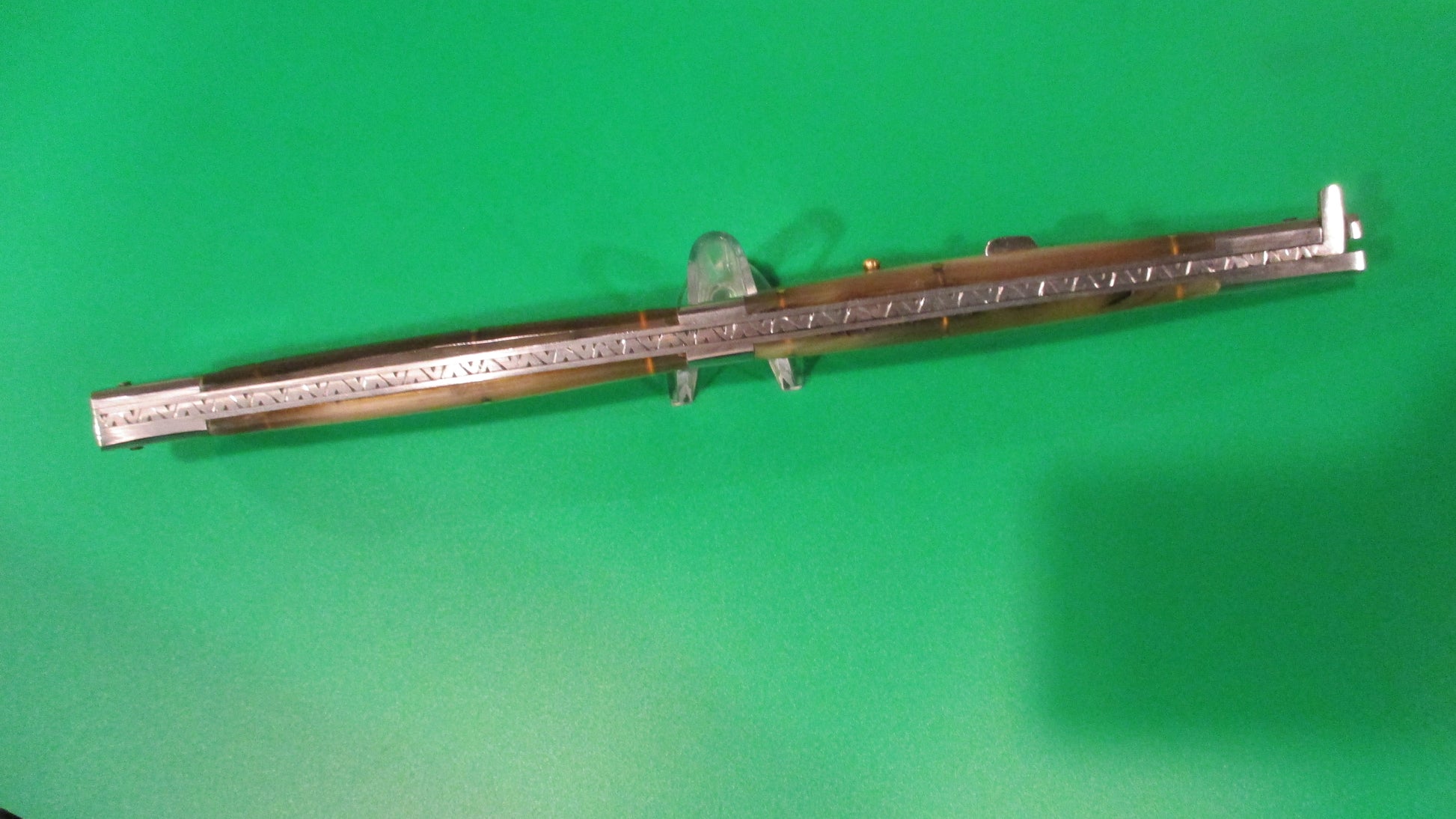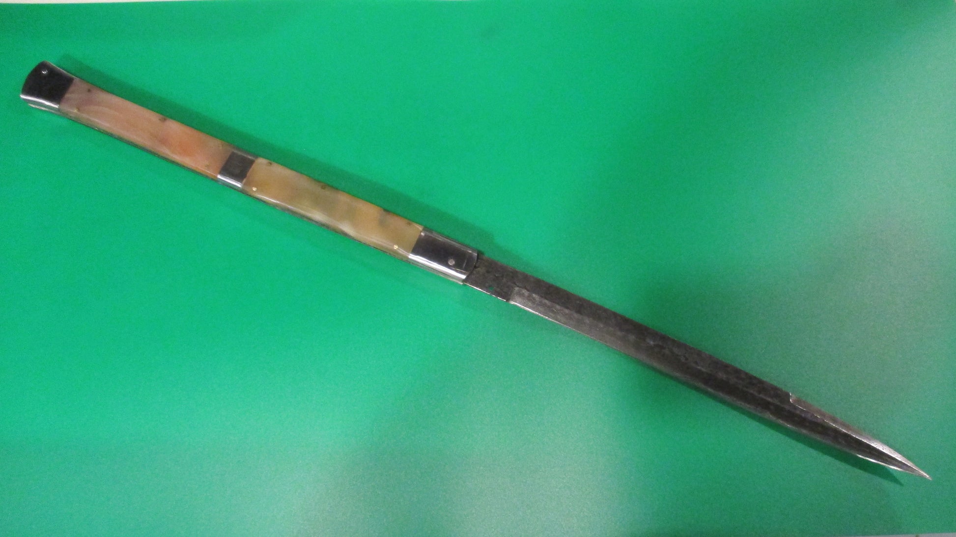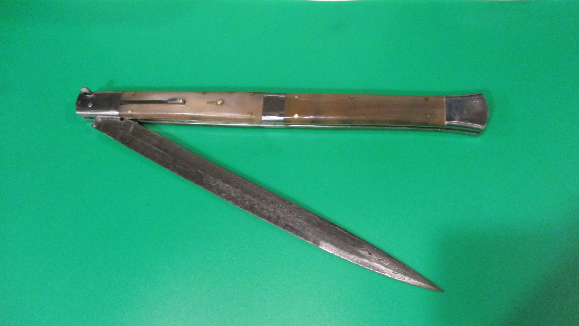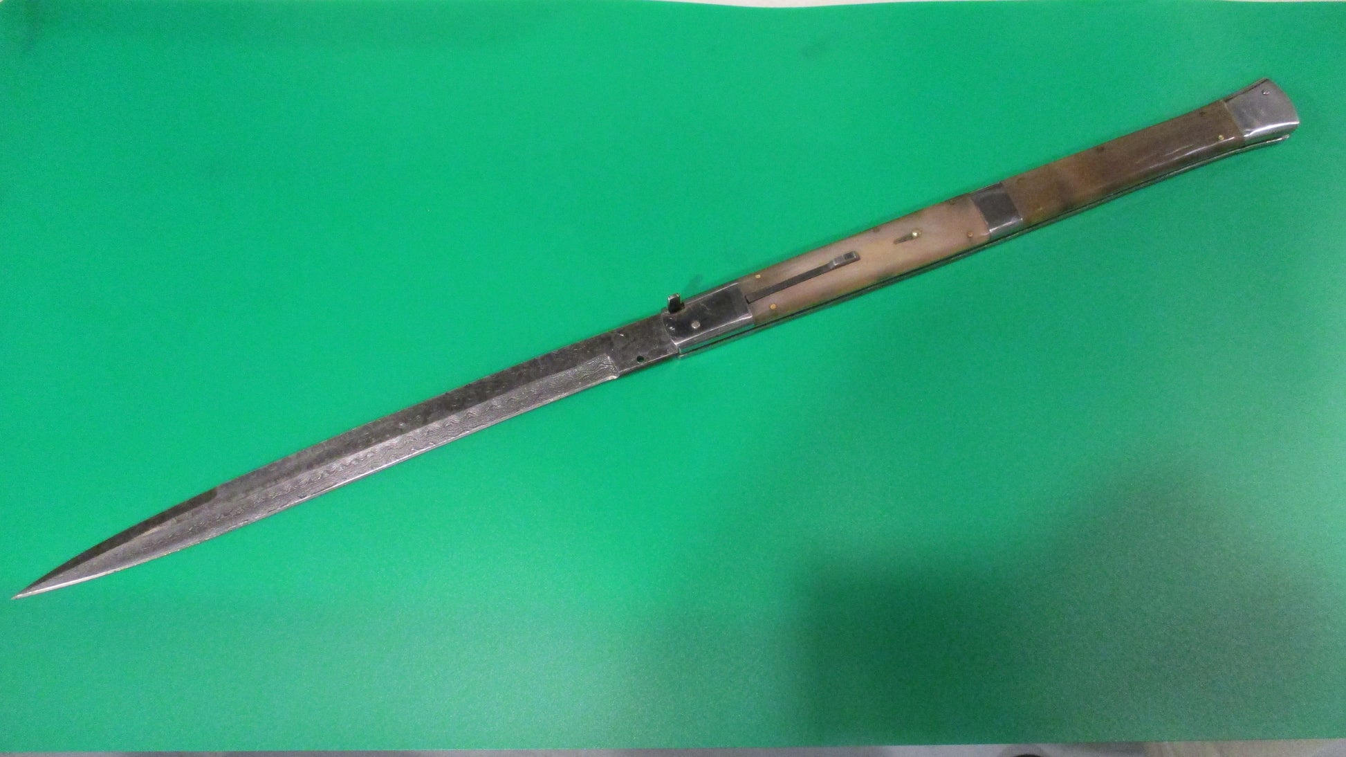 Custom 61cm Italian Prioletta inspired Monster Damascus & Horn Automatic knife by Samir Ahmad. This knife measures a whopping 61.2cm (24 1/8 inches) open and weighs in at 580 grams (1.2 pounds)! It has steel liners bolsters and rectangular button and a brass fixed (non moving) faux safety. The 12 inch Damascus bayonet style blade is 100% full and has original SHARP edge. Really gorgeous hand made Damascus. The light horn scales are very attractive and in great condition. The knife functions perfectly with the blade tip deep and centered, opens fully with a lout "THWACK" and locks up tight! This knife is an EXPERIENCE to open and fun to Play with!! It really is a MONSTER! Made by master cutler Samir Ahmad. New condition.