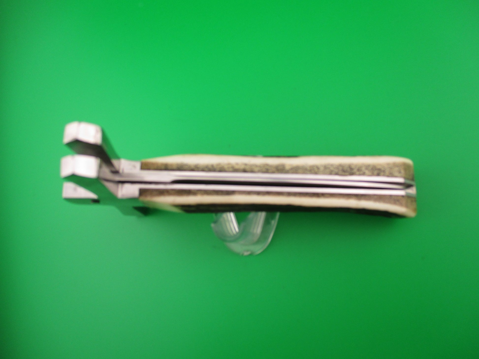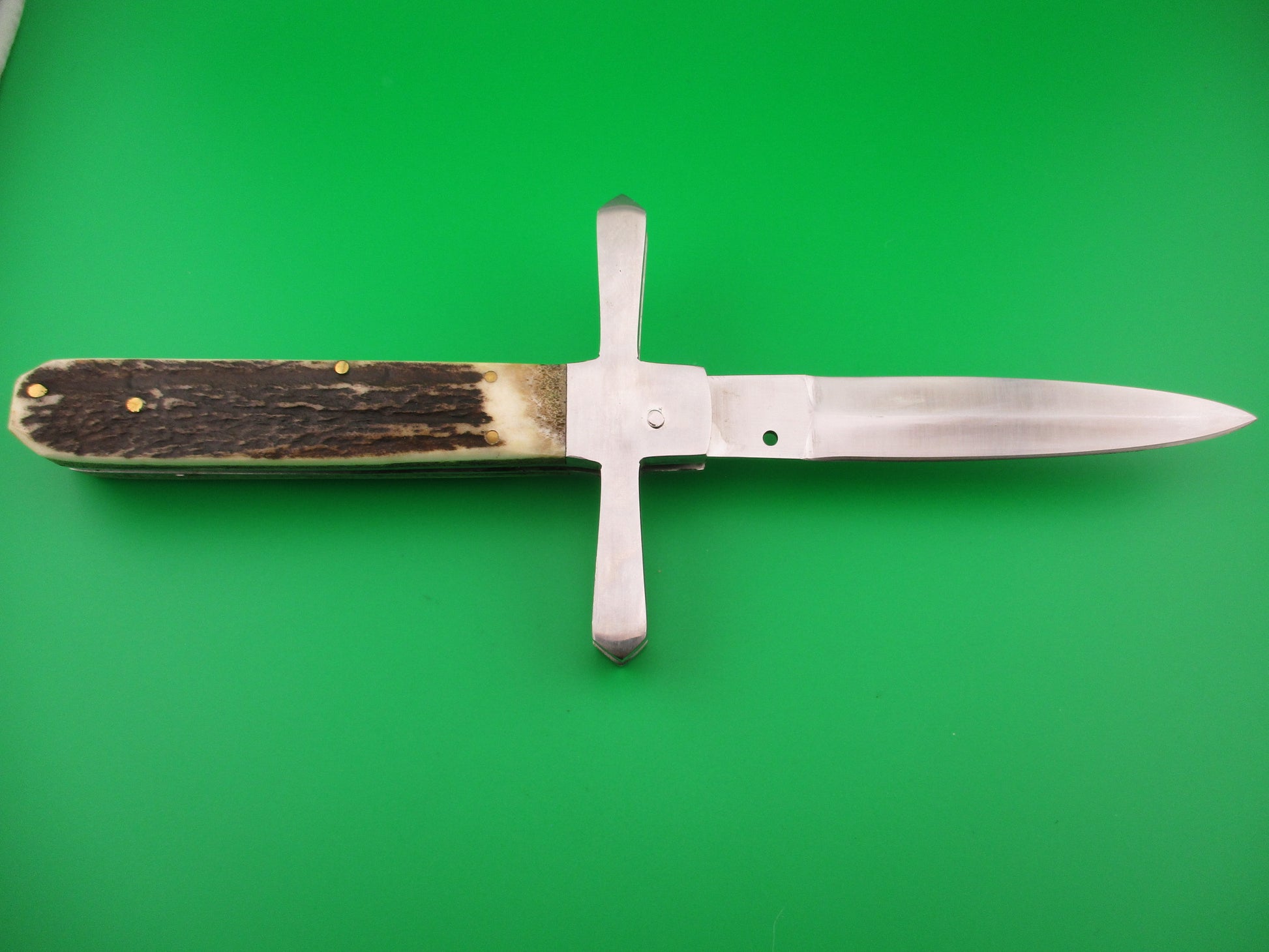 Custom Cross Guard 26cm Hand made Dagger blade Stag Oval button automatic knife with custom file work. This Unique and beautiful switchblade was made by a second generation cutler named Samir Ahmad. It measures 26.1cm (10 5/16 inches) open and 5 11/16 inches closed with steel liners, bolsters & button. The dagger grind blade is 100% full with original finish and no identifying marks. The genuine Stag handles (scales) are very attractive and in great condition. The knife works great with blade tip below liners closed, strong snap and tight lockup open. To close the blade you lift up on the tab sticking out near the top (front) of the knife to release the blade to be closed. Like new condition.