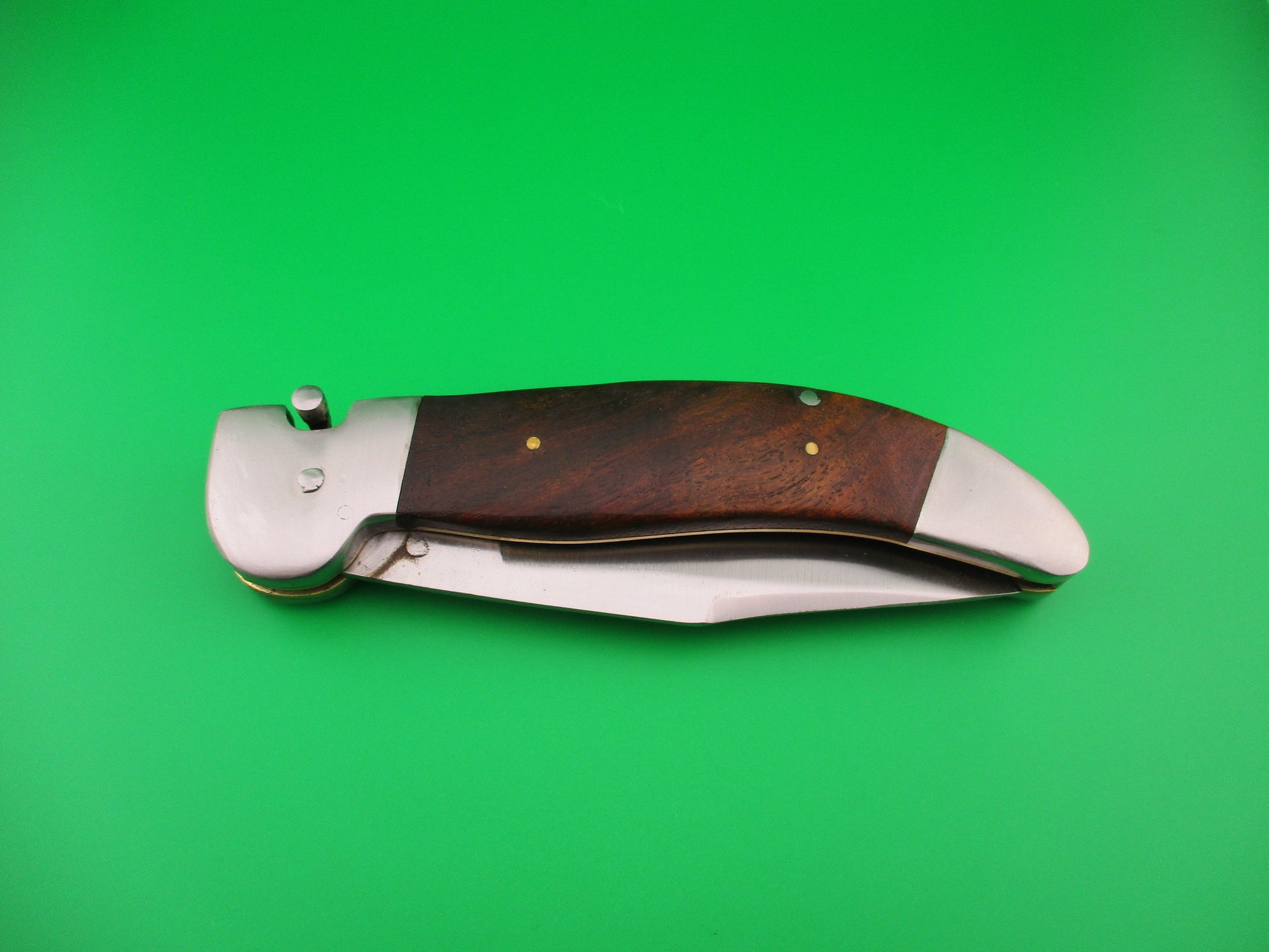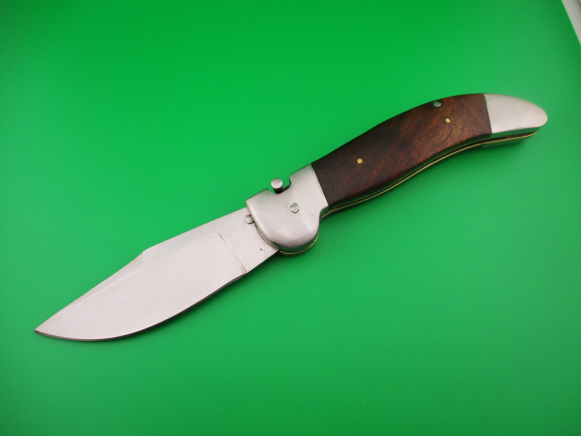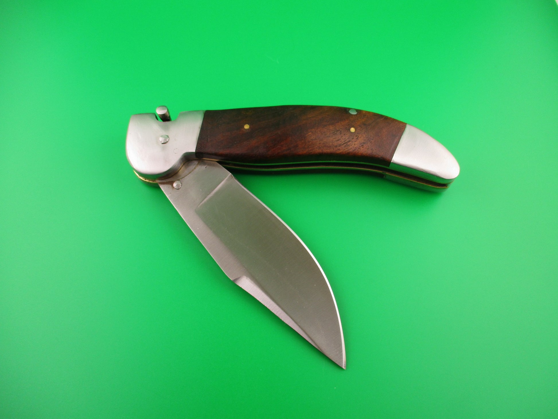 Custom KABAR GRIZZLY Inspired 11 inch automatic knife with wood scales by Samir Ahmad, a second generation knife maker. This knife was inspired by the Ka-bar large Grizzly knife made in the USA between 1920 and 1950 and was constructed as a "test knife" before making another, more refined version. Therefore it doesn't have the top notch fit and finish that Samir's knives usually have, but it definitely has it's own special charm and works well. I thought someone would enjoy having it. The knife measures 10 11/16 inches open and 6 3/8 inches closed with steel liners, bolsters & button. The hollow ground saber clip blade is a nice full profile with a satin finish and no markings. The scales (handles) are dark wood and in very good condition. The knife works well with blade tip even with the liners closed, good snap and good lockup with some movement each way at the tip. Rattles if shaken with blade open. Again, not typical work by Samir, but it was only a rough prototype. Very COOL for what it is. EX condition.