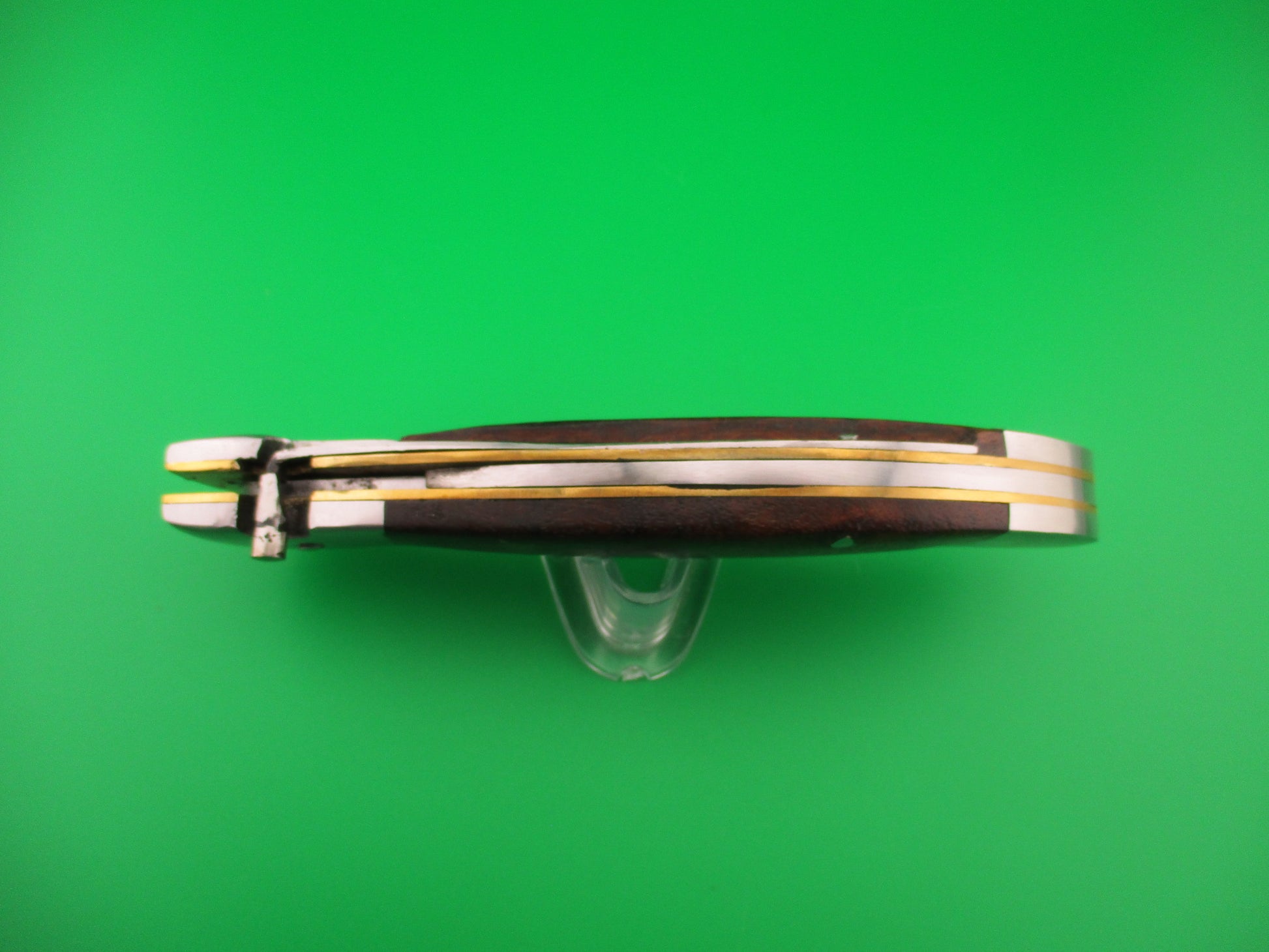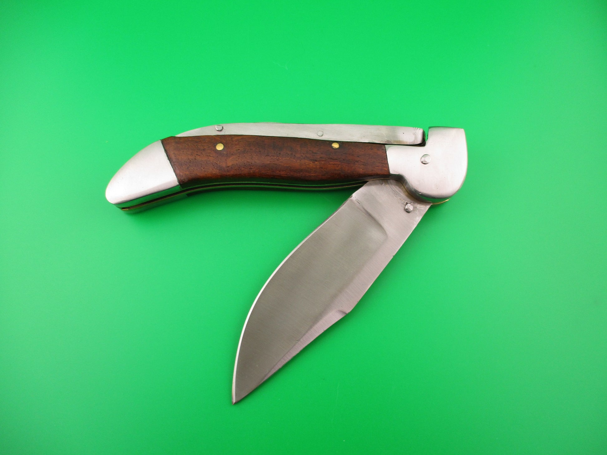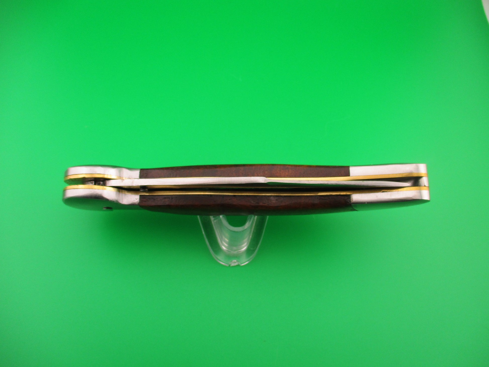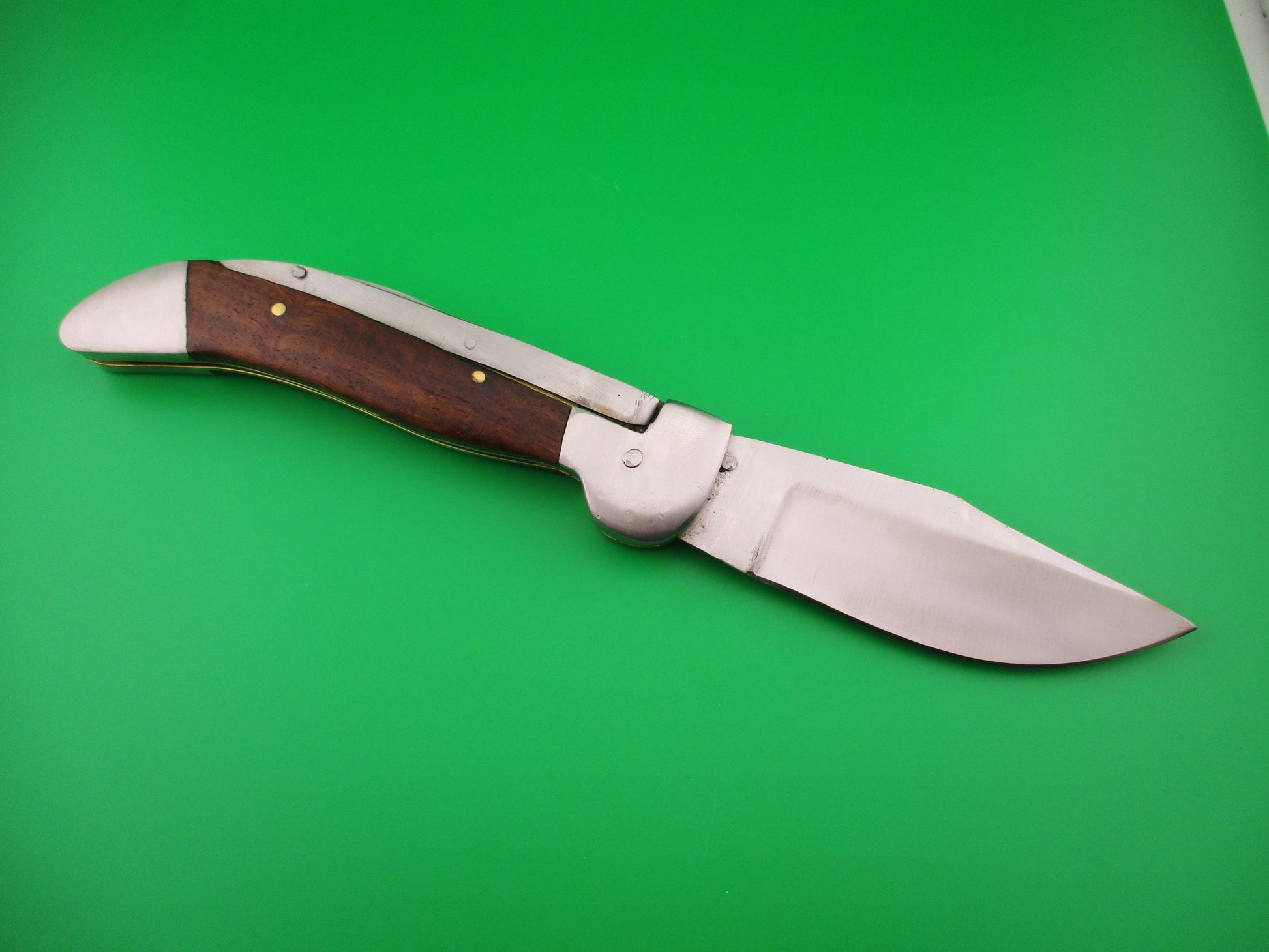 Custom KABAR GRIZZLY Inspired 11 inch automatic knife with wood scales by Samir Ahmad, a second generation knife maker. This knife was inspired by the Ka-bar large Grizzly knife made in the USA between 1920 and 1950 and was constructed as a "test knife" before making another, more refined version. Therefore it doesn't have the top notch fit and finish that Samir's knives usually have, but it definitely has it's own special charm and works well. I thought someone would enjoy having it. The knife measures 10 11/16 inches open and 6 3/8 inches closed with steel liners, bolsters & button. The hollow ground saber clip blade is a nice full profile with a satin finish and no markings. The scales (handles) are dark wood and in very good condition. The knife works well with blade tip even with the liners closed, good snap and good lockup with some movement each way at the tip. Rattles if shaken with blade open. Again, not typical work by Samir, but it was only a rough prototype. Very COOL for what it is. EX condition.