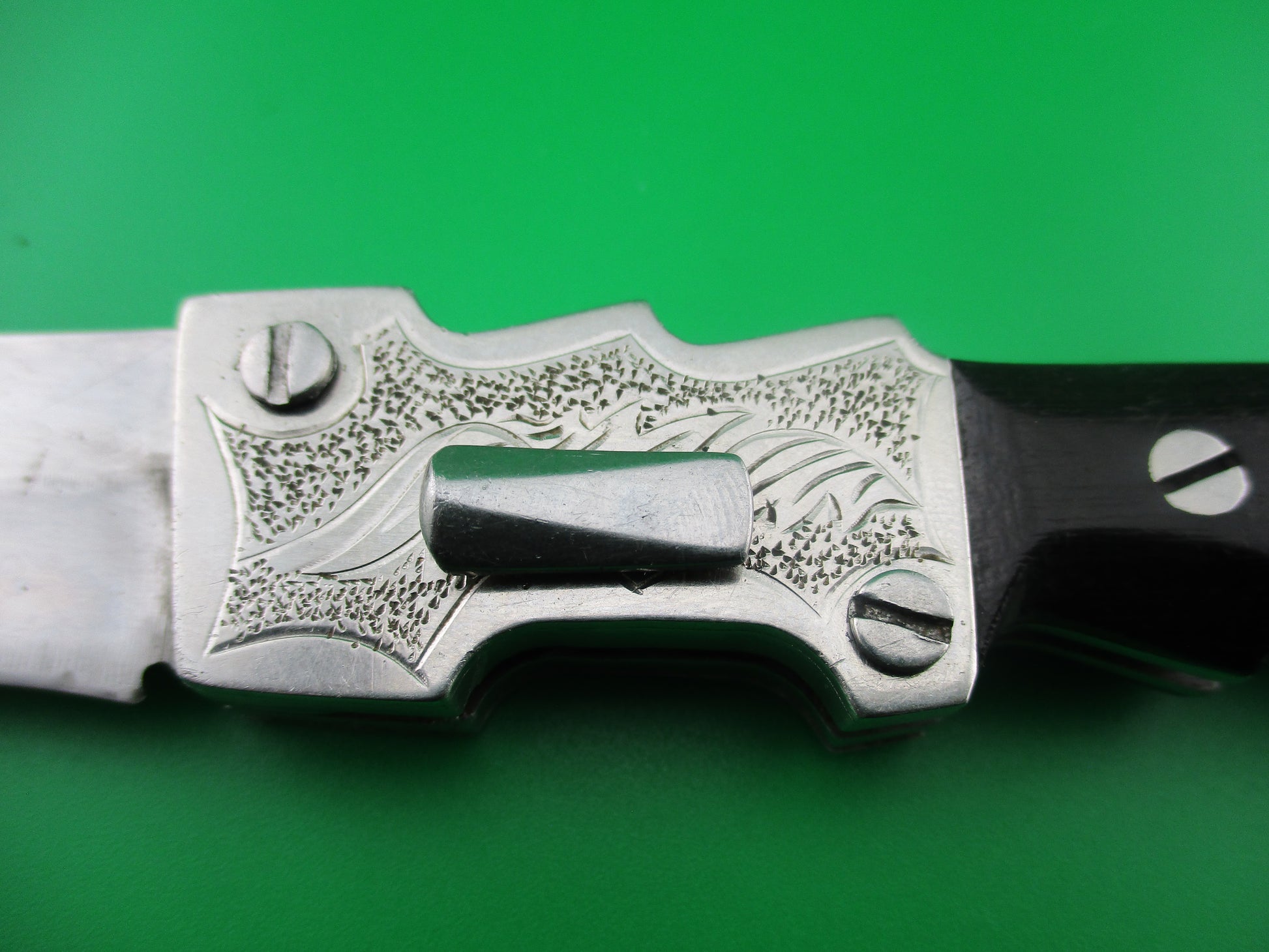 Nice little Russian RPK (Russian Prison Knife) with gunstock shaped handle. It measures 4 inches closed and 7 inches open. Thick aluminum frame with ebony wood scales. Nice engraving on the front (aluminum) part of the frame. Sliding button release and saber grind blade. Works great with tip seating deep when closed.