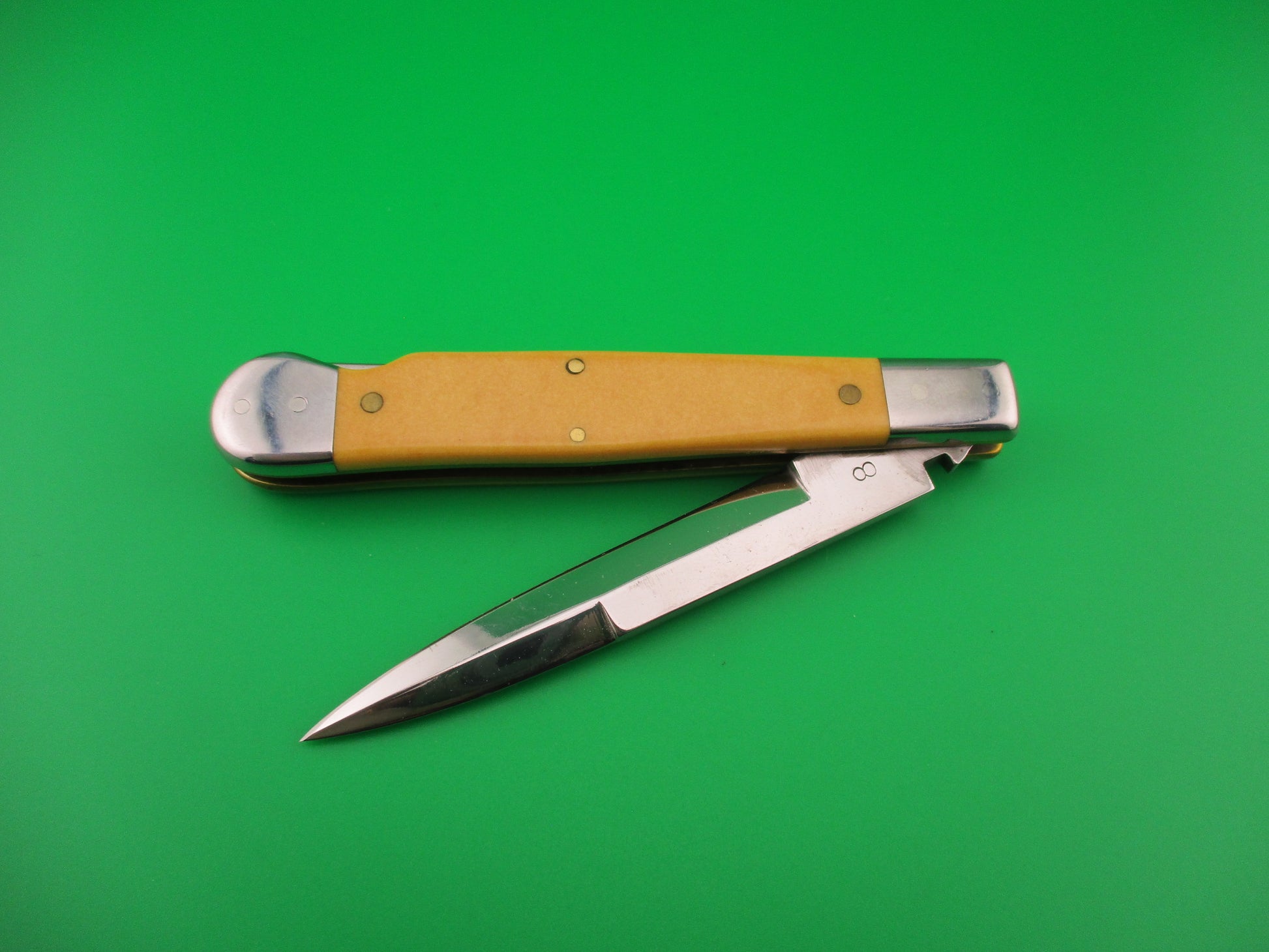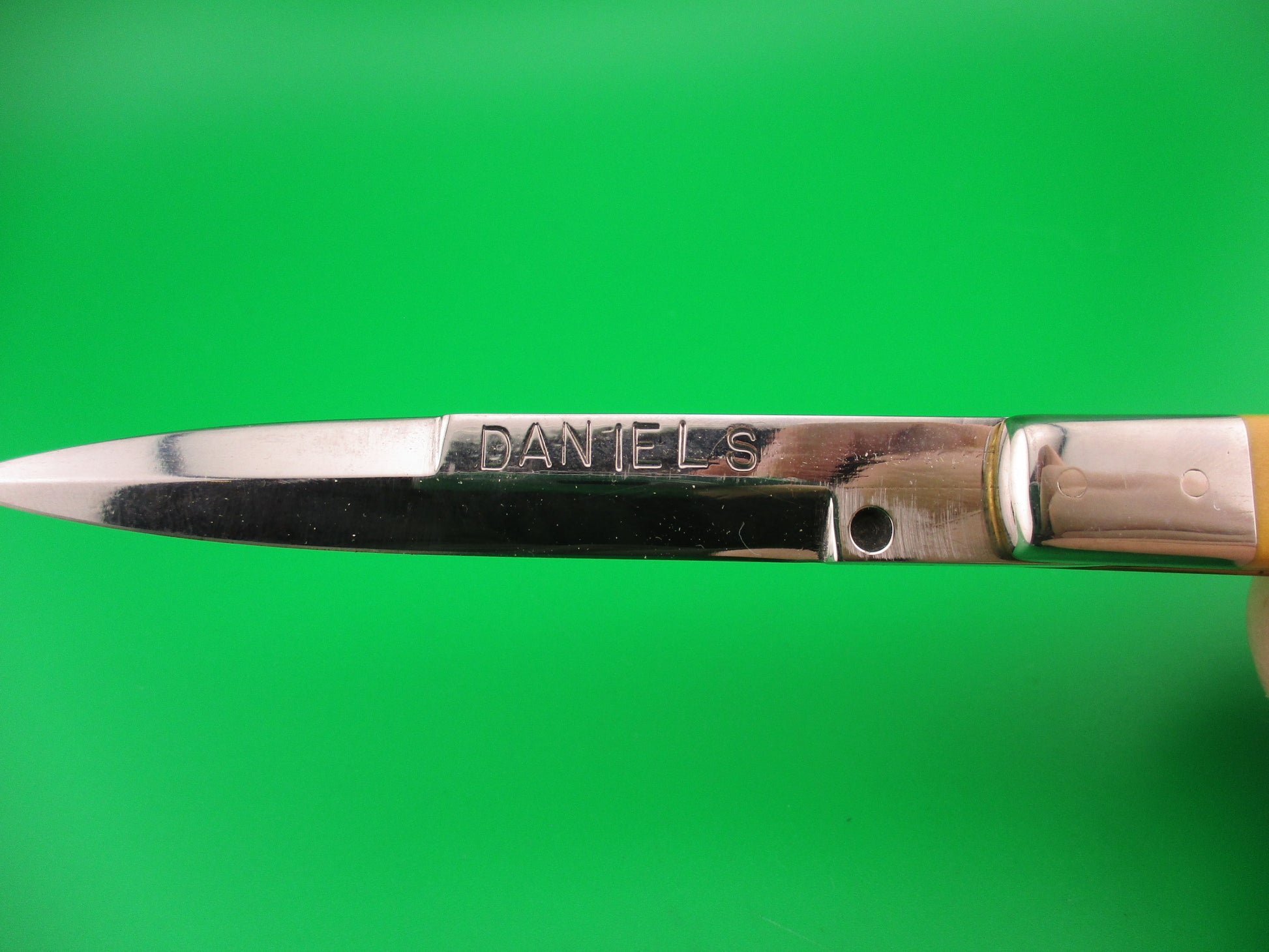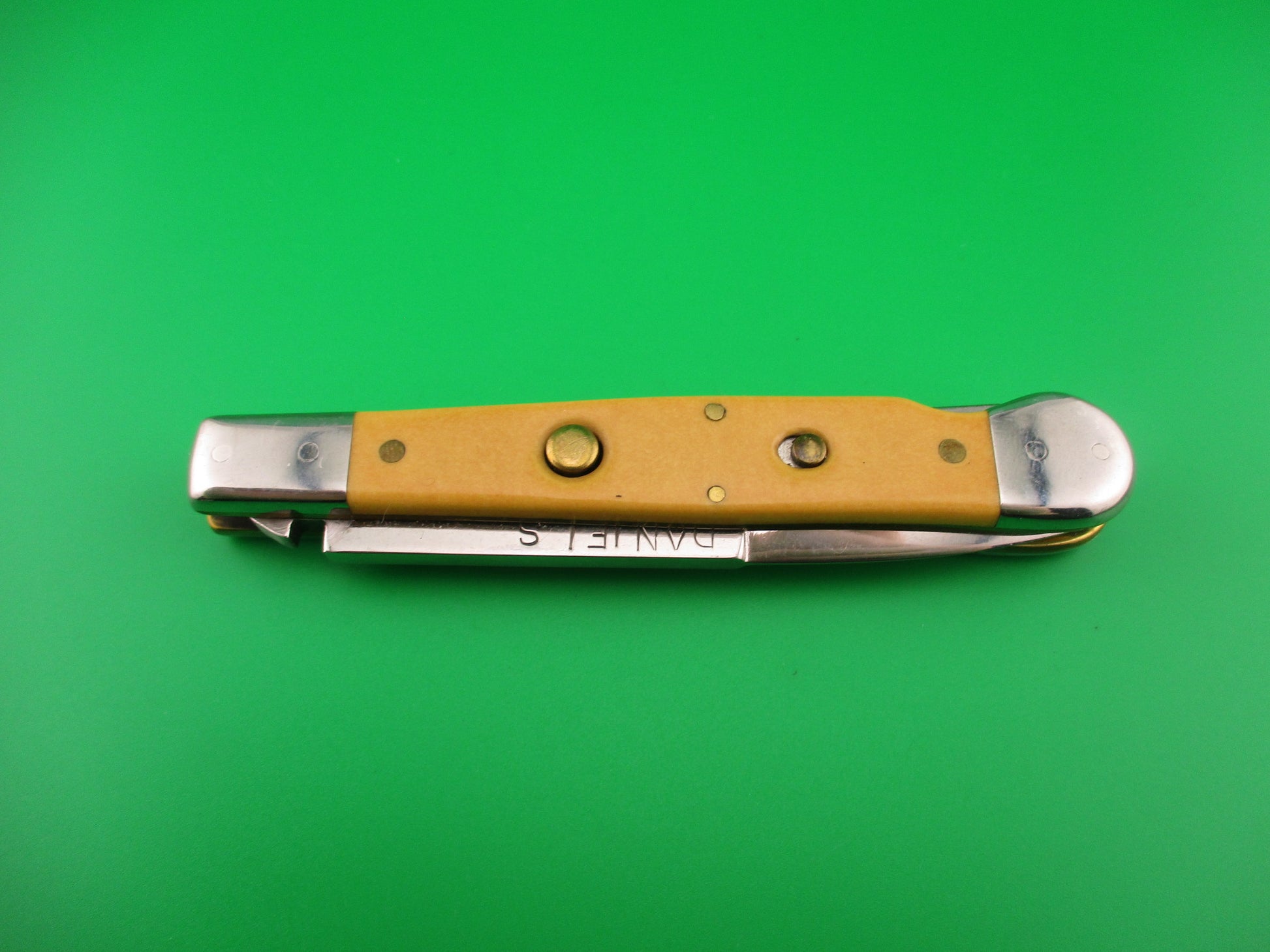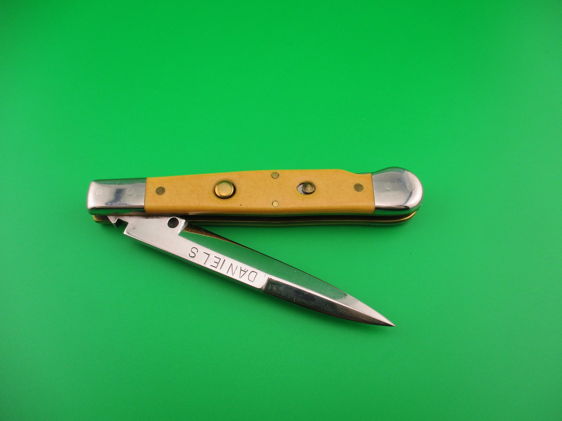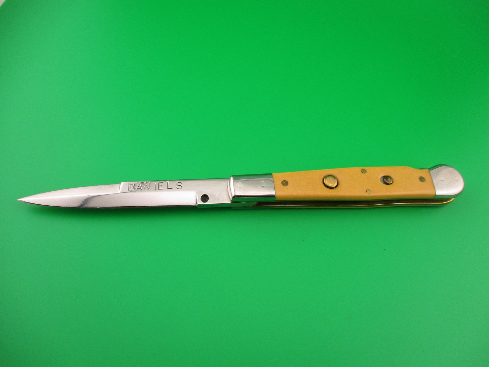DANIELS 8 Custom Lockback Automatic Hand Made Jack with round button and yellow micarta scales. This custom switchblade measures a hair over 8 inches open and 4.5 inches closed with thick brass liners, button, safety & pins. The bayonet style blade appears to be 100% full and is stamped DANIELS on the face on the front and 8 on the back of the tang. The yellow smooth scales appear to be micarta, but not sure. The knife works well with blade tip centered and below the liners closed, good snap and very good lockup open with just a hint of movement at the tip. Does not rattle if shaken with blade open. EX+ condition.