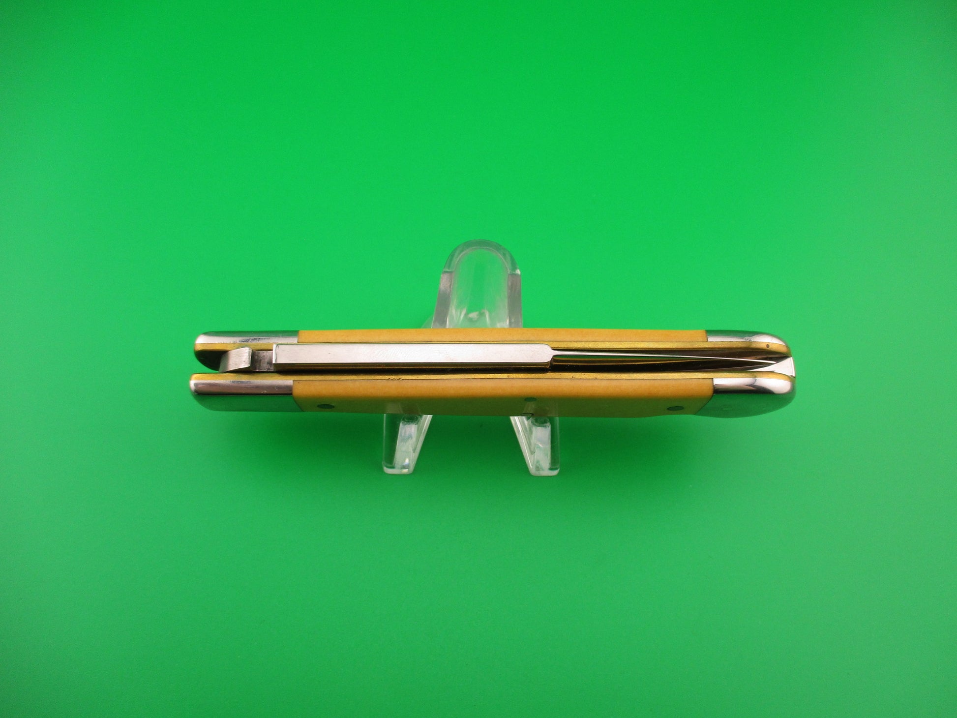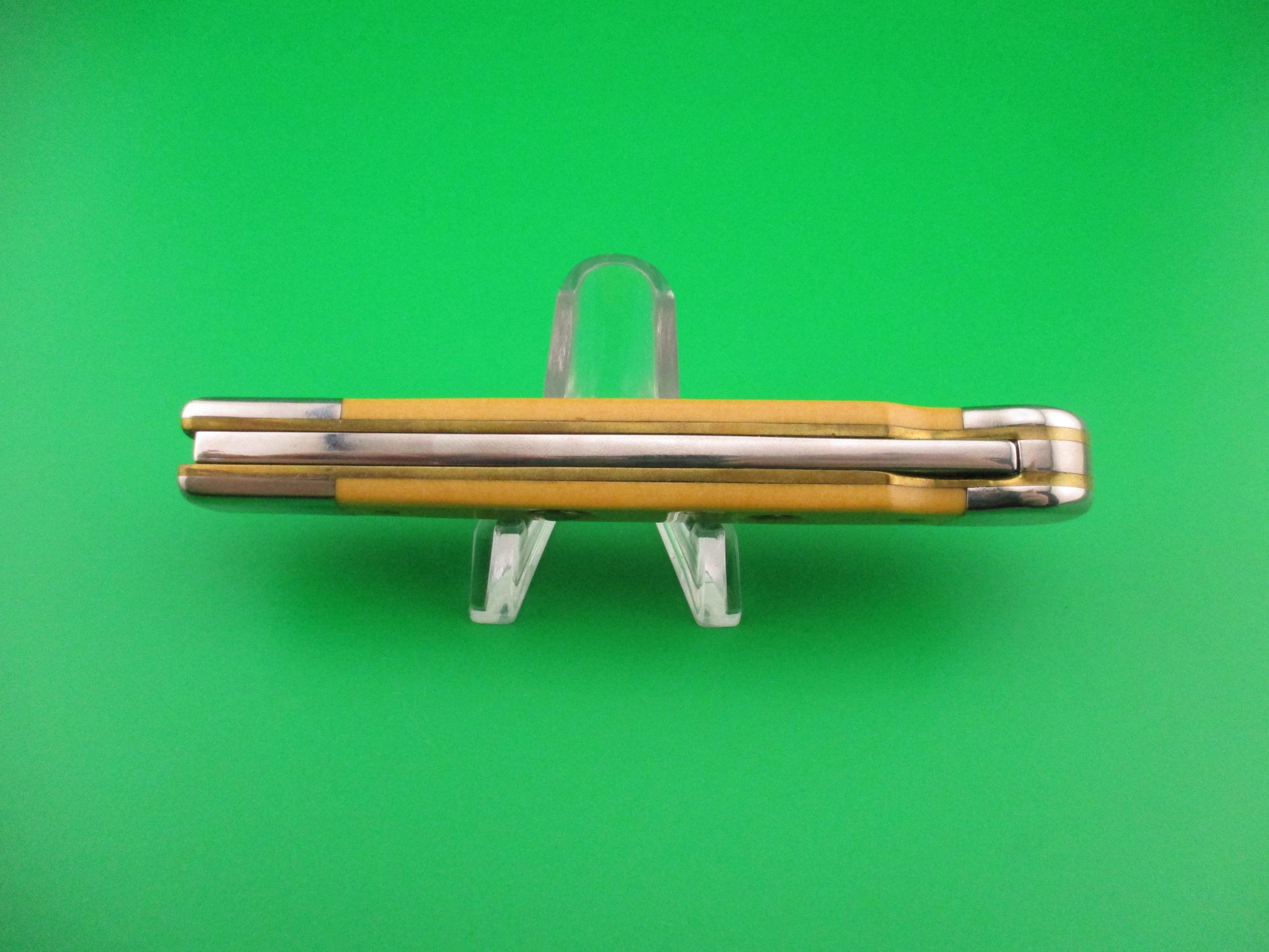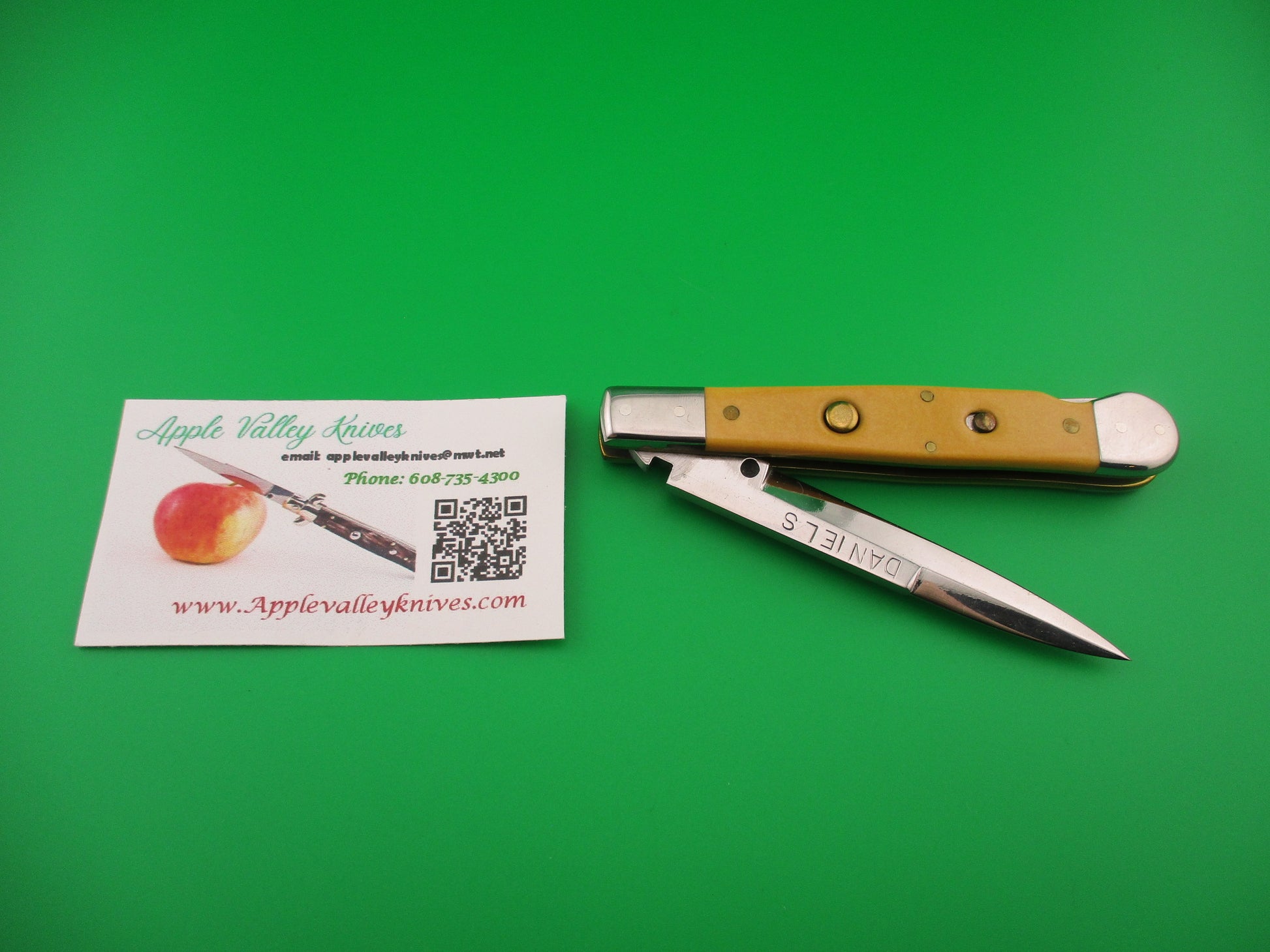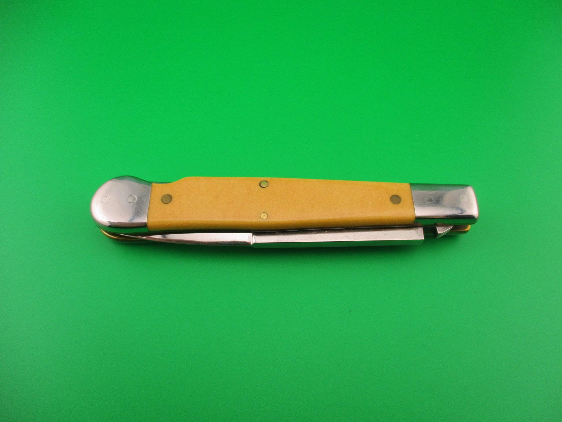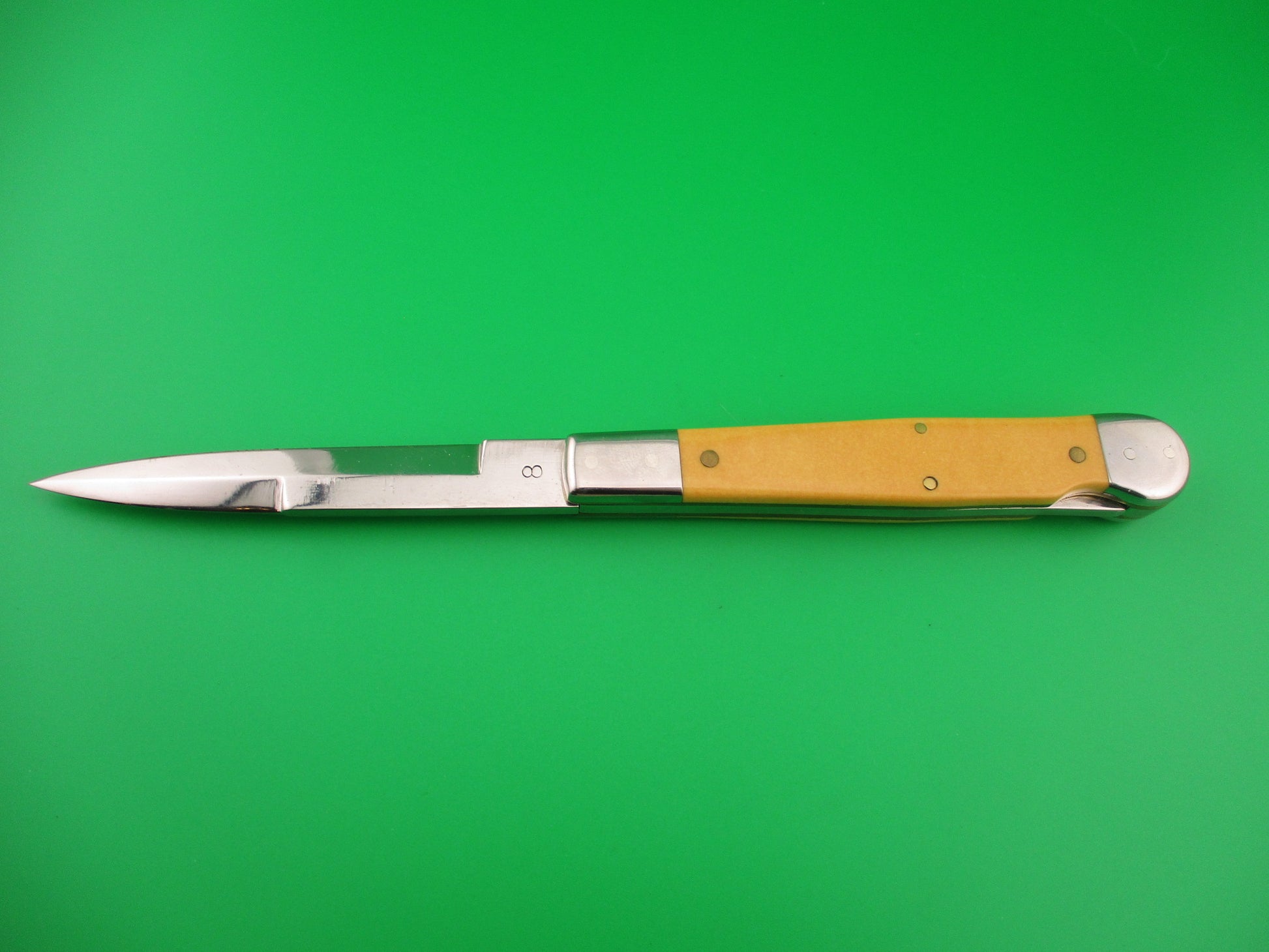 DANIELS 8 Custom Lockback Automatic Hand Made Jack with round button and yellow micarta scales. This custom switchblade measures a hair over 8 inches open and 4.5 inches closed with thick brass liners, button, safety & pins. The bayonet style blade appears to be 100% full and is stamped DANIELS on the face on the front and 8 on the back of the tang. The yellow smooth scales appear to be micarta, but not sure. The knife works well with blade tip centered and below the liners closed, good snap and very good lockup open with just a hint of movement at the tip. Does not rattle if shaken with blade open. EX+ condition.