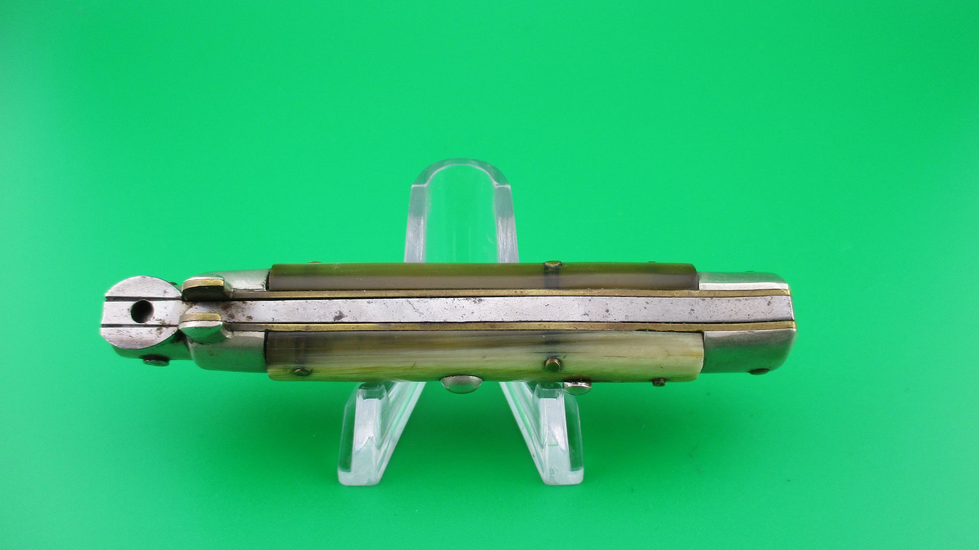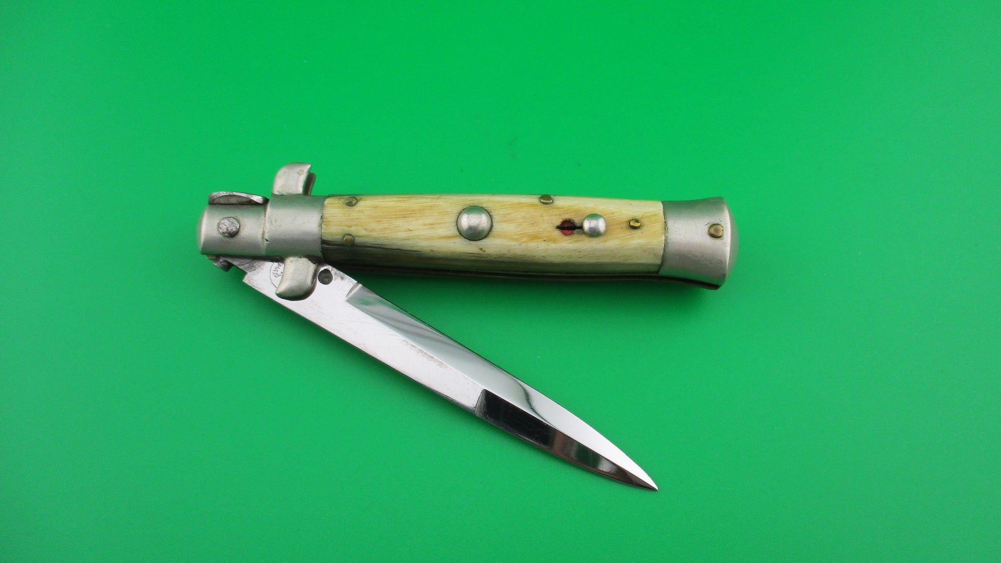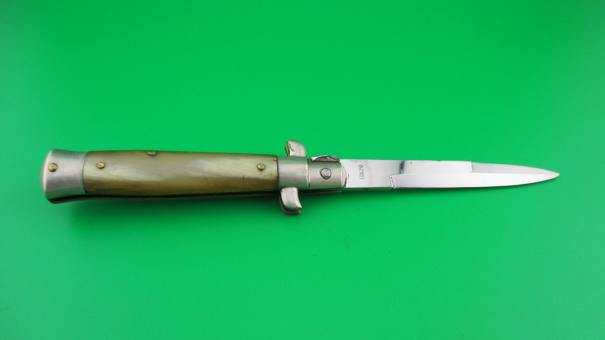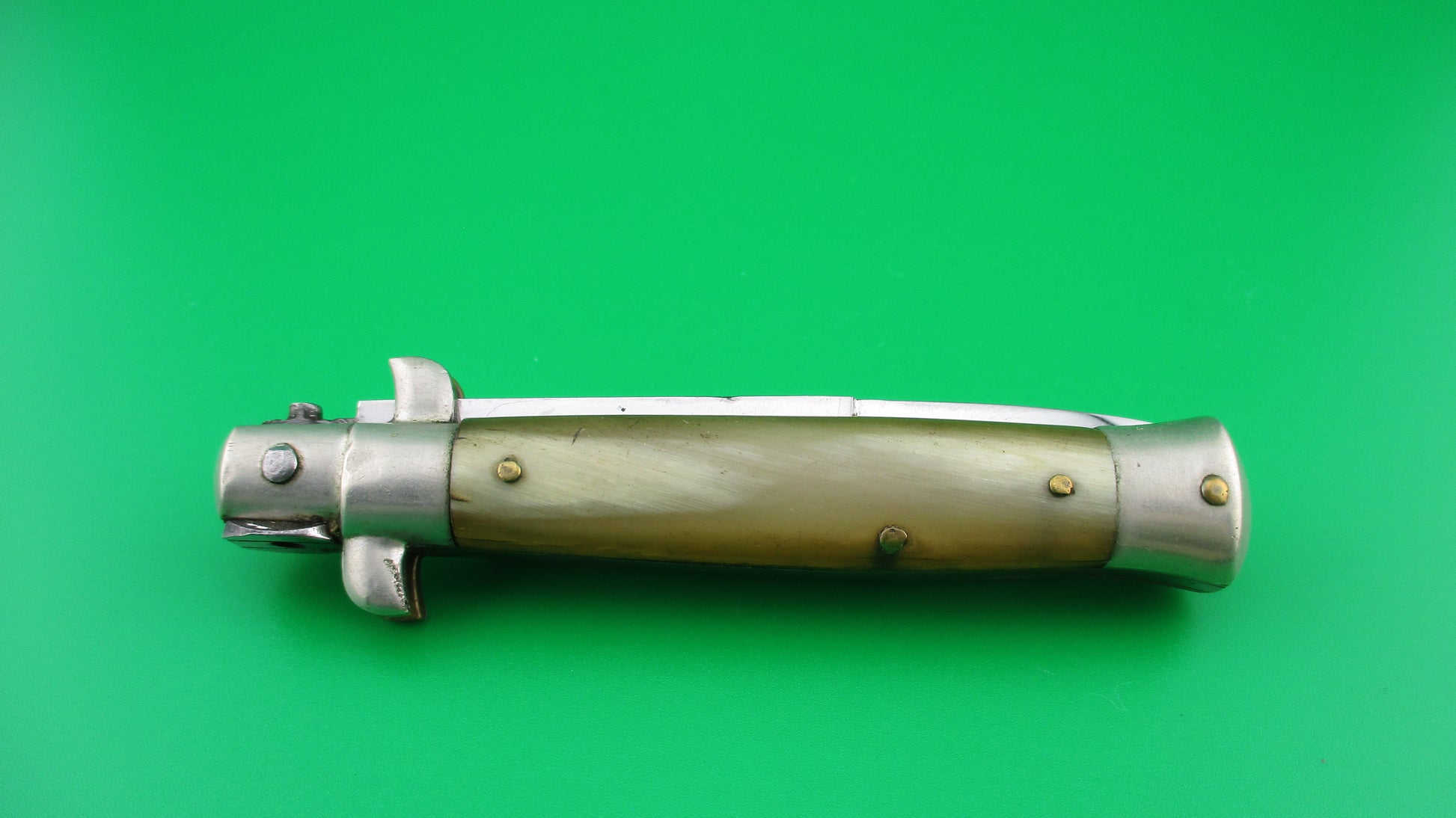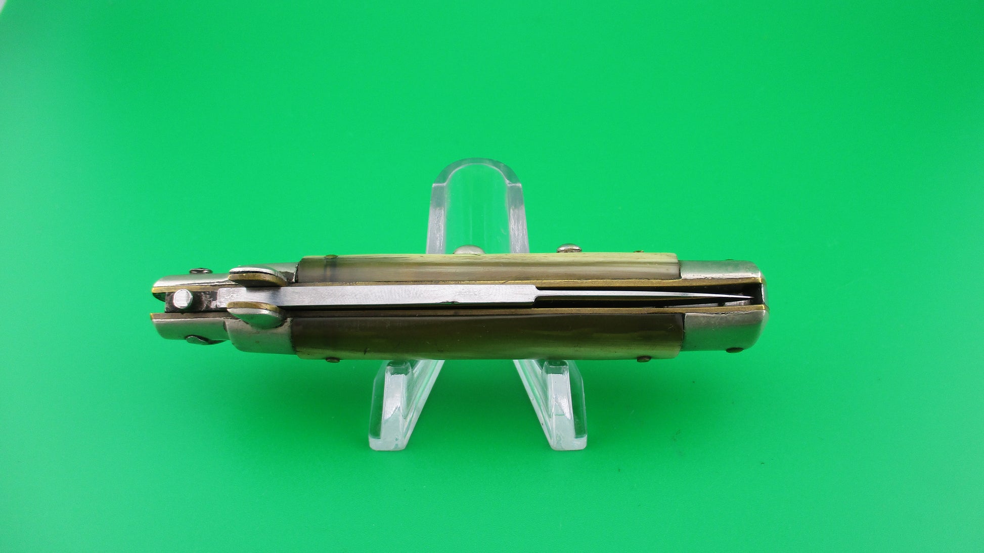 Vintage DEMAY 18cm Picklock Italian 1950s vintage automatic knife measures 18cm (7 1/16 inches) open with D stamped brass liners and pins and nickel silver bolsters, button and safety. The bayonet style blade is full with original factory finish and is stamped DEMAY inside a circle with picture of a man swinging a big hammer over his head and an anvil on the ricasso and INOXID on the backside. The horn scales are very attractive with colors of translucent yellow white & cream streaks. The knife works great with the blade tip deep and centered closed, strong snap and tight lockup. This knife has a smaller profile button than most 18cm knives which makes it look more "to scale" with larger Italian stilettos. Does not rattle if shaken open. Safety works. EX+ condition.