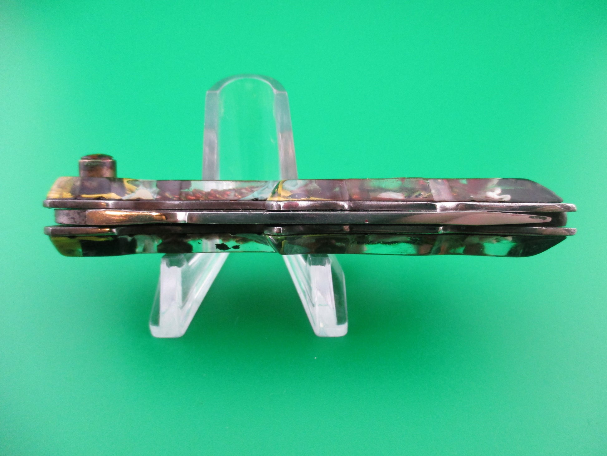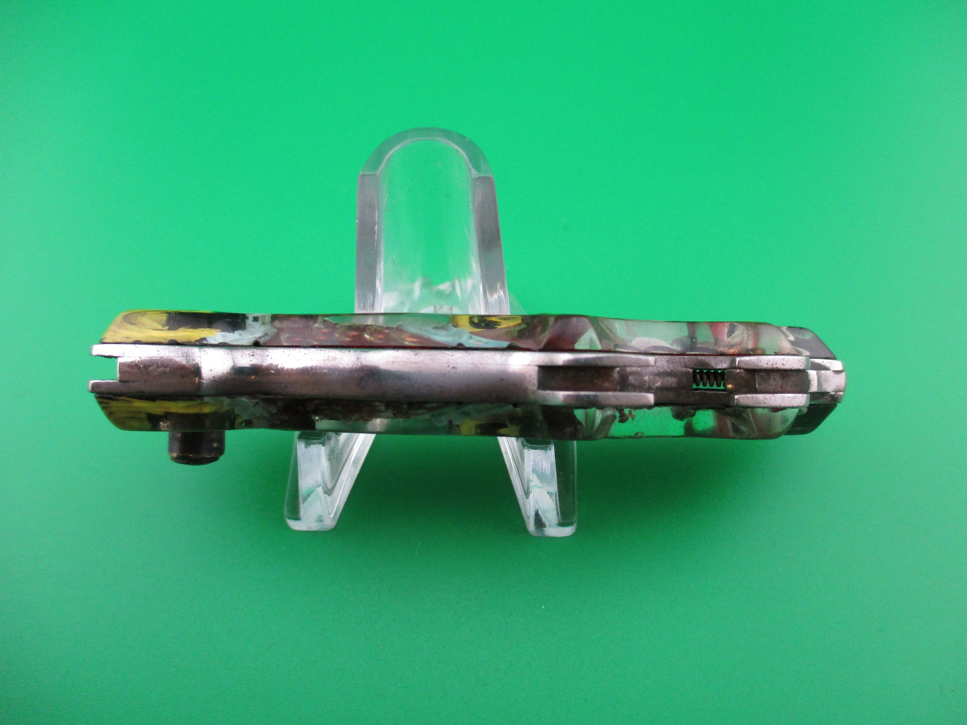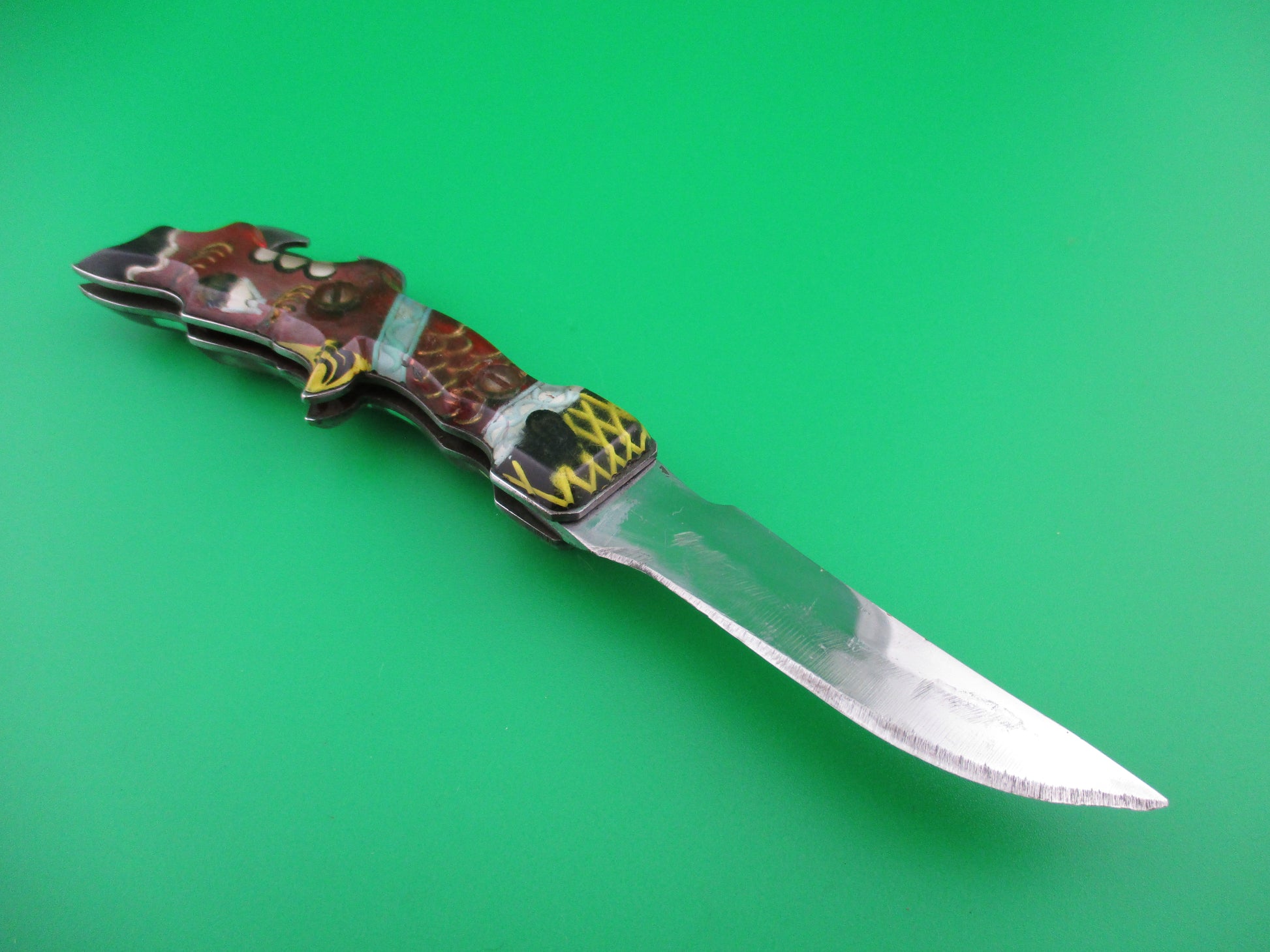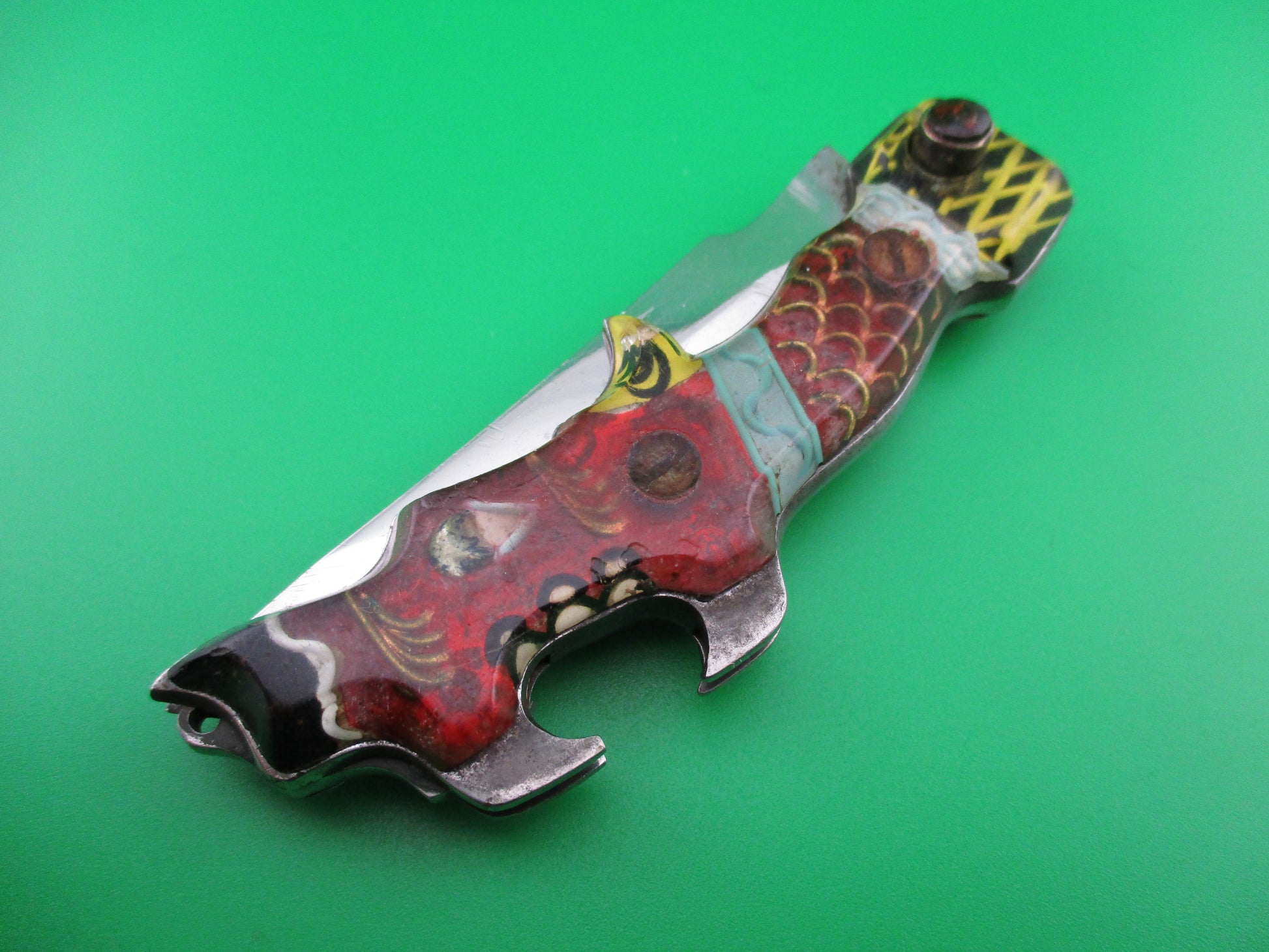 Vintage Russian RPK (Russian Prison Knife) switchblade. These knives were made by inmates of Russian prisons back in the 1960s and 70s to be sold to raise capital for the prisons. They were all hand made and very unique and beautiful pieces of Russian cutlery Folk Art. This knife measures 15cm (6 inches) open with steel liners and carbon steel blade. I believe the blade to be nearly full and it has been sharpened poorly. It is shaped to represent a dragon and the teeth serve as bottle openers. Very colorful hand painted liners covered with clear acrylic. The knife works well with the blade tip seating deep in the well when closed, smooth snap and average lockup when open with a little movement each way at the tip. Has a hole on the end to attach a ring for keychain. Very cool vintage Russian RPK Dragon switchblade.