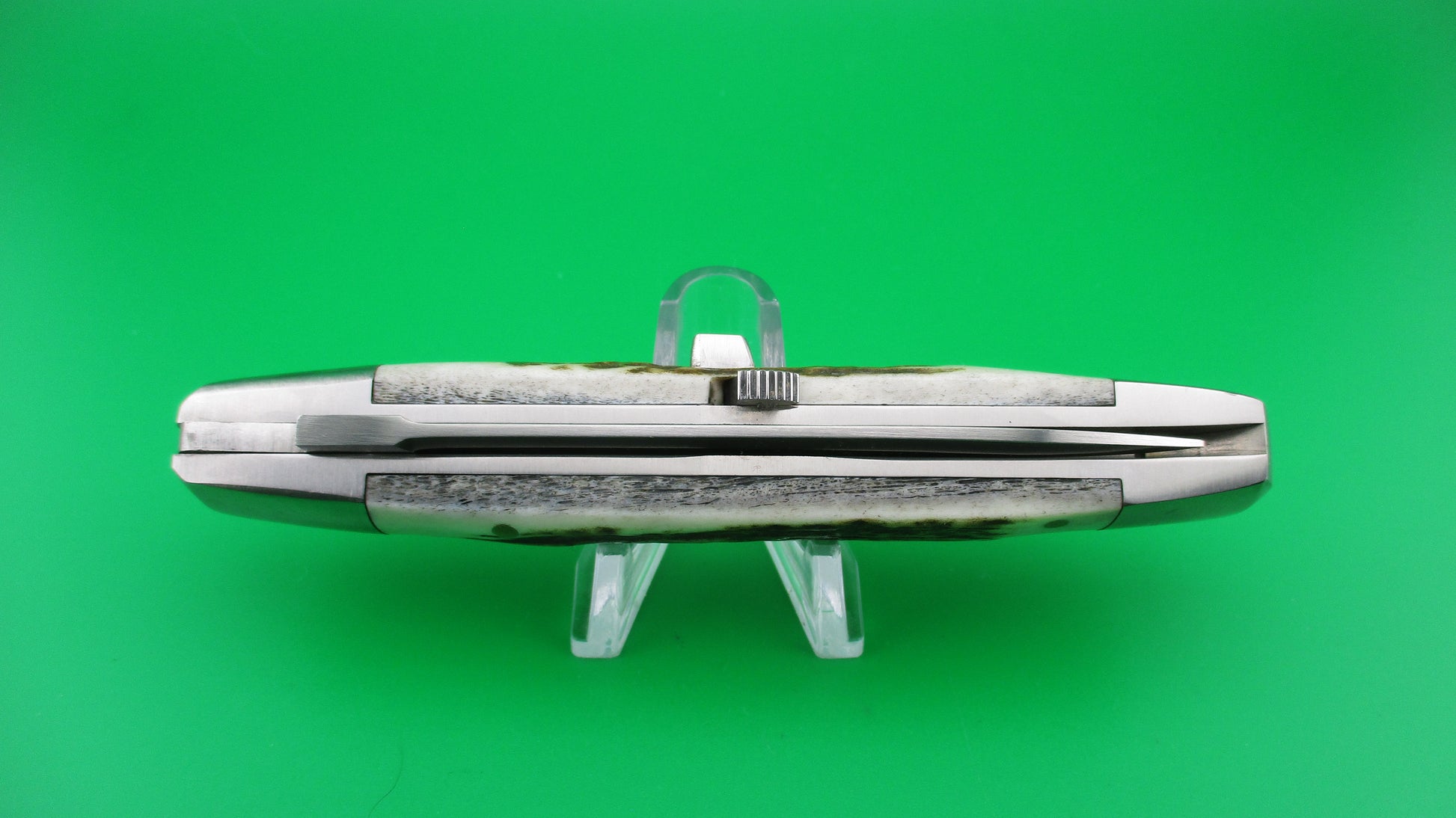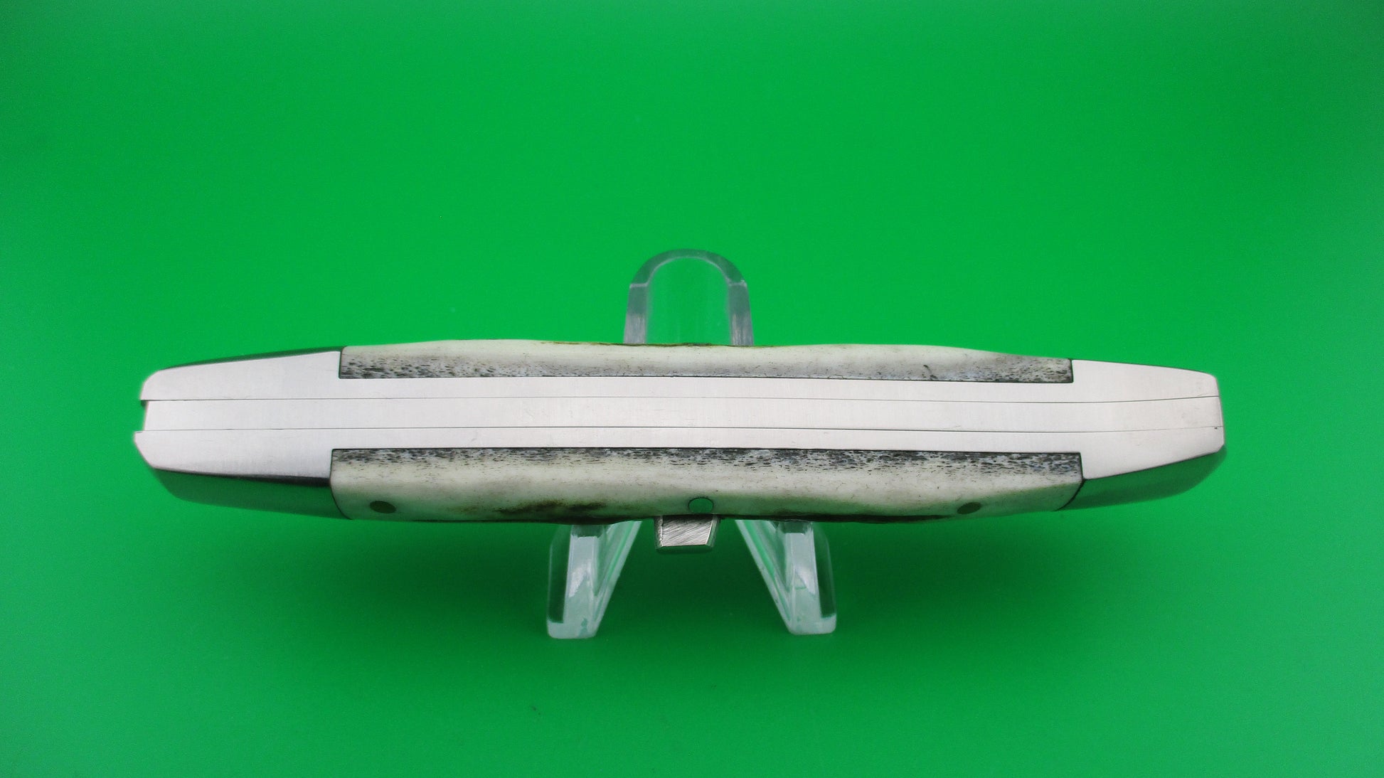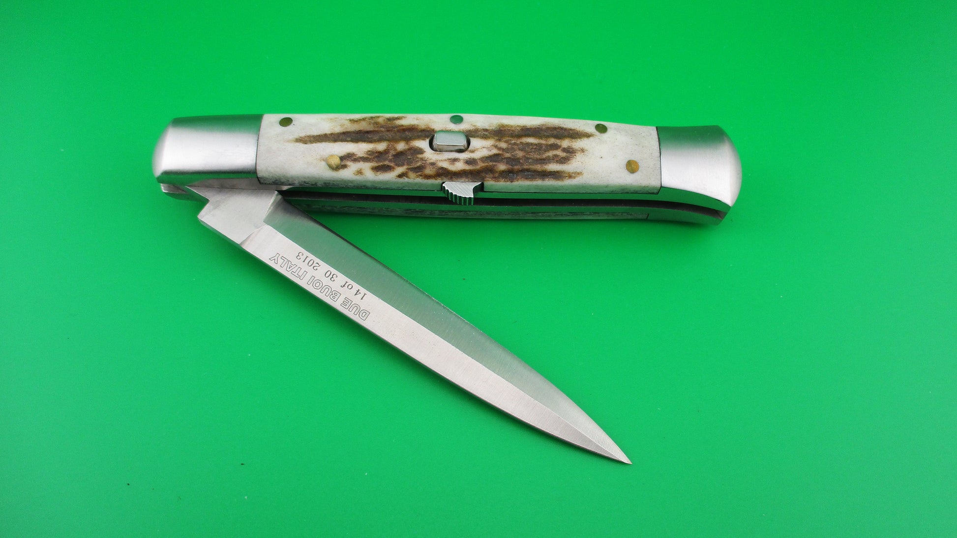 Modern 2013 Limited Edition #14 of 30 DUE BUOI ITALY switchblade with light stag scales. These knives are Very Solid and well made. Fit is great, finish could be a little better, but very nice. The knife measures 22.6cm (9 inches) open with a heavy steel frame, bolsters, button and safety. The safety is next to the front liner near the button and it works well. The dagger grind blade is full with original factory finish and is marked on the face of the blade DUE BUOI ITALY 14 of 30 2013 (with Due Buoi in outlined white letters). The genuine stag scales are in great condition. It works great with the blade tip below the liners when closed, Strong snap and Tight lockup. These knives are very popular with collectors and hard to find! Safety works great. This knife is NOS (New old stock), pretty much just as it left the factory.