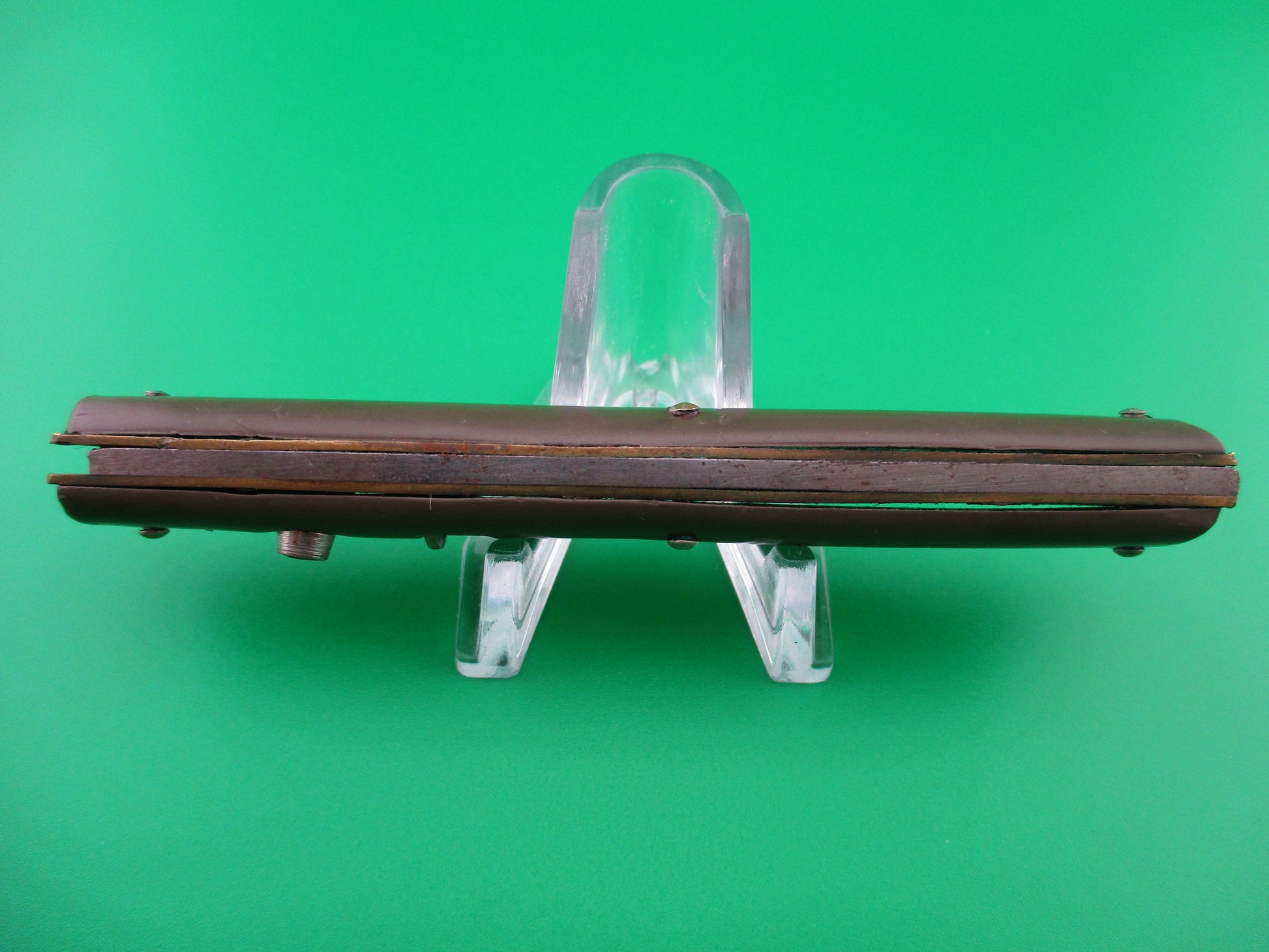 Edgemaster fishtail with Olive green synthetic scales made by the Federal Knife Co of Providence, RI in the late 40s, or early 1950s. This knife was designated the model #301 and measures 4 inches closed and 7 1/8" open with brass liners. The blade is nearly full and shiny and is stamped Edgemaster USA. The Olive green scales are in great condition with minimal shrinkage. The knife functions good with blade tip seating deep, good snap and locks open with some movement each way with approx 1/4" up and down. The knife does rattle if shaken when open as most of these old 50s American switchblades do that have been used over the years. The safety works. Overall a nice working example of a 50s vintage American made fishtail switchblade. 100% money back guarantee including return shipping if you're not happy with this knife.