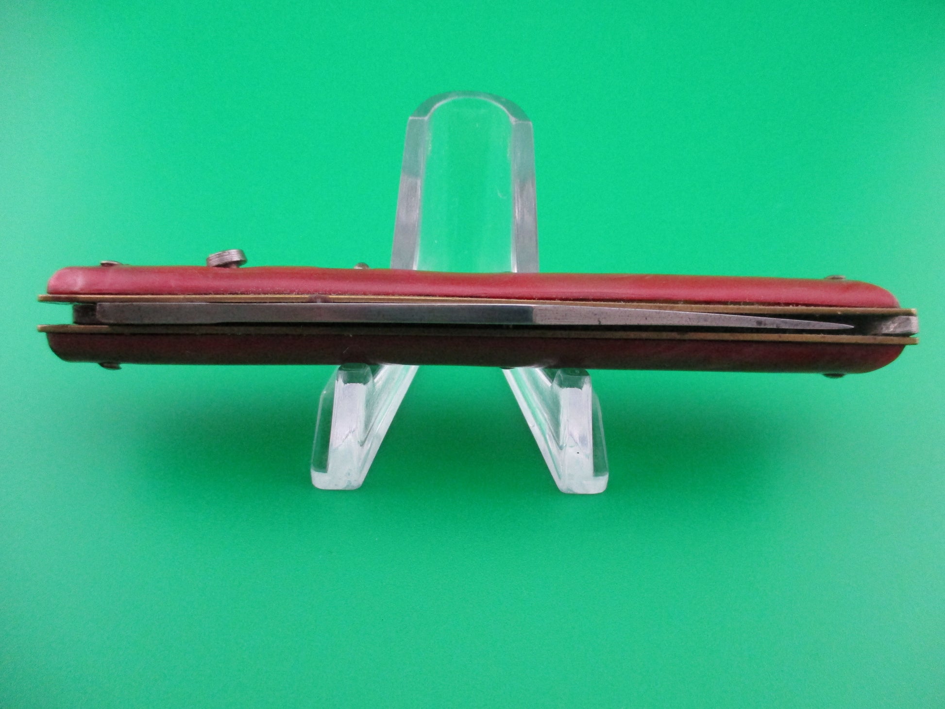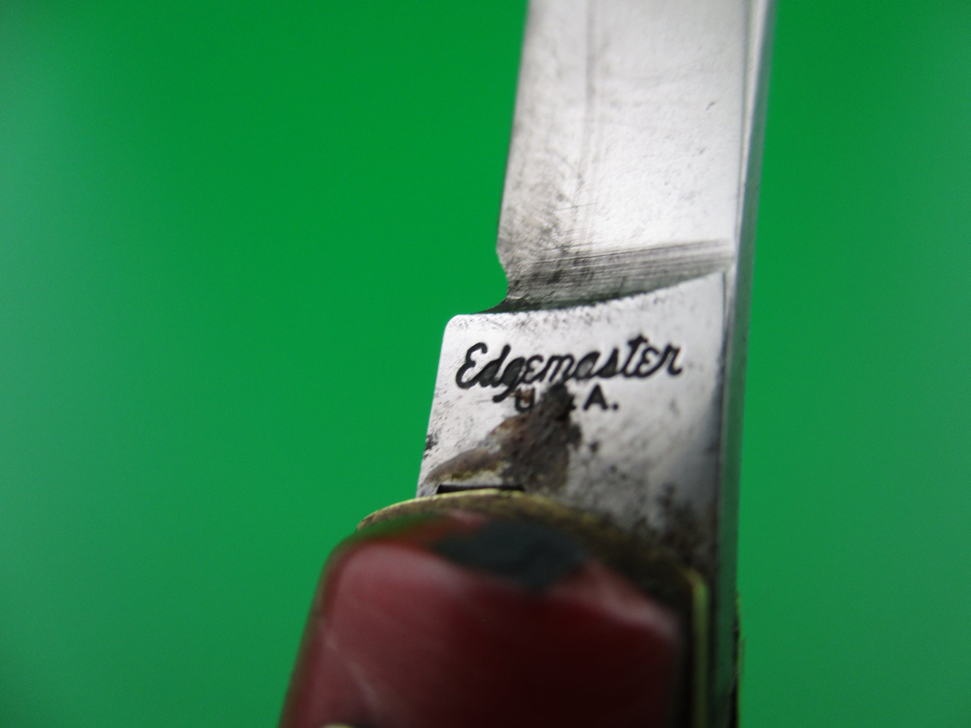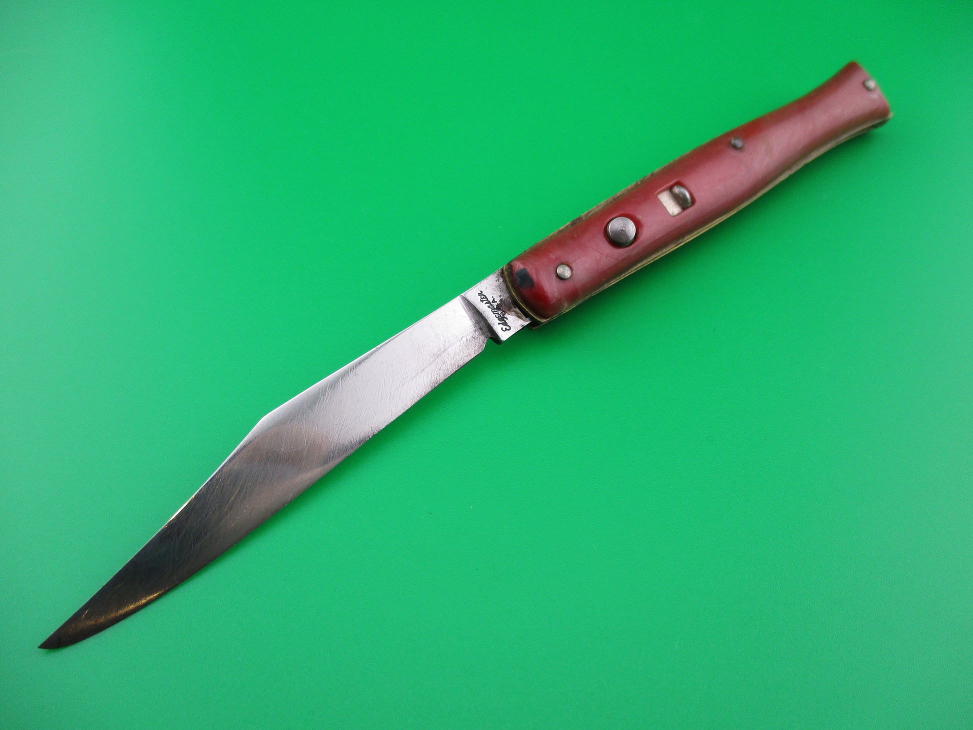 Edgemaster fishtail with Red swirl synthetic scales made by the Federal Knife Co of Providence, RI in the late 40s, or early 1950s. This knife was designated the model #301 and measures 4 inches closed and 7 1/8" open with brass liners. The blade is nearly full and shiny with lots of light scratches & is stamped Edgemaster USA. The red swirl scales are in great condition with some shrinkage. The knife functions good with blade tip seating deep, good snap and locks open nicely with just a little movement each way. The knife does not rattle if shaken when open. The safety works. Overall a nice working example of a 50s vintage American made fishtail switchblade. 100% money back guarantee including return shipping if you're not happy with this knife.