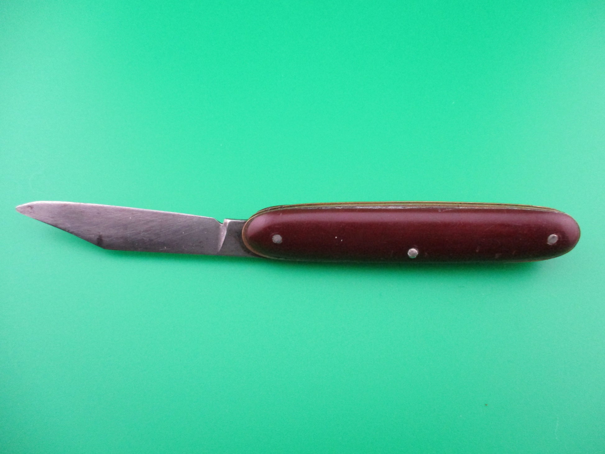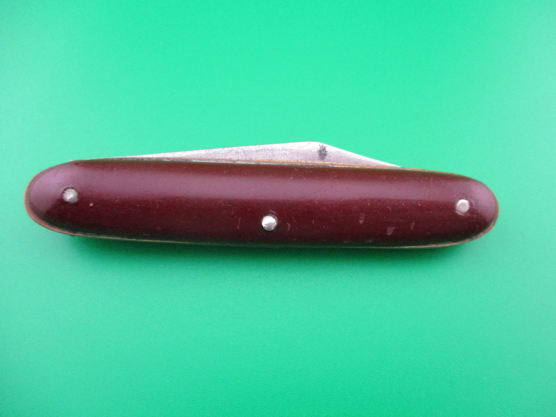 This is an Edgemaster model 108 cigar switchblade made by the Federal Knife Co of Providence, RI between 1947 and 1954. It measures 3 3/8 inches closed and 5 7/8 inches open with brass liners. The knife is in average condition with some blade loss from sharpening, very light pitting and some scratches. The knife works well with the blade tip seating deep when closed, good snap and locks open with some extra movement. Blade rattles if knife is shaken when open, as many of these do, but it does lock. The reddish brown synthetic scales are in fair condition with a chipped area near the button, some shrinkage, but no cracks. Average well used condition.