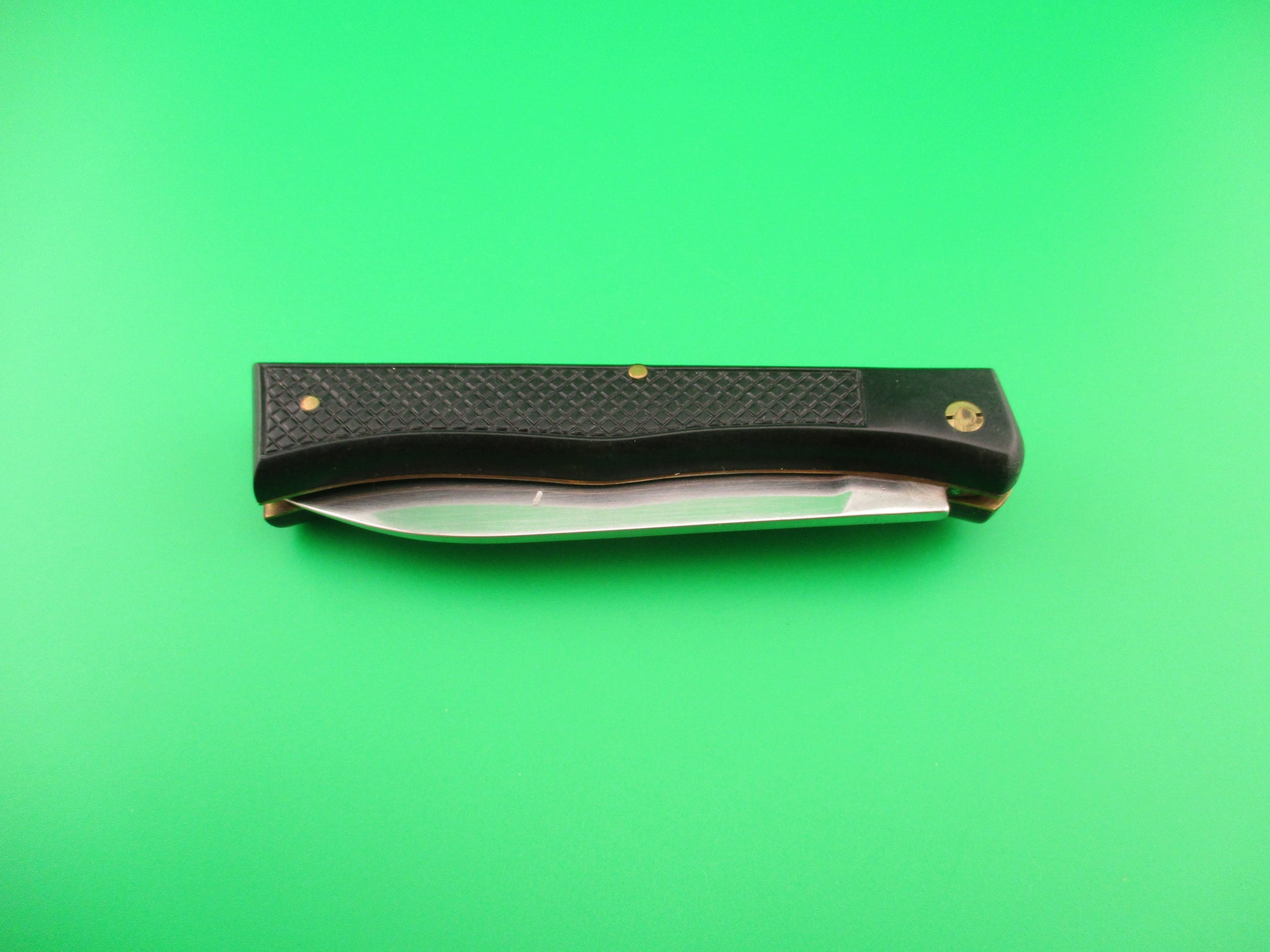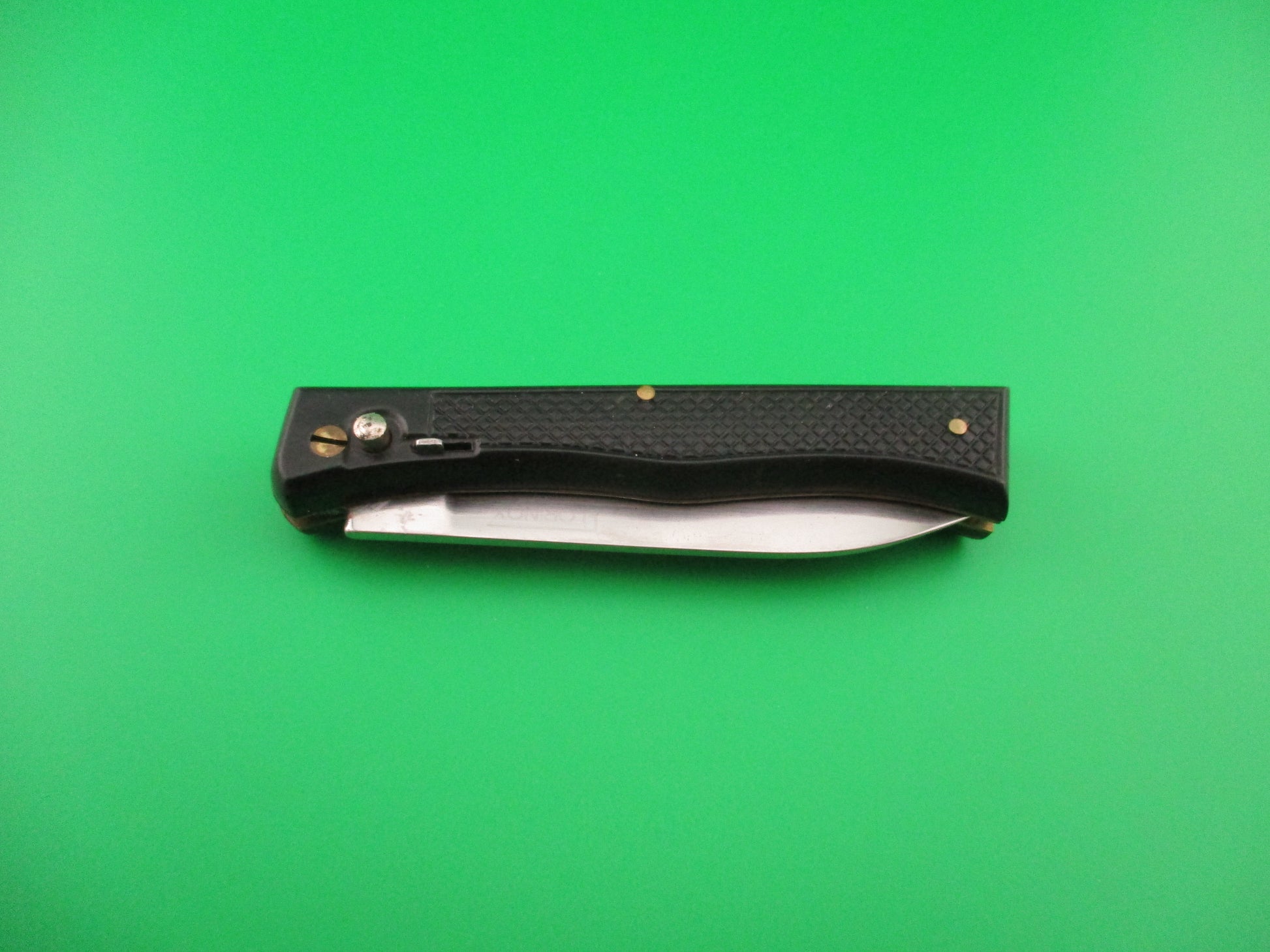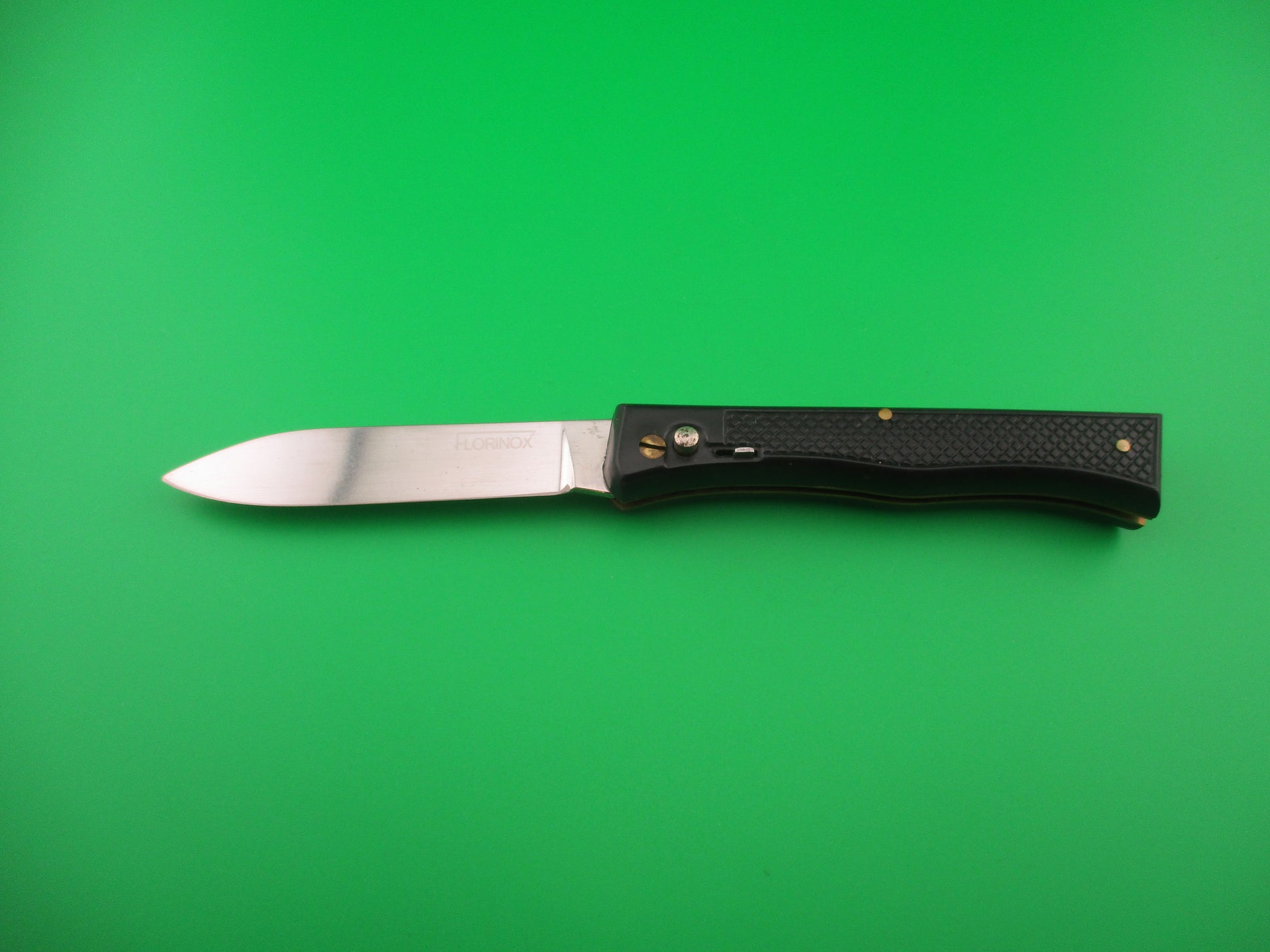 FLORINOX 19cm French Black checkered locking automatic knife made in France 1970s or 80s. It measures 19.2cm (7.5 inches) open and 4.25 inches closed with brass liners and pins and steel button & safety. The spear point blade is 99% full, or better with original finish and the ricasso is unmarked, but FLORINOX is etched on the front of the blade below the spine. The black checkered scales (handles) are in very nice condition. The knife works great with blade tip well below liners closed, strong snap and excellent lockup with just a hint of movement at the tip. No rattle if shaken with blade open. EX+ condition.