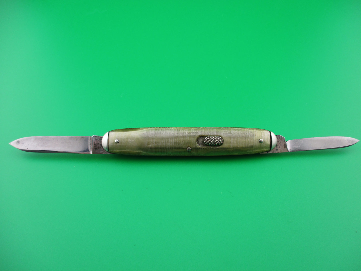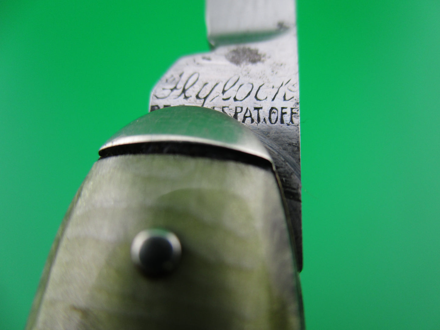 This knife was made by the Flylock Knife Co, a division of Challenge Cutlery Corp of Bridgeport, CT in the late 1920s. It's the larger size of the two bladed switchblades that the company made measuring 3 3/8" closed. The knife has two blades, each is activated by sliding an oval button, one on each side of the knife. Both blades stamped FLYLOCK KNIFE CO REG US PAT OFF on the front. THE FLY LOCK KNIFE CO B'PORT CONN on the rear of the big blade with "THE FLYLOCK" arched and US PAT MARCH 5, 1918 on the back of the small blade. The scales (handles) are Smoked Pearl celluloid and are beautiful with one crack through center pin on the front. The blades are mostly full and shiny with some very light scratches and very light pepper spots. The knife functions well with no peek when closed. Blades open as they should with good lockup when open. No kickback and no rattle. This knife will be featured in the book Antique American Switchblades 2 and comes with a laminated Certificate of Authenticity. German silver tip bolsters are a nice feature on this beautiful old American switchblade.