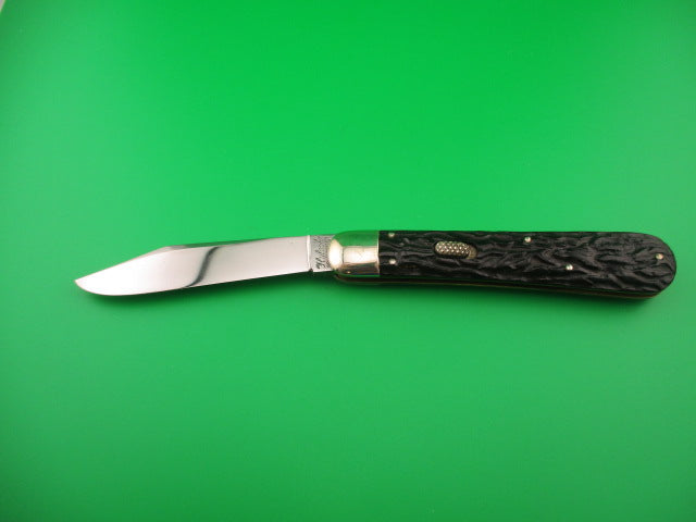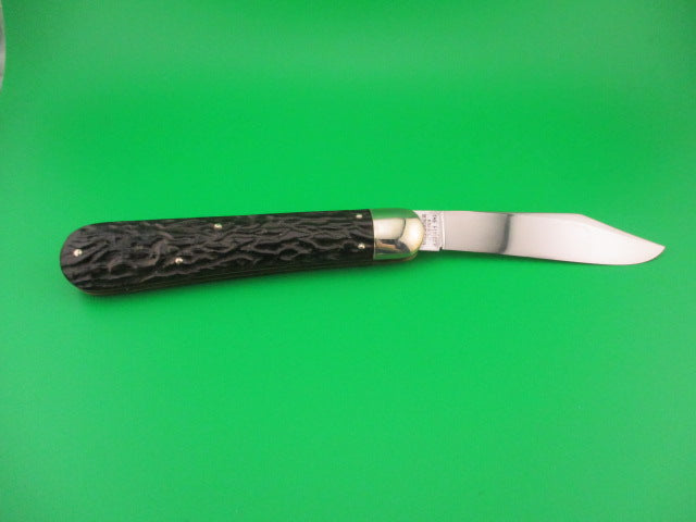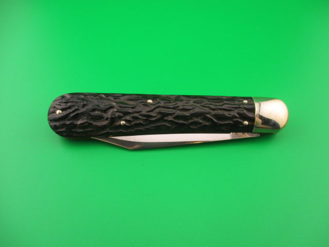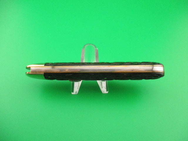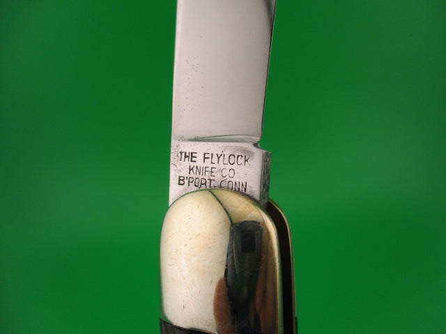 Antique Flylock Hunter 11000 Large Single Black Wormgroove switchblade knife made by the Flylock Knife Co, a division of Challenge Cut Co of Bridgeport, CT in the 1920s. This is the largest switchblade made by the company and it was designated the model #11000. It measures 5 inches closed and 8 9/16 inches open with RARE Brass liners and nickel silver bolsters and button. The blade is less than 1/4 inch short with a little loss at the tip, but overall a nice blade at about 96% and shiny with some light scratches. The tang is stamped Flylock REG US PAT OFF over US PAT 3-5-18 and backside is stamped THE FLYLOCK KNIFE CO B'PORT CONN. The black bakelite worm groove scales (handles) are in great condition with no cracks. The knife works well with the blade tip deep and centered in the well, good snap and average lockup with about 1/8" up and down and a little side to side at the tip. Rattles if shaken with blade open as most of these do that have seen use over the past 100 years or so. Nice working example of a 100 year old American made switchblade knife. EX condition.