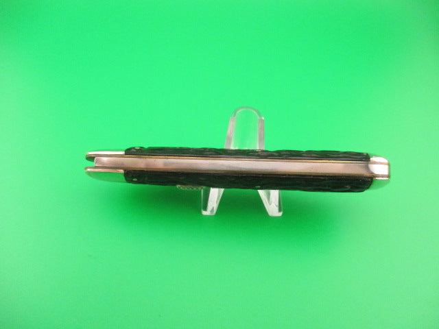 Antique Flylock Hunter with Lazy W folding guards was made in Bridgeport, CT in the 1920s and is the largest size switchblade made by the Flylock Knife Co. It was designated the model #11004 and measures 4 7/8" closed and 8 5/8 inches open with RARE BRASS liners and nickel silver bolsters, button and guards. The clip blade is 96% full or better and shiny with several very small pit spots and is stamped Flylock REG US PAT OFF US PAT 3-5-18 on the front tang and THE FLYLOCK KNIFE CO B'PORT CONN on the rear. The black jigged (wormgroove) synthetic scales (handles) are in excellent condition with no cracks. This knife works Great with the blade tip seating below the liners, good snap and fair lockup with about 1/16" movement each way and rattles if shaken when open as most of these do after 100 years. EX condition. Very nice example of an antique American folding guard switchblade.