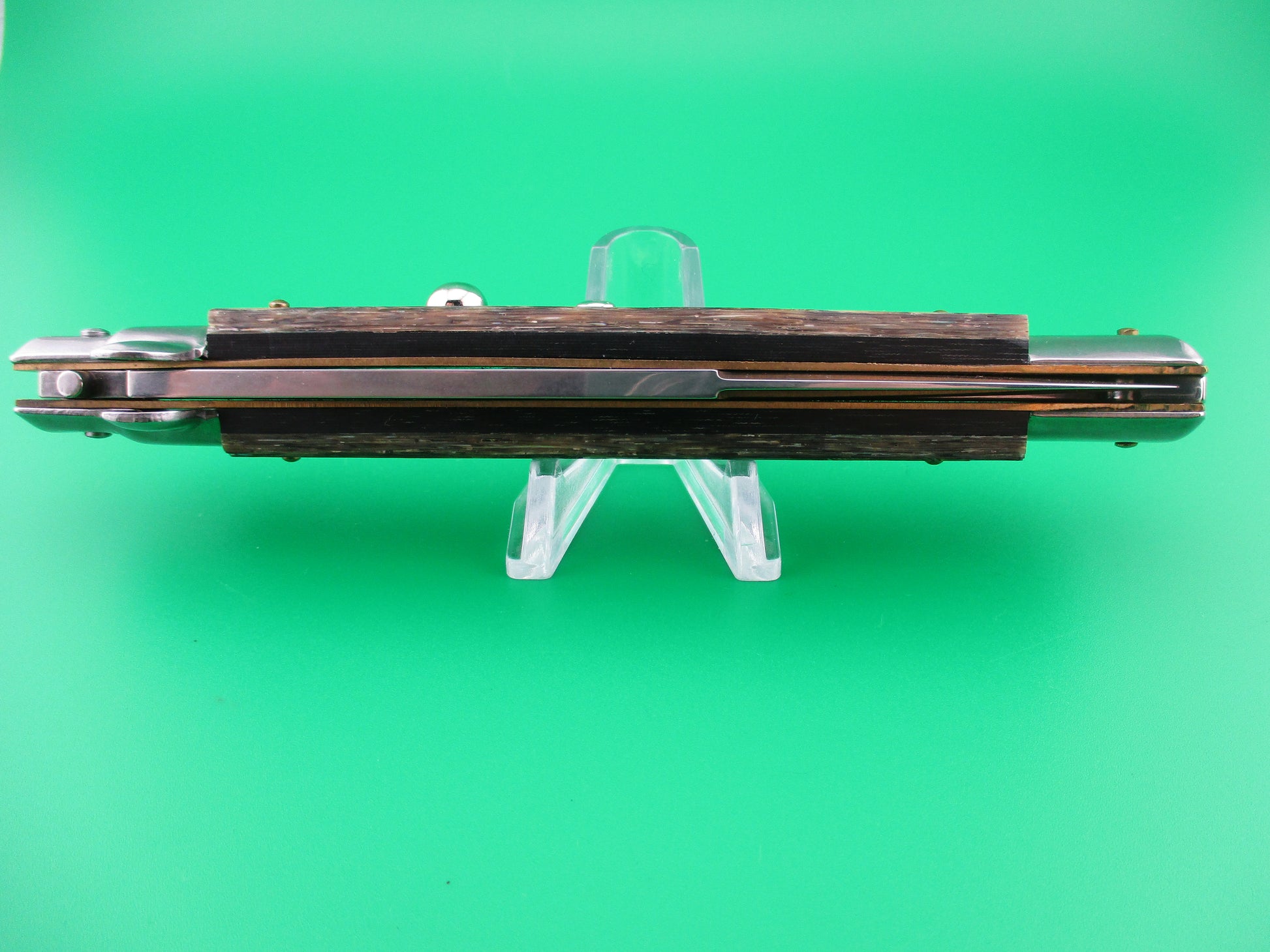 FRANK B 28cm Italian genuine ABALONE Stiletto switchblade knife. Knife measures 28cm (11 inches) open with brass liners and stainless steel bolsters, button and safety cap. The bayonet style blade is full with all of the original factory finish and is stamped FRANK B ITALY. The scales (handles) are faced with genuine Abalone and are beautiful and in great condition. The knife functions perfectly with blade tip deep, strong snap and tight lockup with just a bit of up and down at the tip. Safety works. EX+ condition.