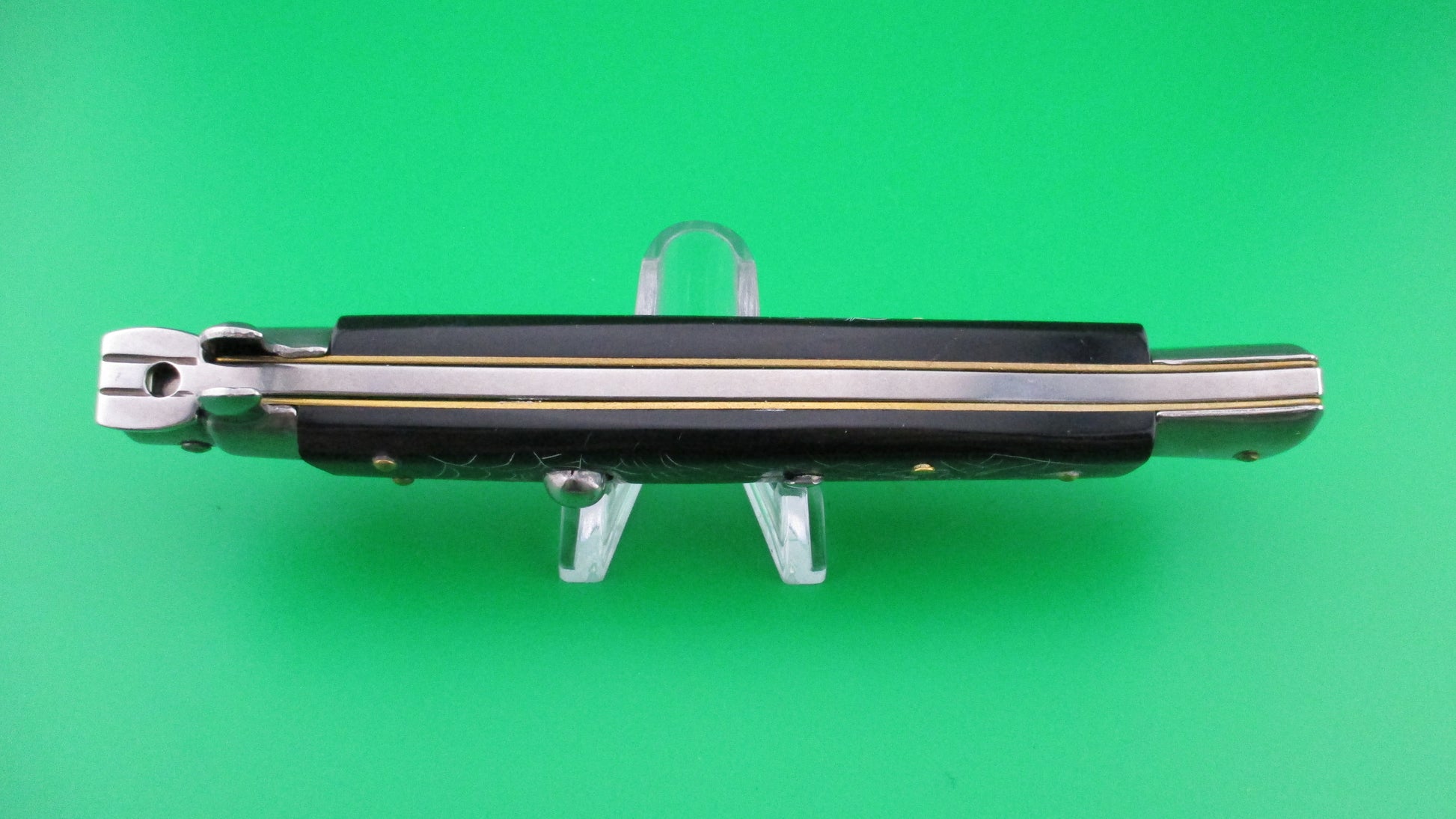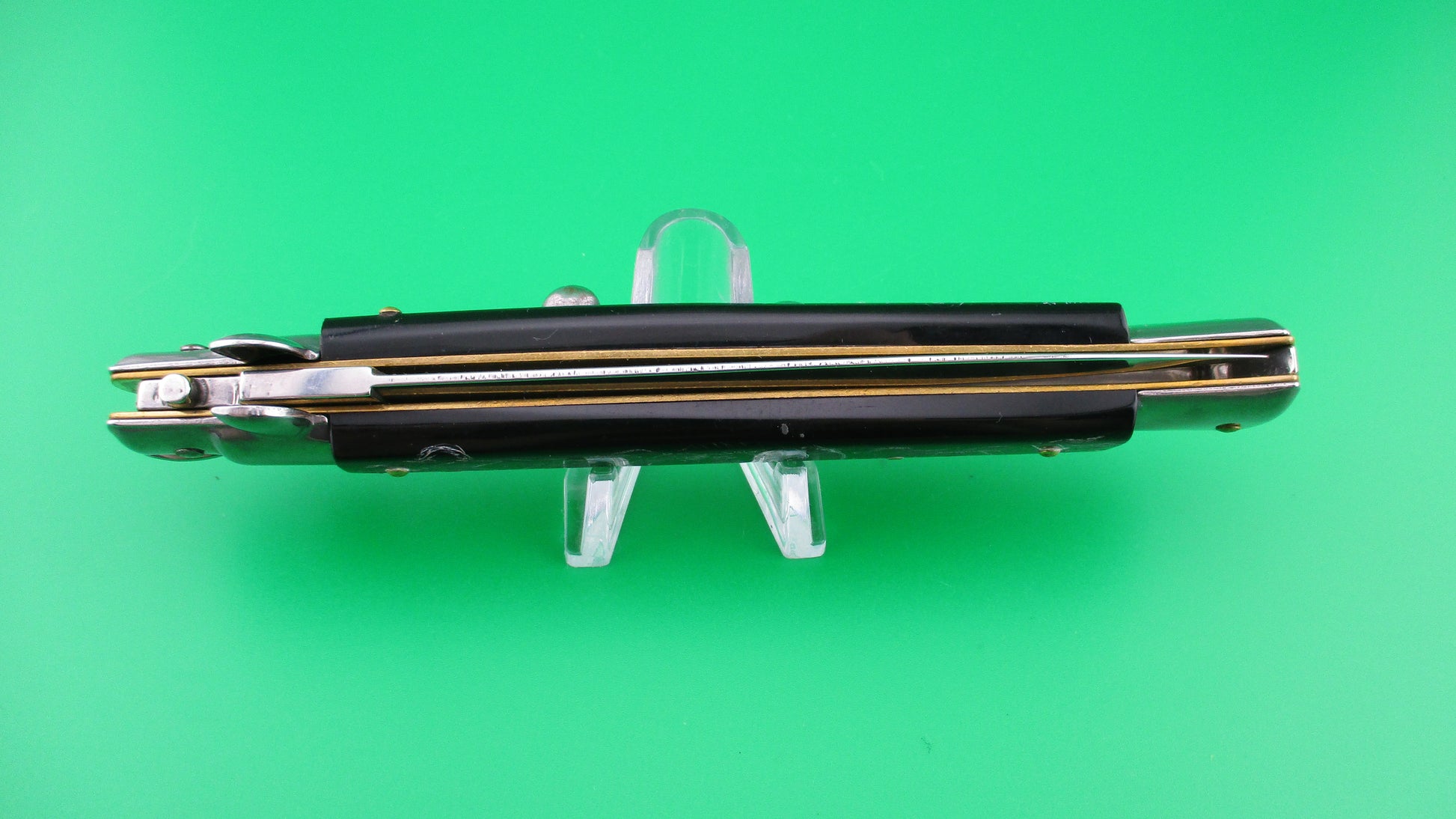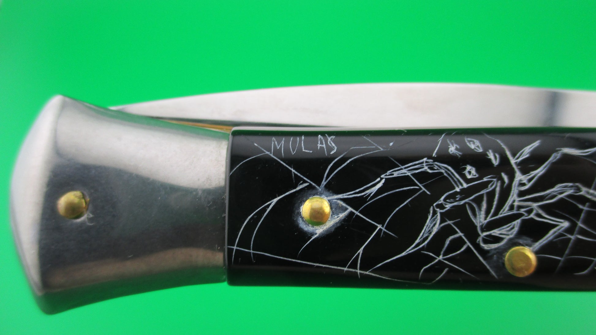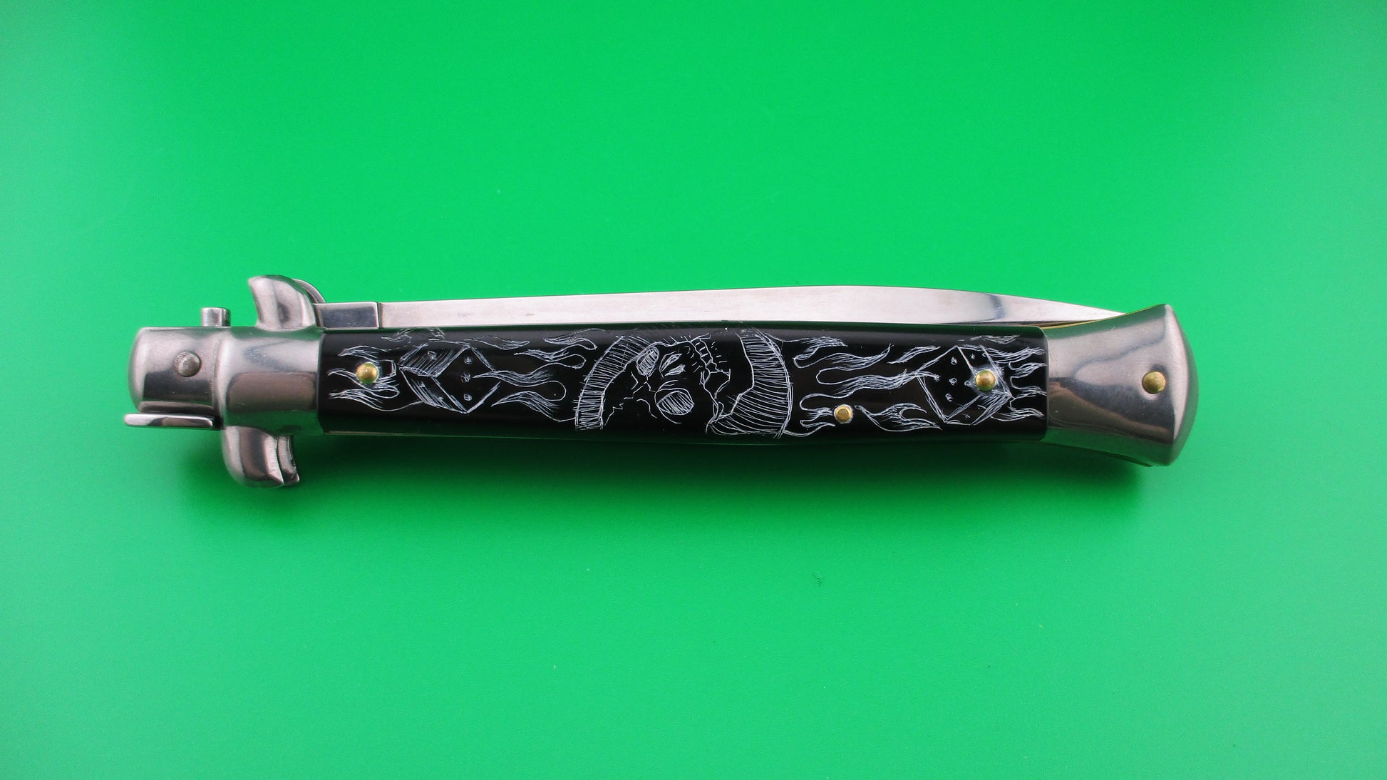 FRANK B 28cm Italian Stiletto Scrimshaw Skull Spiderwebs, Flames & Dice white on black switchblade knife. This knife had scrimshaw work done by Italian artist MULAS so it has MULAS at the bottom of the front scale. Spider & webs on the front scale and a Skull, Dice & Flames on the back scale. The knife measures 28cm (11 inches) open with brass liners & pins & steel bolsters, button and safety. The Dagger grind blade is full with all of the original factory finish. The scales are black with scrimshaw and very attractive. The knife works great with blade tip deep closed, strong snap and Tight lockup open. Safety works. Nearly new condition.