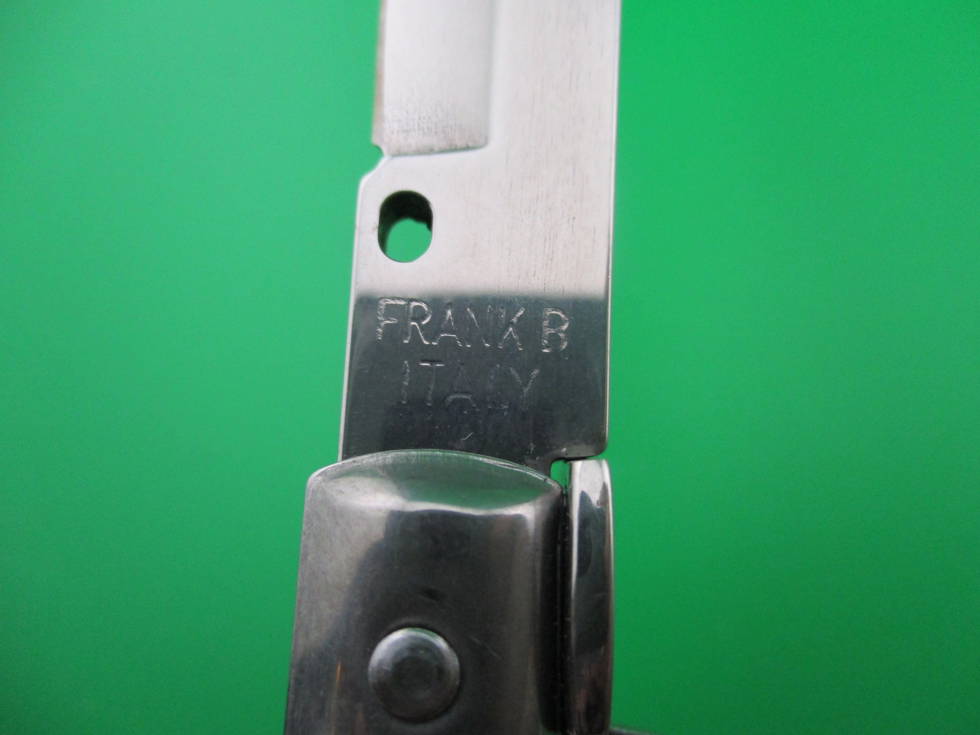 Nice like new Frank Beltrame 9 inch stag swivel bolster. Measures 23cm (9 inches) open with brass liners. Marked Frank B Italy on the ricasso. Never used to cut anything. Only been played with a little. Swivel bolster means you have to push down on the right finger guard on the top front bolster to swivel the bolster and release the blade to close. Blade is full with 100% factory finish. Works perfectly and has a nice tight safety. Nearly New.