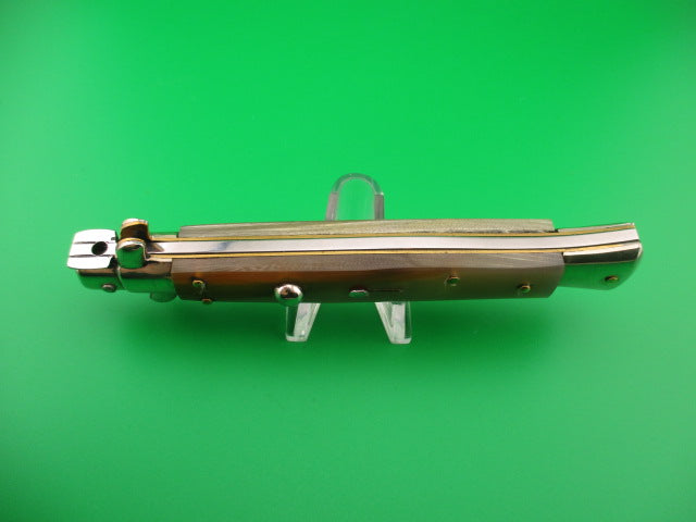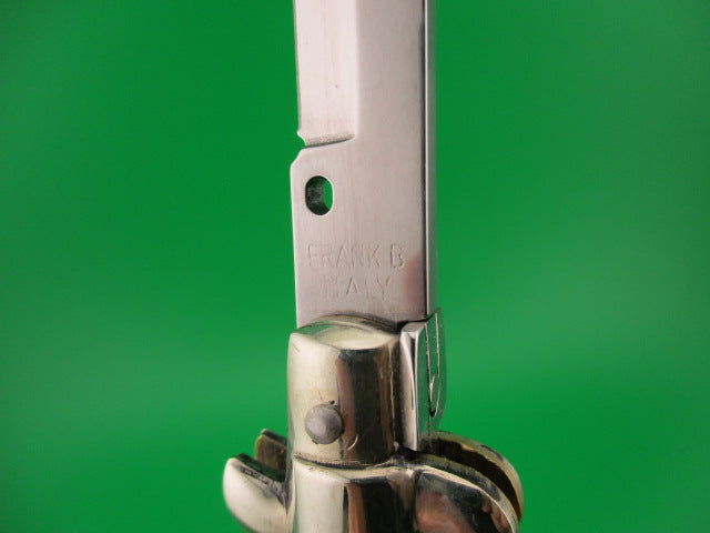 FRANK B ITALY 28cm Italian Picklock Stiletto Bayonet Horn Red dot automatic knife measures 27.8cm (11 inches) open and just under 6 inches closed with brass liners & pins with nickel silver bolsters and steel button and safety cap. The bayonet style blade is 100% full with all of the original finish and is marked FRANK B ITALY on the front of the ricasso and back side is blank. The horn scales are mostly Honey & light green with some Caramel streaking and are in excellent condition with a Red Dot safety. The blade tip is below liners closed, strong snap and Tight lockup. Safety works. Nearly new condition.