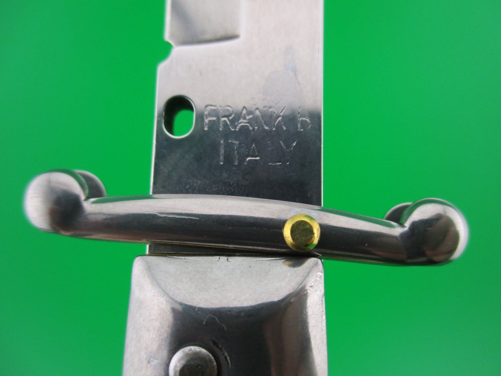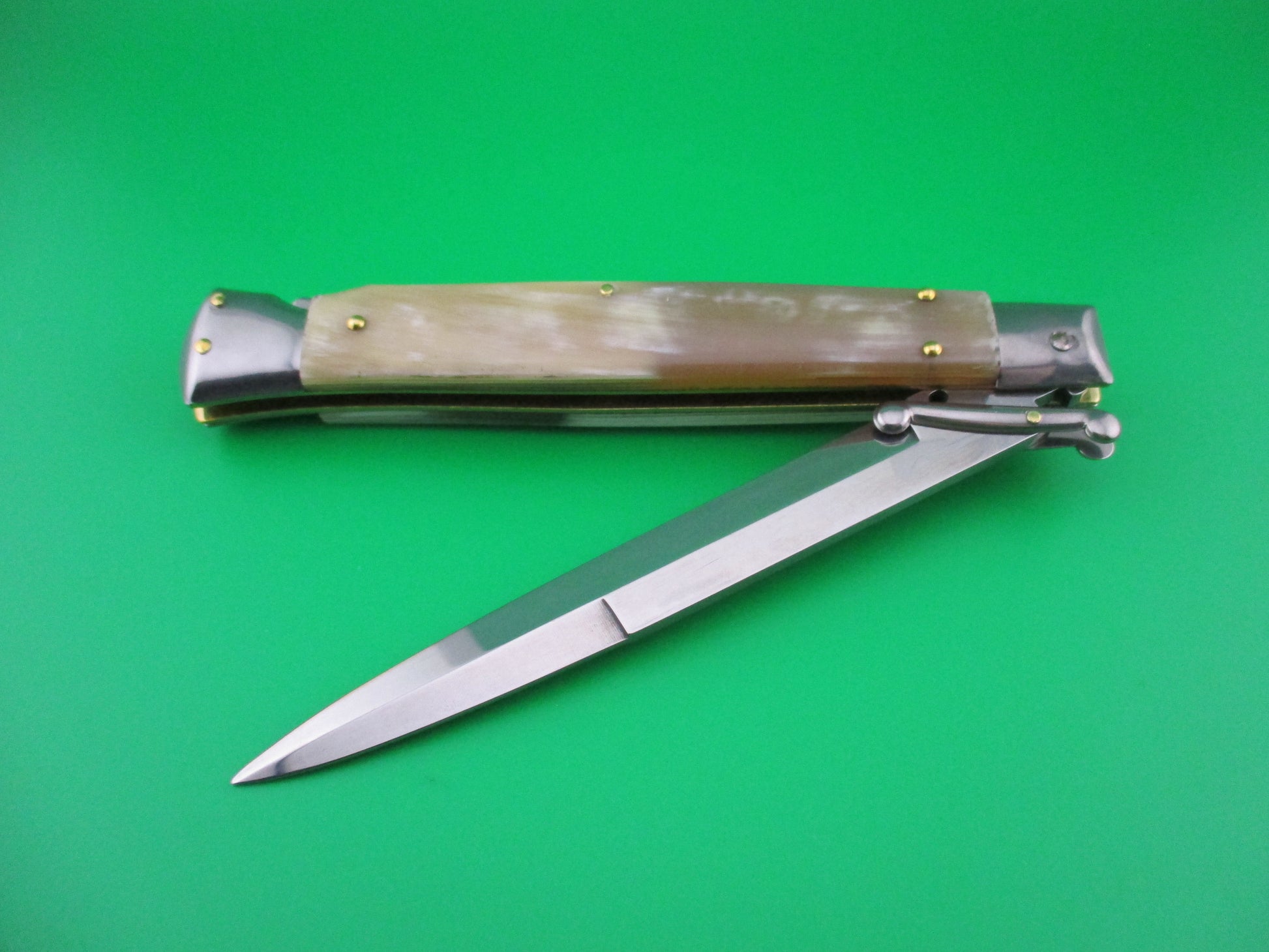 FRANK B 28cm Swing Guard Cream & Honey horn automatic knife NEW. Measures 28cm (11 inches) open with brass liners and stainless steel bolsters, guards, button and safety cap. The bayonet style blade is 100% full with original factory finish and is lightly stamped FRANK B ITALY on the ricasso. Gorgeous Light colored horn is in perfect condition. The knife works perfectly with the blade tip below the liners closed, strong snap and tight lockup. Must push down hard to close. Safety works. New condition.