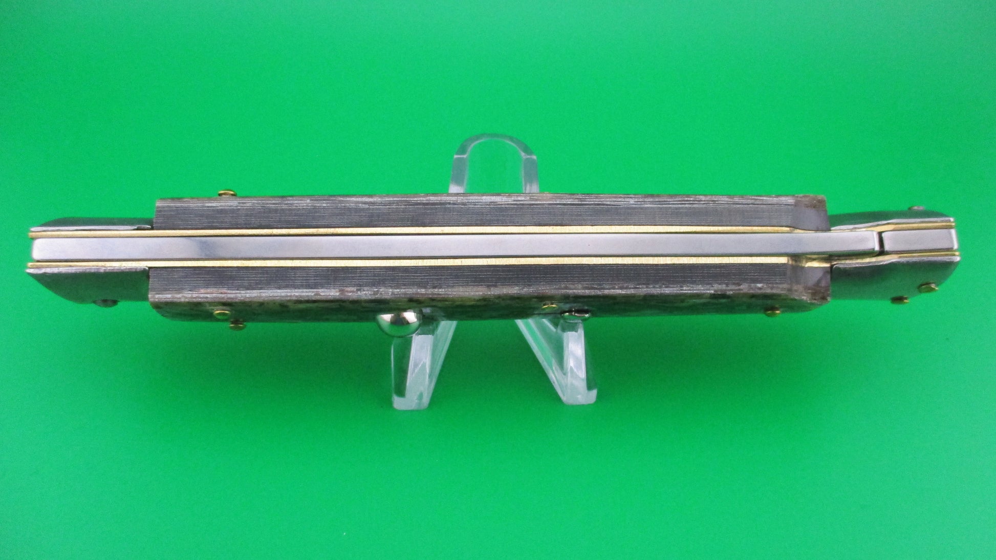 FRANK B ITALY 28cm Italian Swing guards Abalone Dagger blade automatic knife measures just over 28cm (11 1/16 inches) open with brass liners and stainless steel bolsters, guards, button and safety cap. The dagger style blade is 100% full with original factory finish and is lightly stamped FRANK B ITALY on the ricasso. Gorgeous Abalone scales! The knife works perfectly with the blade tip below the liners closed, strong snap and tight lockup. Safety works. New condition.