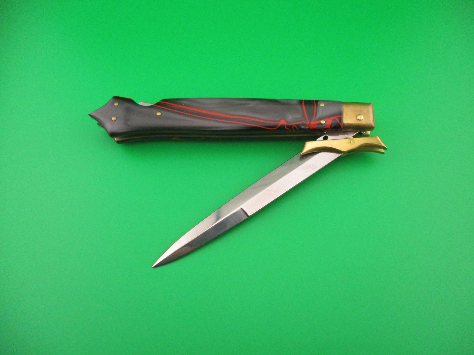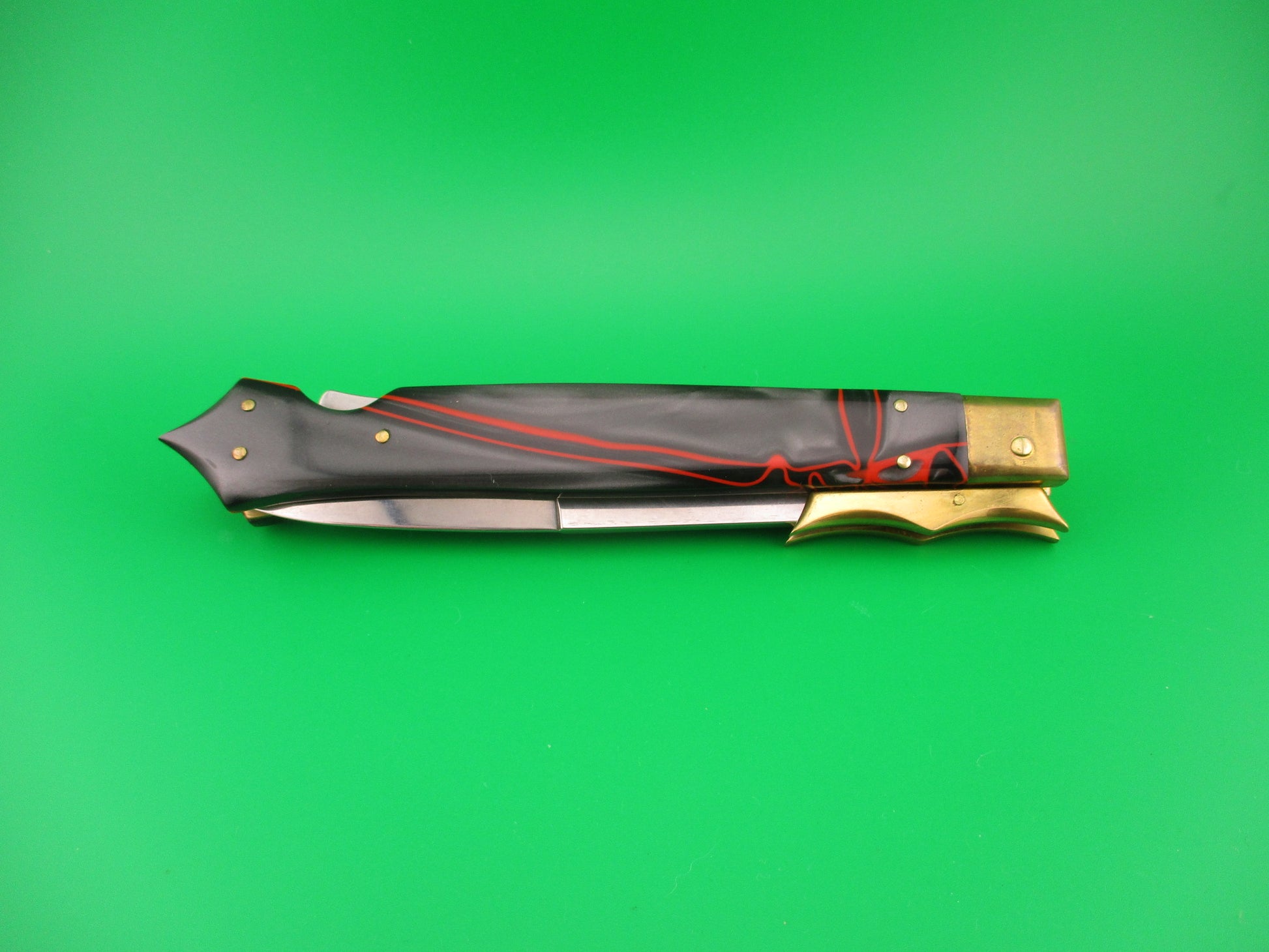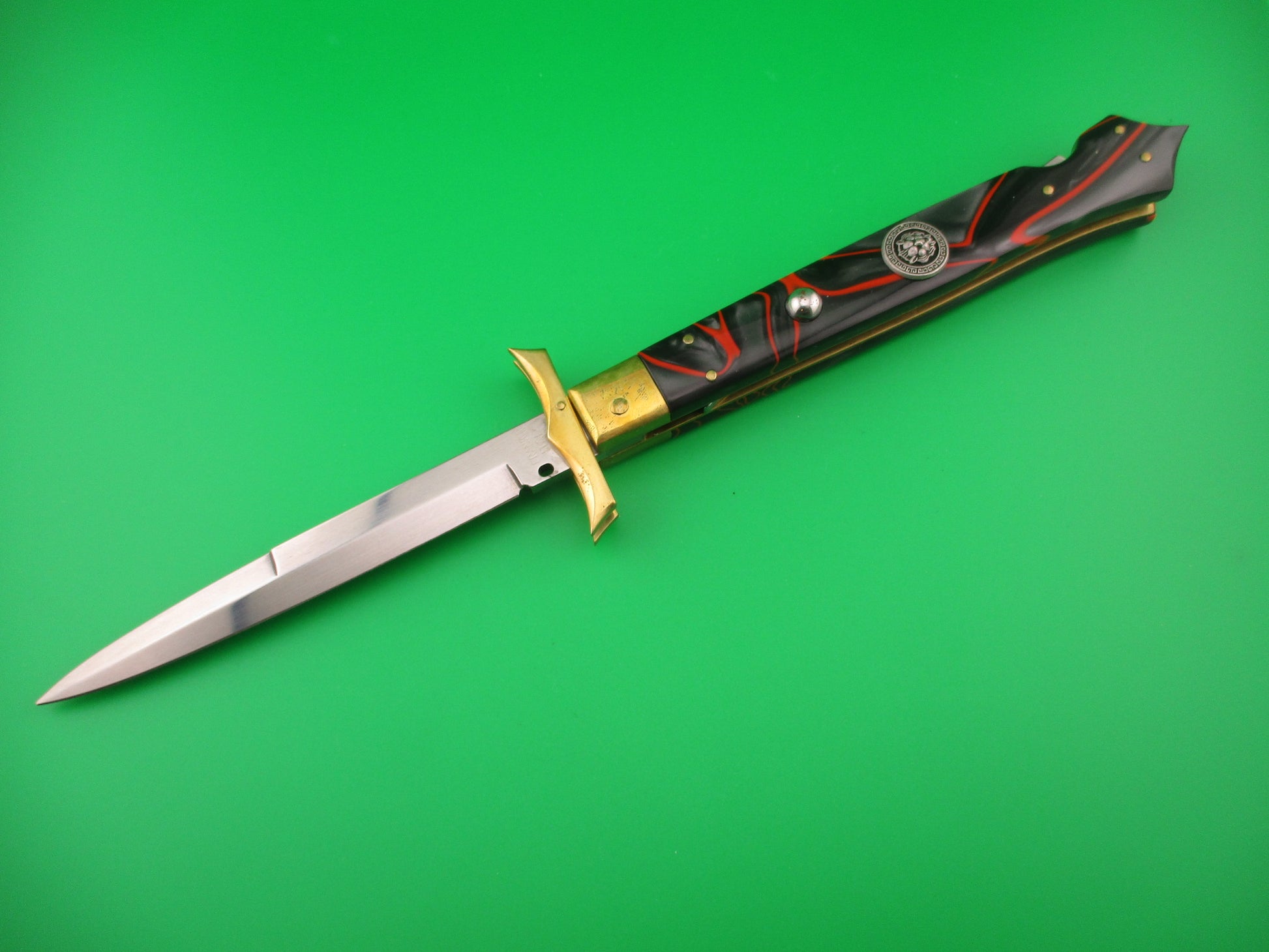 FRANK B MANGLE by Chad Ruben 29cm Italian Batwing Swing Guard Brass & Kirinite with Lion medallion. Mangle is a term used when someone takes a factory made knife and customizes it, usually with different handles and modified bolsters, guards, button, etc. This knife was customized (mangled) by Chad Ruben of Ruben's Blades. It started out as a Frank B 28cm swing guard and had the Bolsters, guards and scales removed and replace with hand made brass bolsters and guards and Red streaked Gray Kirinite scales that extend to a "glass breaker" point at the end (back) of the knife. The knife measures 29.2cm (11.5 inches) open and 6 3/8 inches closed with brass liners, bolsters, guards & pins and steel button. The bayonet blade is 100% full with original finish and the ricasso is stamped FRANK B ITALY. The scales are very attractive and in excellent condition with a Lion medallion where the safety would be (so no safety). The knife works great with blade tip deep & centered closed, strong snap and excellent lockup. No rattle if shaken with blade open. EX+ condition.