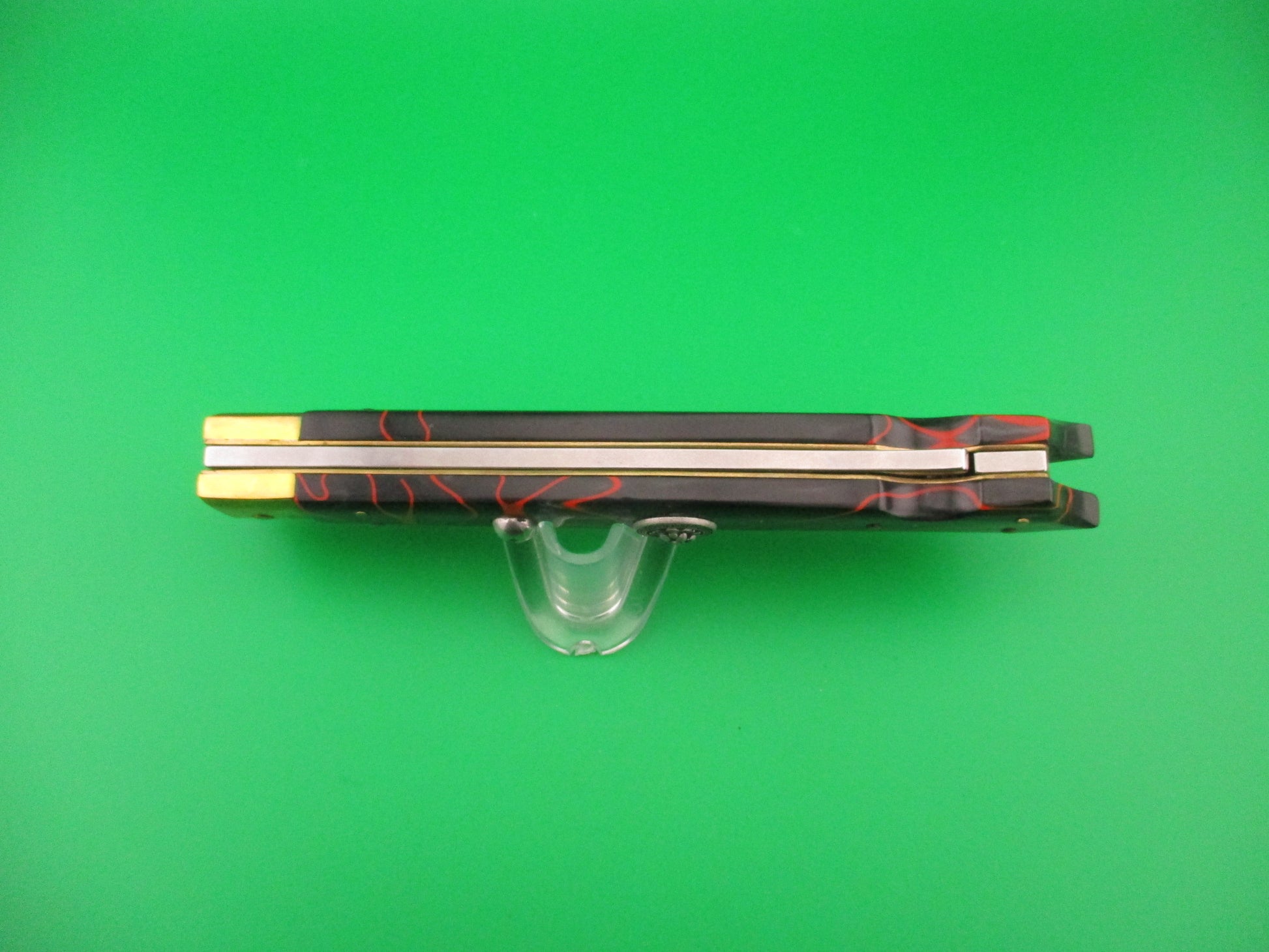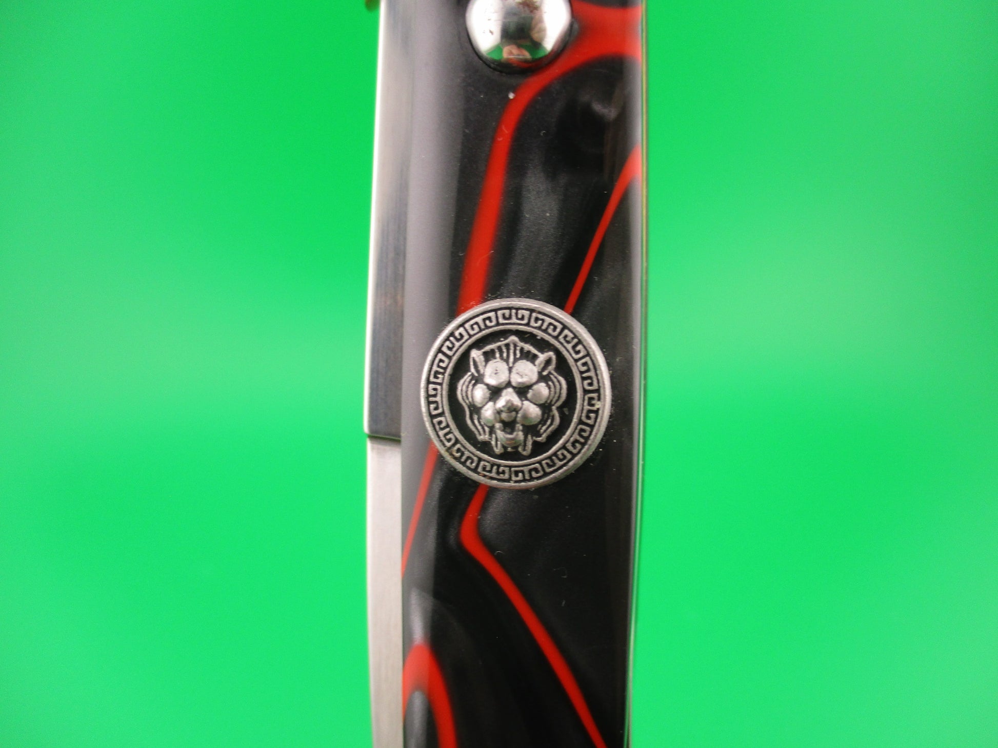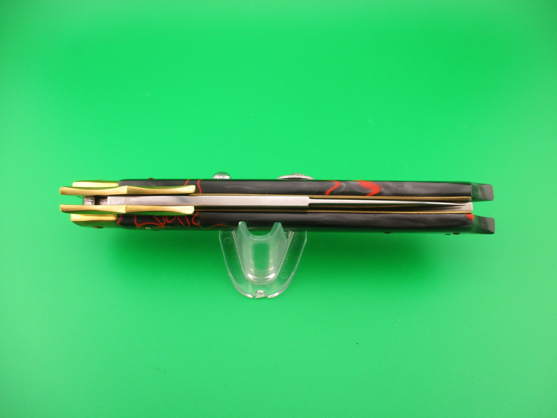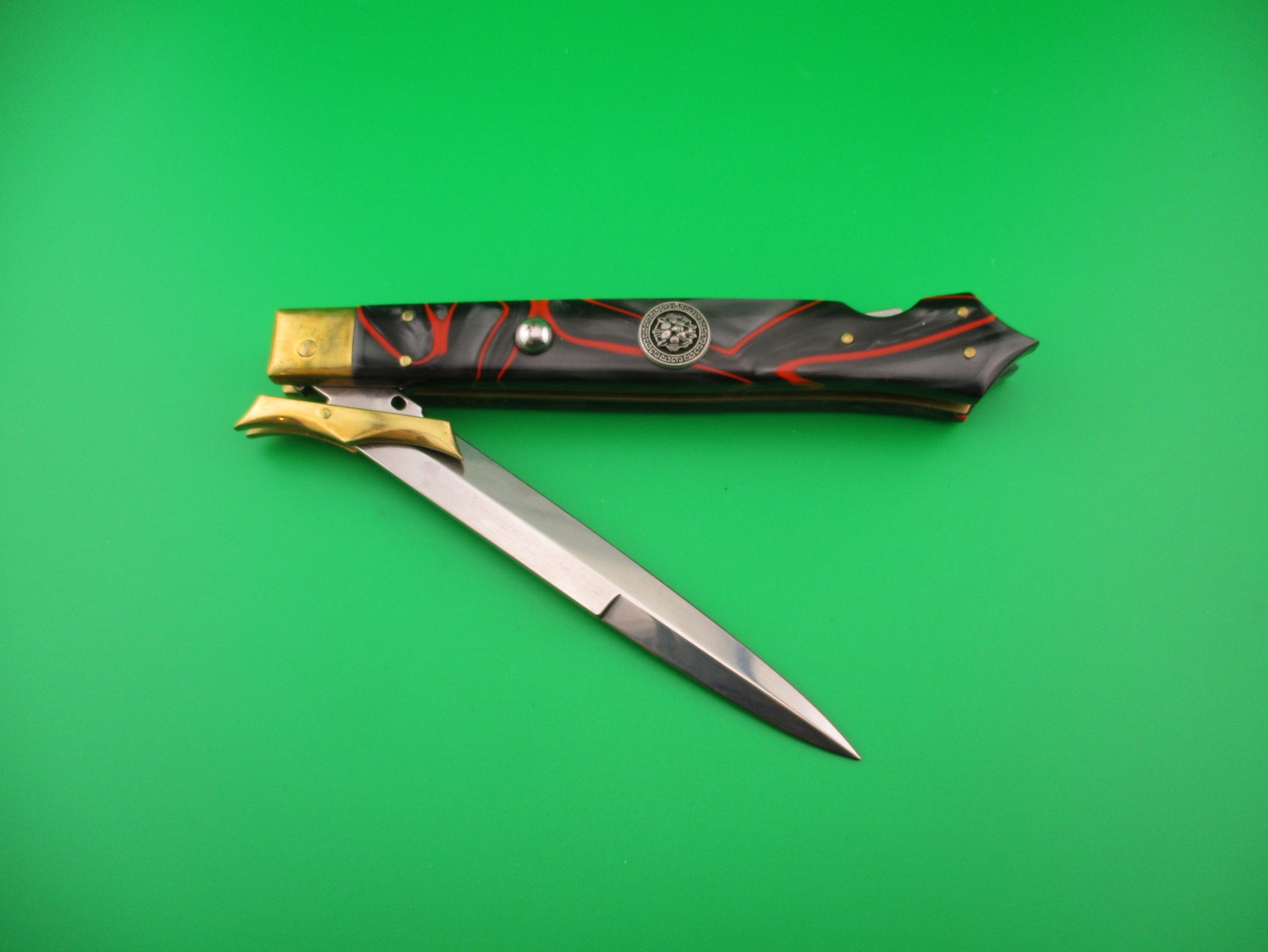 FRANK B MANGLE by Chad Ruben 29cm Italian Batwing Swing Guard Brass & Kirinite with Lion medallion. Mangle is a term used when someone takes a factory made knife and customizes it, usually with different handles and modified bolsters, guards, button, etc. This knife was customized (mangled) by Chad Ruben of Ruben's Blades. It started out as a Frank B 28cm swing guard and had the Bolsters, guards and scales removed and replace with hand made brass bolsters and guards and Red streaked Gray Kirinite scales that extend to a "glass breaker" point at the end (back) of the knife. The knife measures 29.2cm (11.5 inches) open and 6 3/8 inches closed with brass liners, bolsters, guards & pins and steel button. The bayonet blade is 100% full with original finish and the ricasso is stamped FRANK B ITALY. The scales are very attractive and in excellent condition with a Lion medallion where the safety would be (so no safety). The knife works great with blade tip deep & centered closed, strong snap and excellent lockup. No rattle if shaken with blade open. EX+ condition.