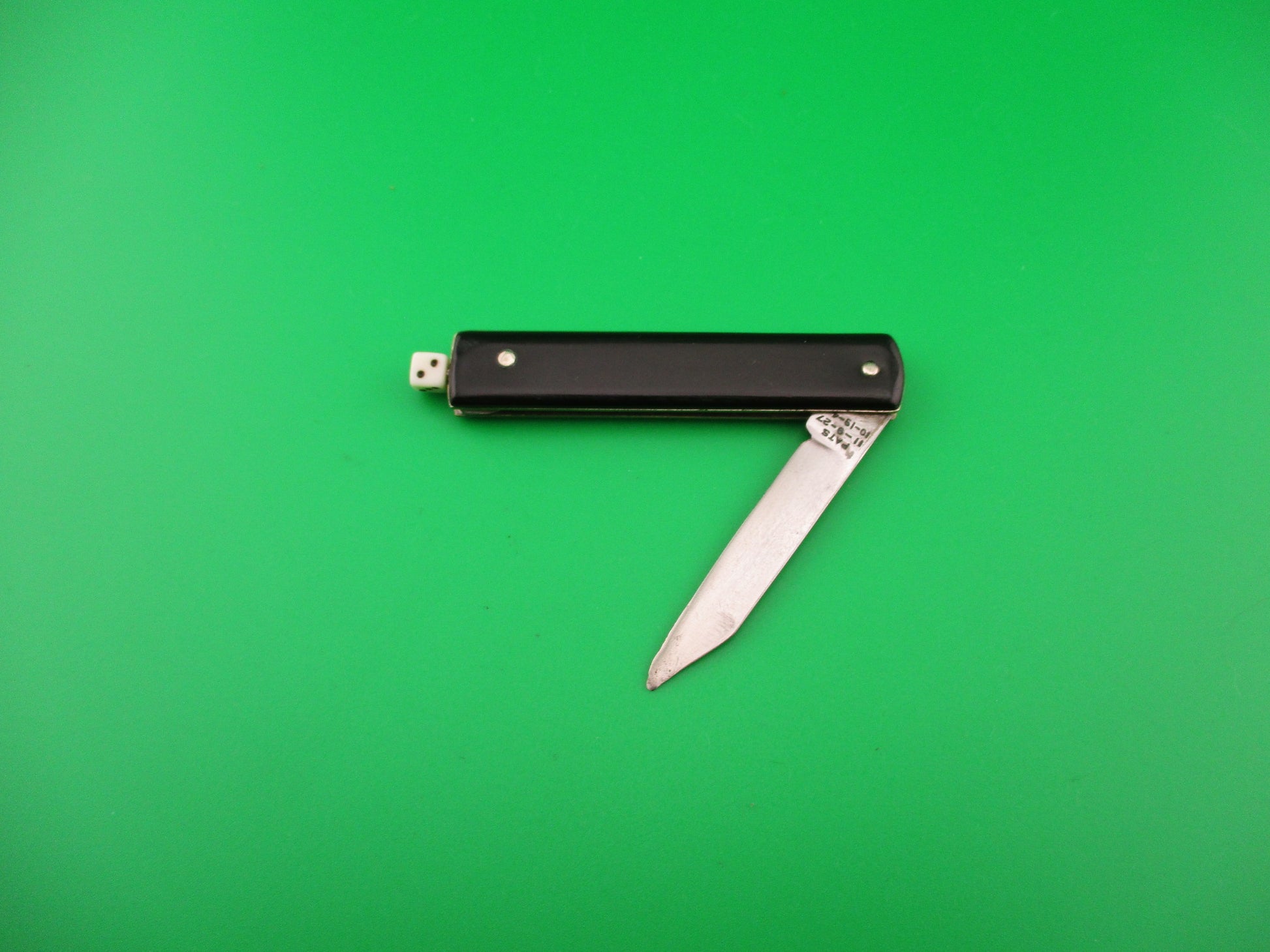 George Schrade Knife Co pullball switchblade with black handles and white dice pull. The blade is stamped G SCHRADE KNIFE CO INC B'PORT CT USA on the front and patent dates of 11-9-27 and 10-19-44 on the back which are both incorrect dates. Many of the pullballs were stamped with the wrong patent dates. The knife measures 2 7/8" closed including the ball and just under 4.75 inches open with brass frame. The blade is 92% full with most of the original finish and looks like someone did a little brazing near the tip. The black synthetic handles are in good condition. The die pull is in nice condition and the knife works well , but sometimes tricky to latch closed and is in VG- condition.
