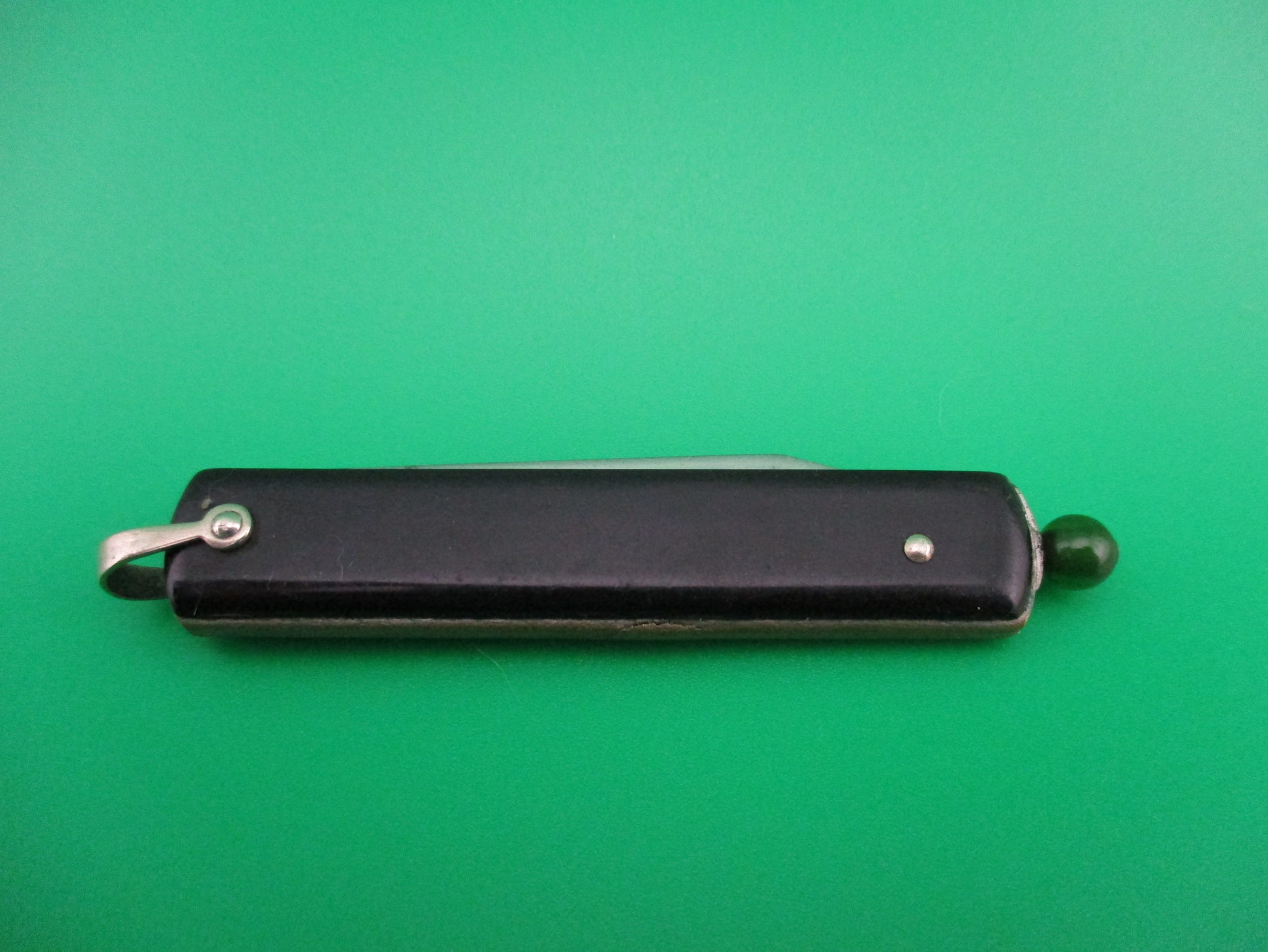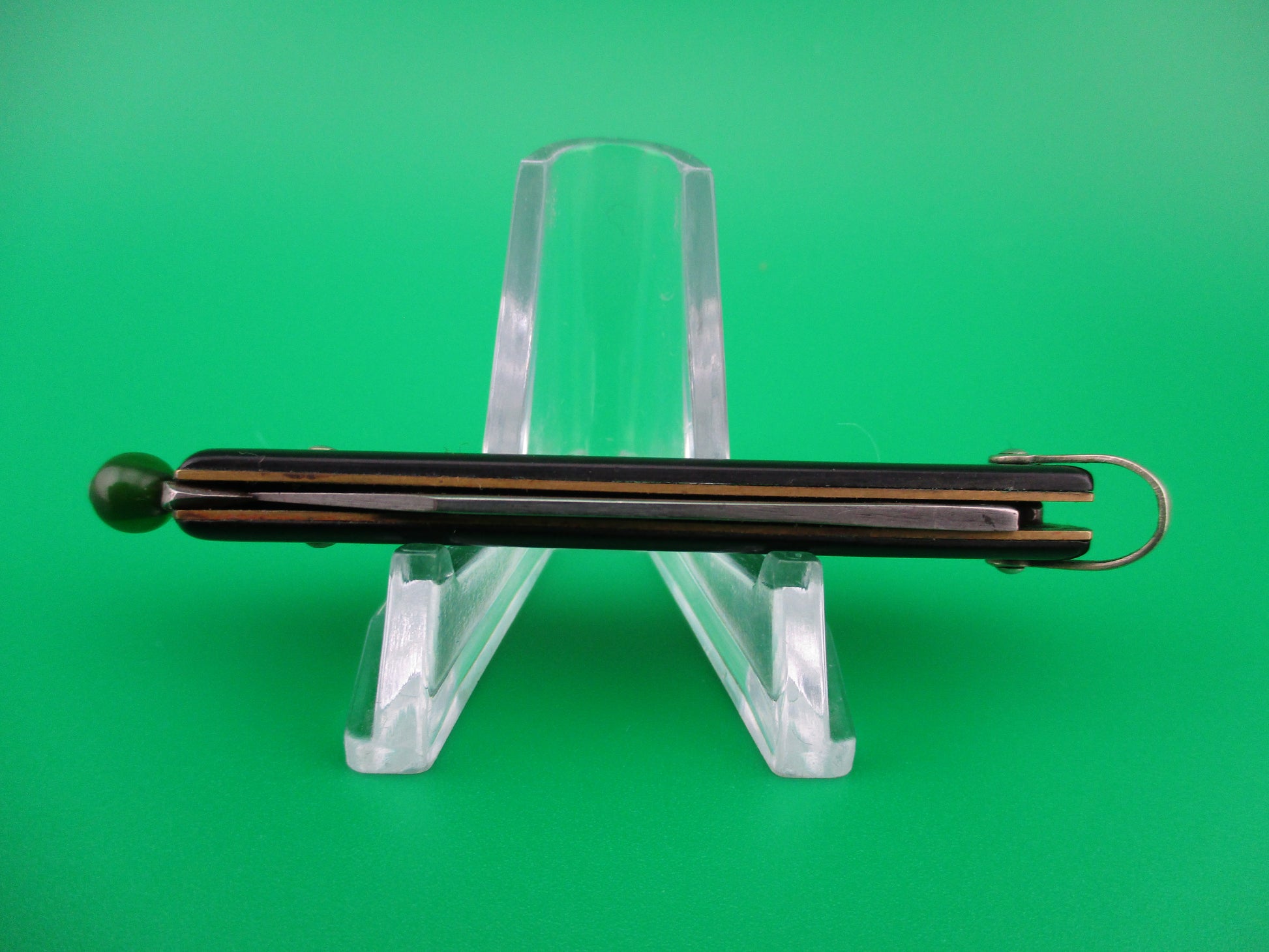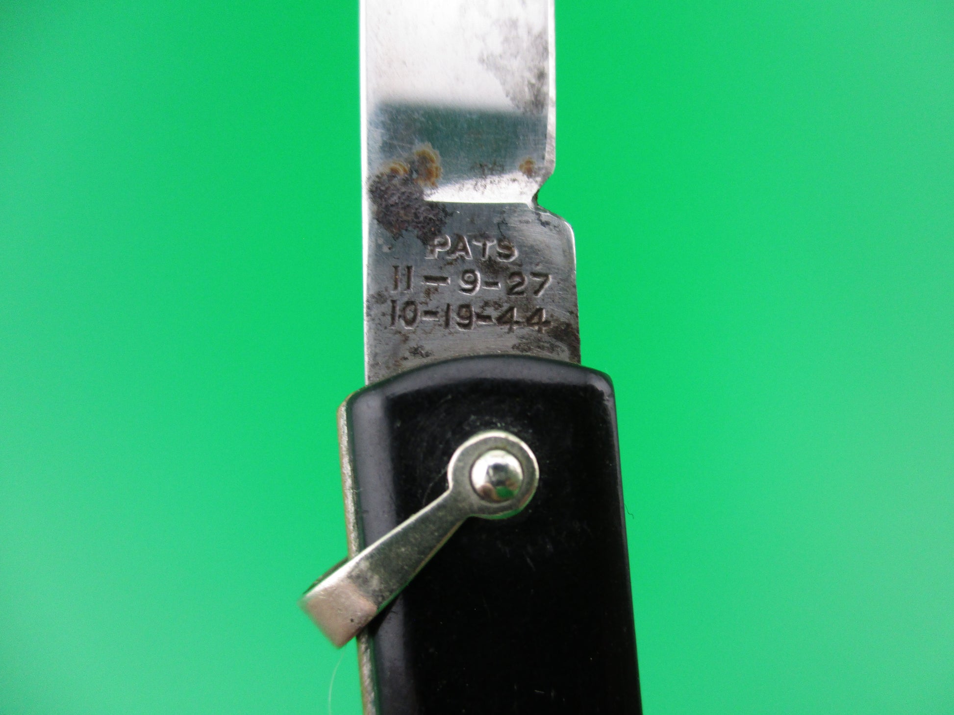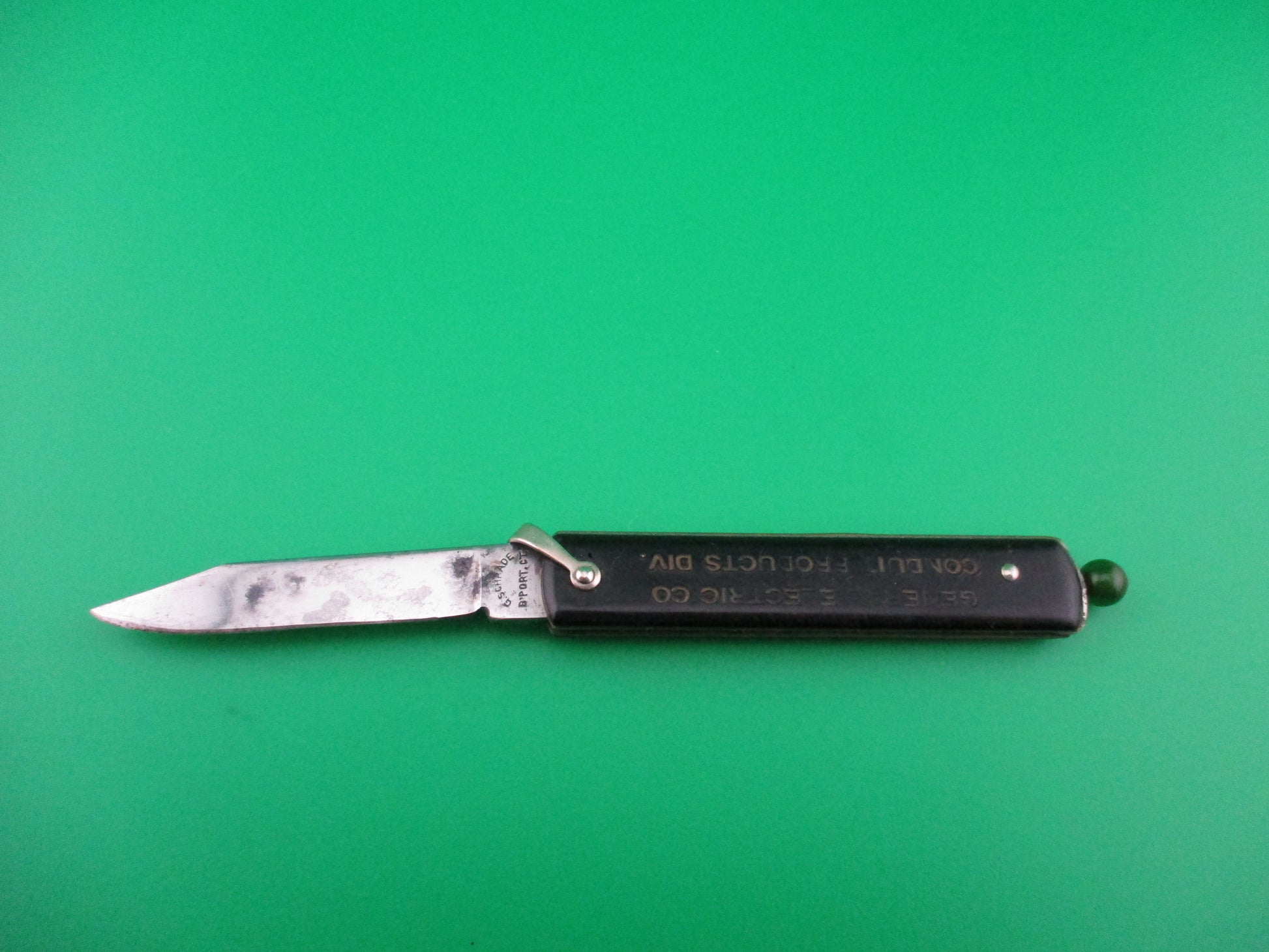 Geo Schrade Knife Co pullball switchblade with black scales and green translucent ball. This is an earlier knife with the arched G SCHRADE B'PORT, CT stamp and the patent dates of 11-9-27 and 10-19-44 which interestingly are the WRONG dates. Should be 11-9-37 and 10-10-44. They put two different sets of wrong dates on these knives as well as some with the correct dates. This seems to be a less common stamping based on my experience. The knife measures 2 7/8" closed including the ball and 5 inches open with brass liners. The blade is nearly full with all of the original factory finish and some spotting. The Black synthetic handles are in nice condition and show a little handling with advertising: GENERAL ELECTRIC CO CONDUIT PRODUCTS DIV and a nickel silver shackle. The knife works perfectly and is in EX- condition.