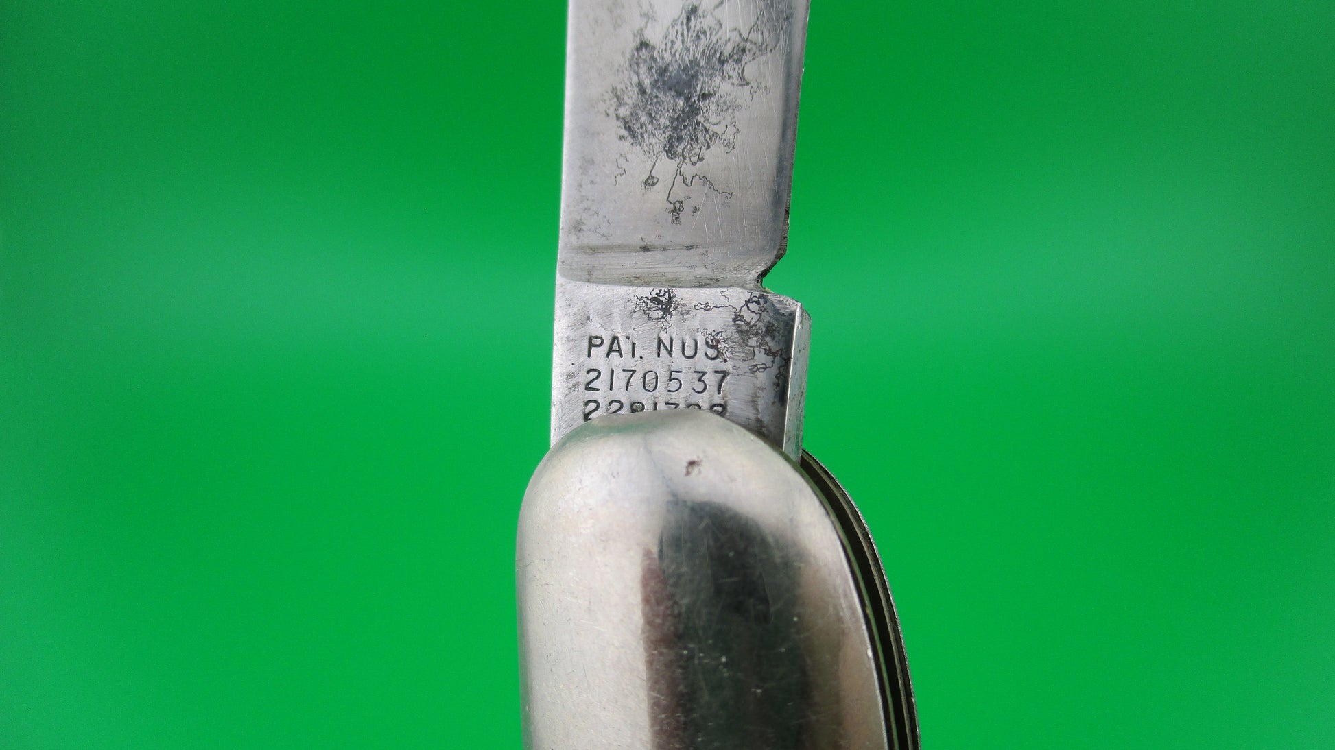 Vintage Hammer Brand toothpick switchblade knife made by the Imperial Knife Co of Providence,RI in the 1950s and designated the model JM90PB. The knife measures 4.25 inches closed and 7 5/8 inches open with brass liners and nickel silver button. The clip blade is nearly full (99%) with some patina and scratches and is stamped Hammer Brand USA with picture of an arm holding a hammer on the front and PAT NOS over two patent numbers on the back ending in 37 & 82. The scales are hollow steel wrapped in candystripe celluloid with slight diagonal pattern on the front and in good condition. The knife works well with blade tip even with the liners when closed, opens strong and very good lockup. It does Not rattle if shaken when open. Safety works. EX condition