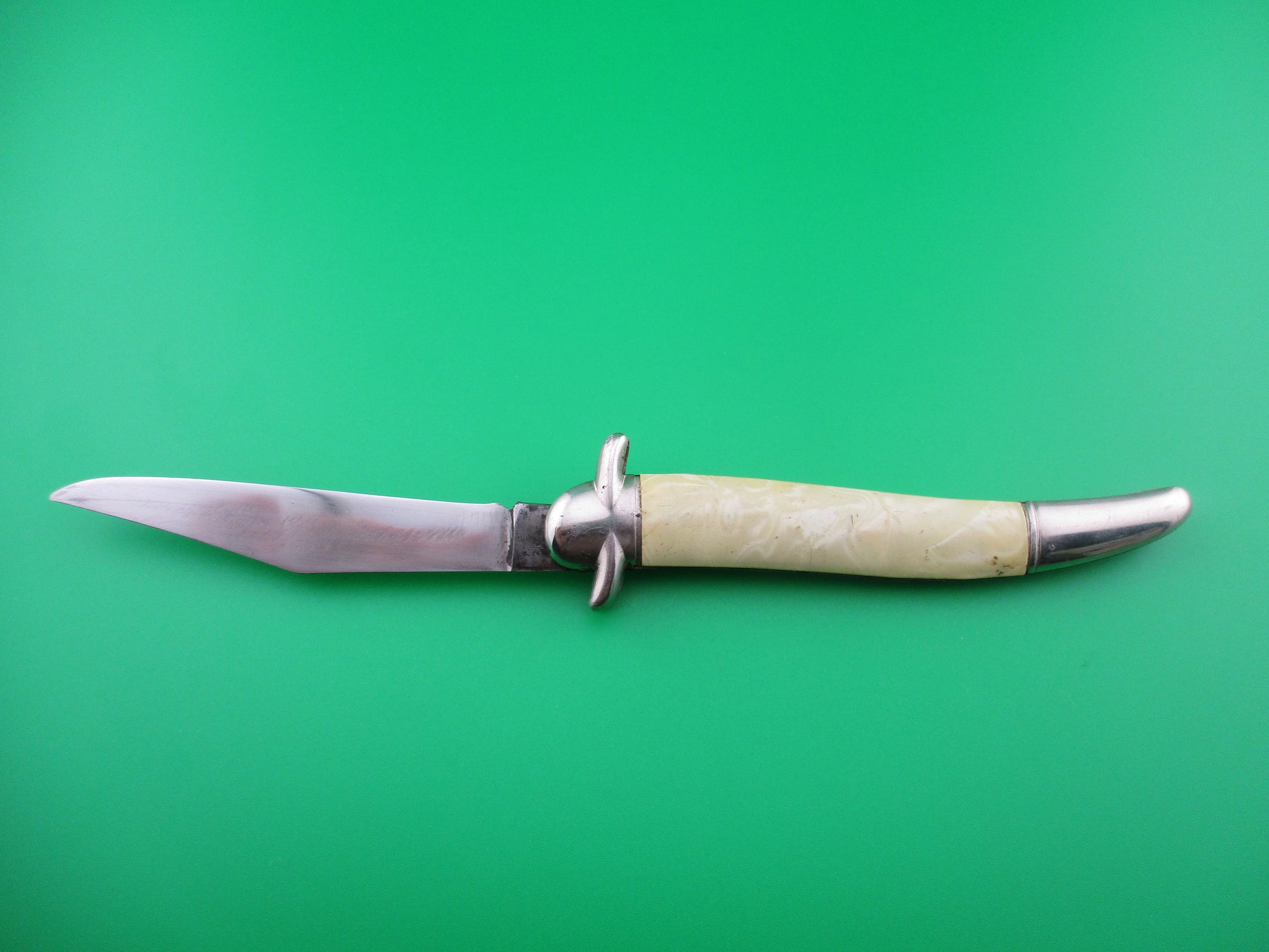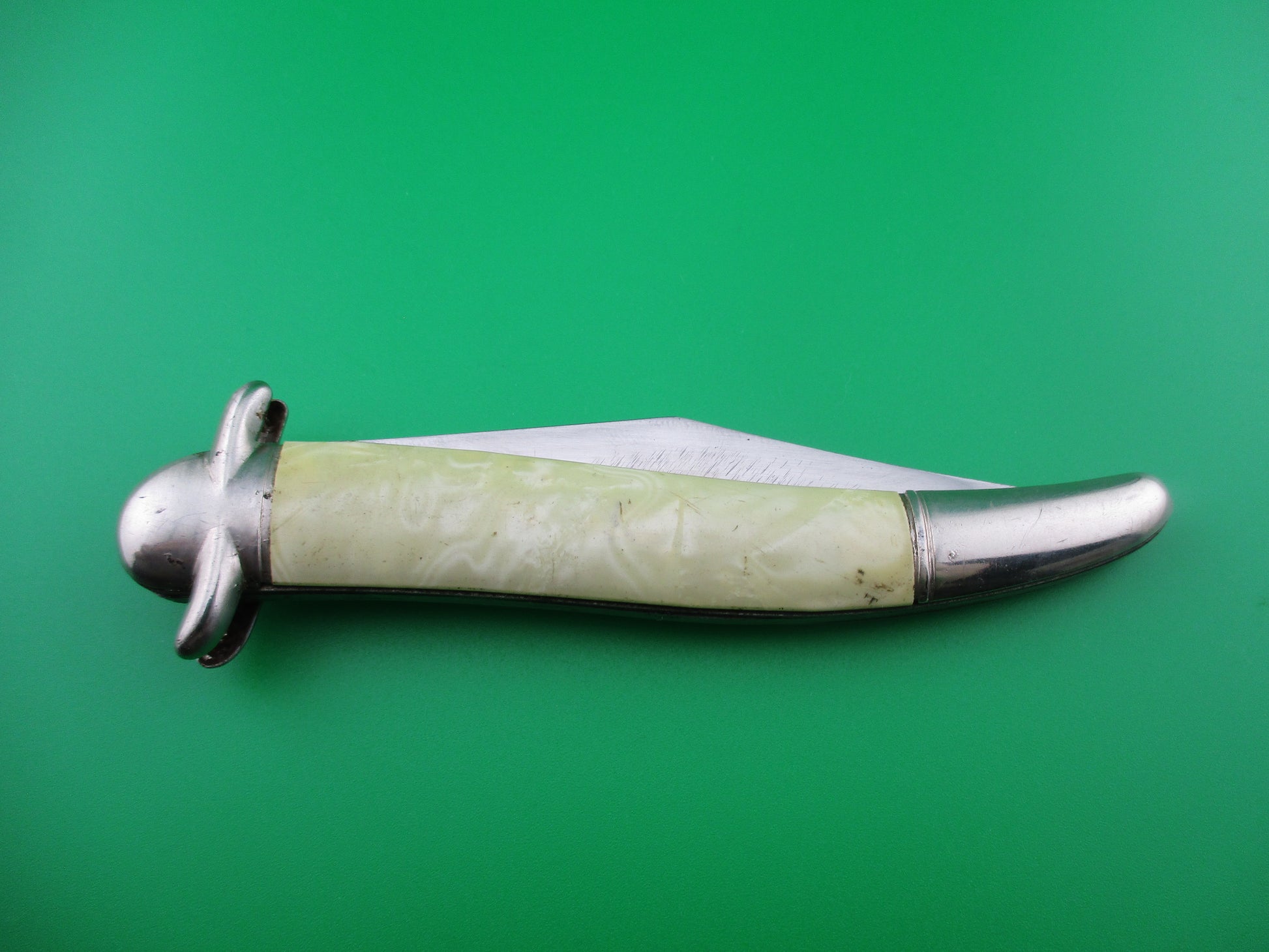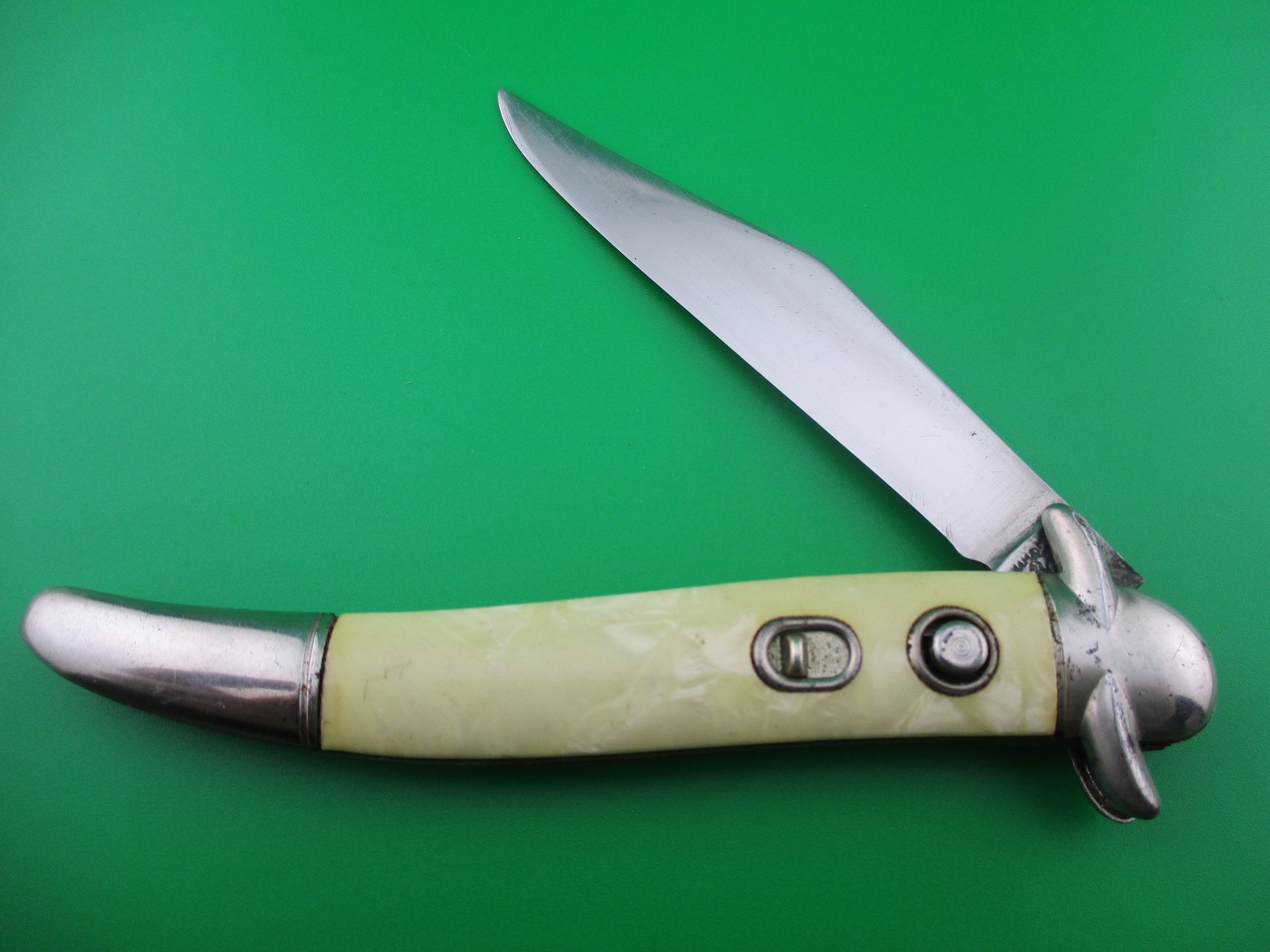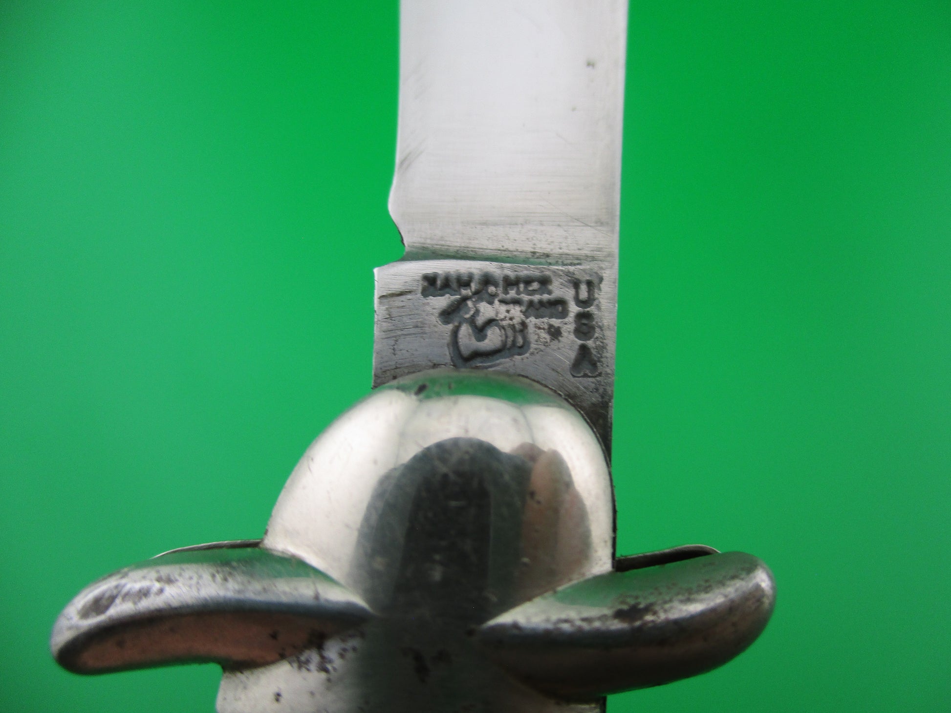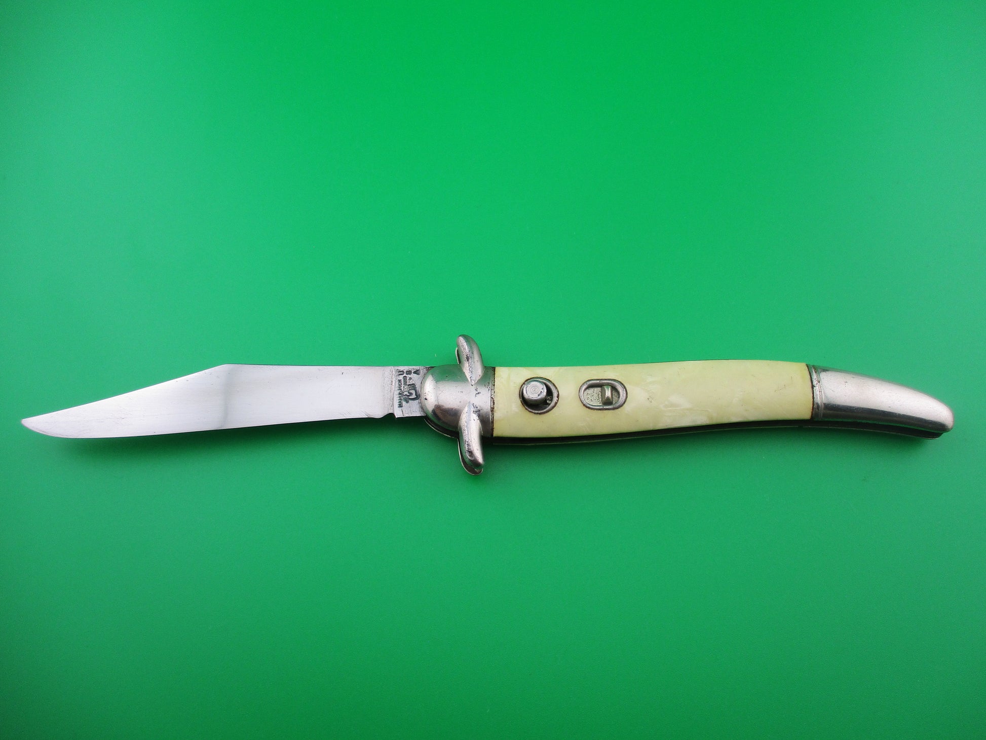 This is a Hammer Brand toothpick made by the Imperial Knife Co of Providence,RI in the 1950s. The knife measures 4.25 inches closed and 7 5/8 inches open and is stamped Hammer Brand USA with picture of an arm holding a hammer on the front and PAT NOS over two patent numbers on the back. This is the less common version with finger guards. The scales are hollow steel wrapped in Faux pearl (cracked ice) celluloid and are in very good condition. The blade is 96% full and shiny with some light scratches and minor scuffs. The knife works well with blade tip sitting deep when closed, opens strong and locks open with a little movement each way. Barely rattles if shaken when open with approx 1/8 inch up and down and very slight side to side. The knife is in EX condition and is a really nice example of a working vintage American guarded toothpick switchblade from the early 1950s. 100% money back guarantee including return shipping if not happy with this knife.