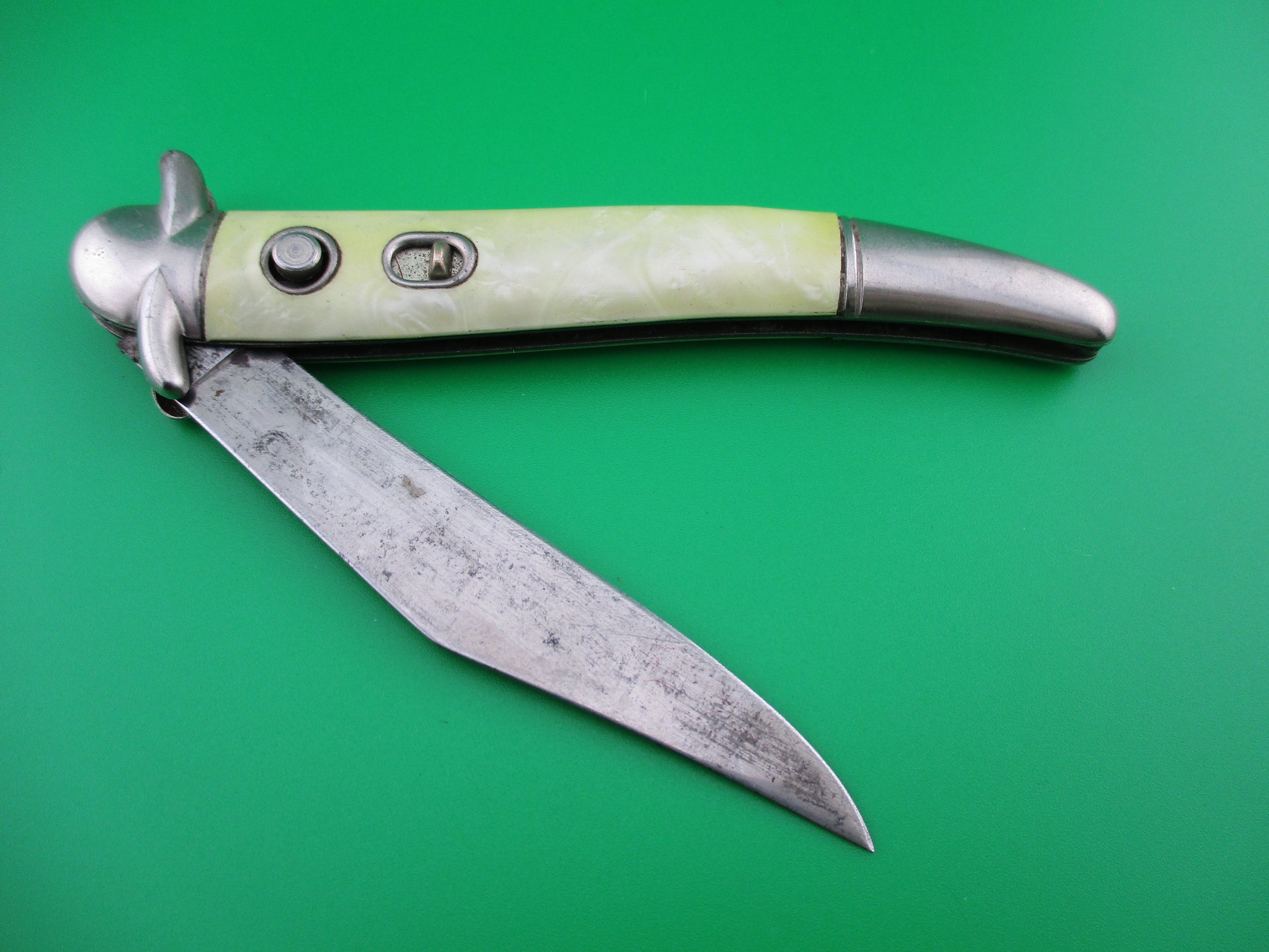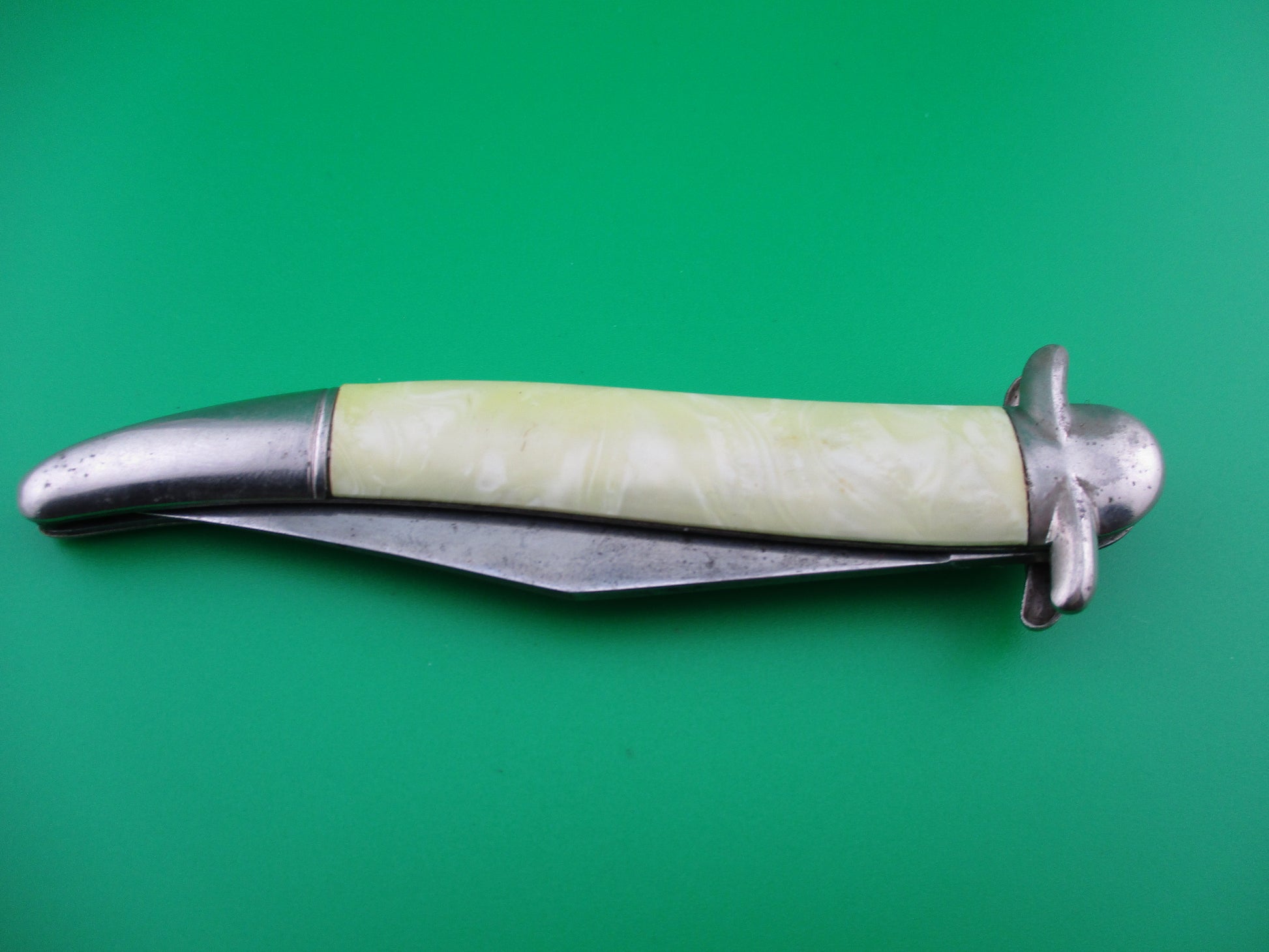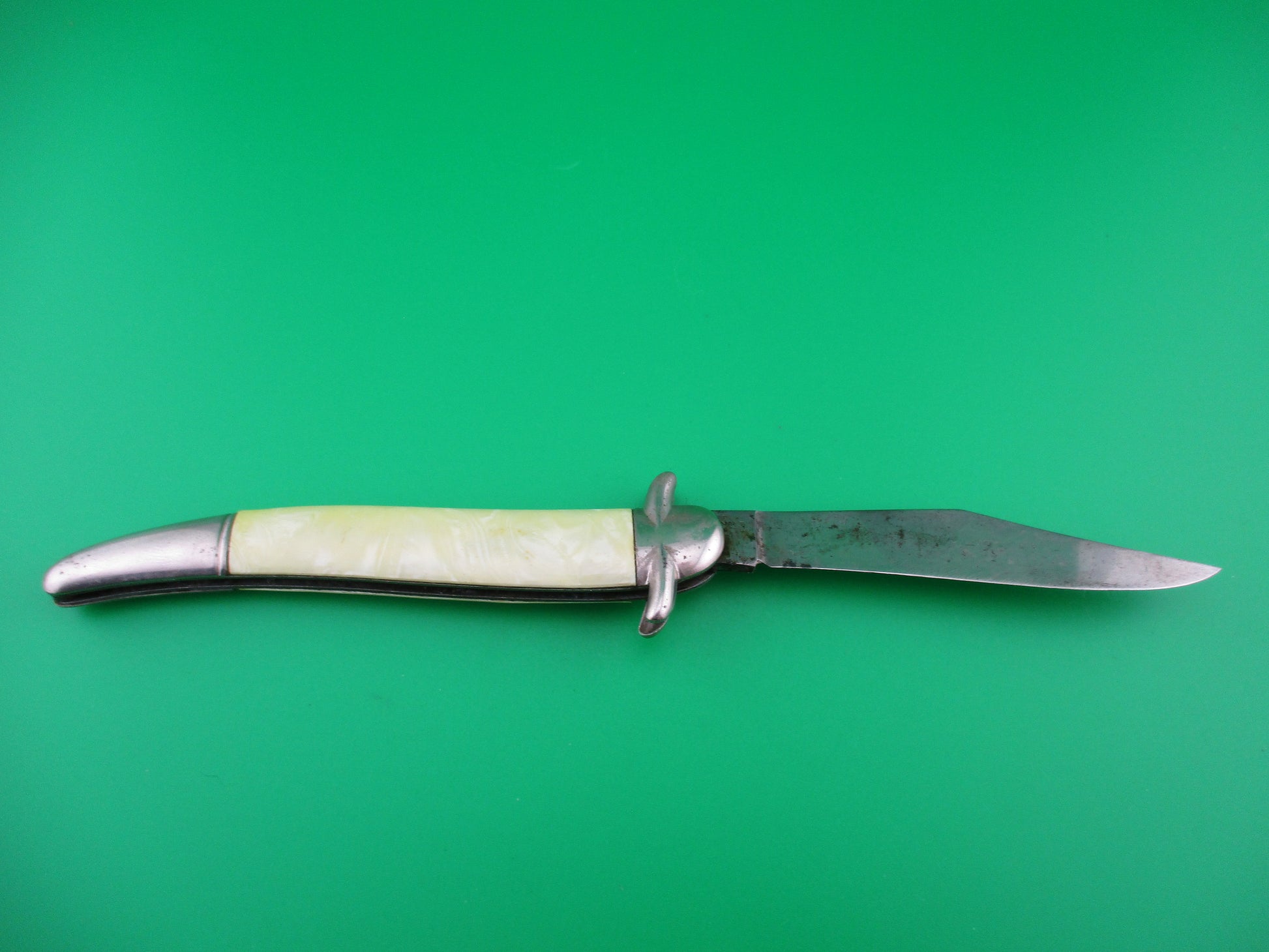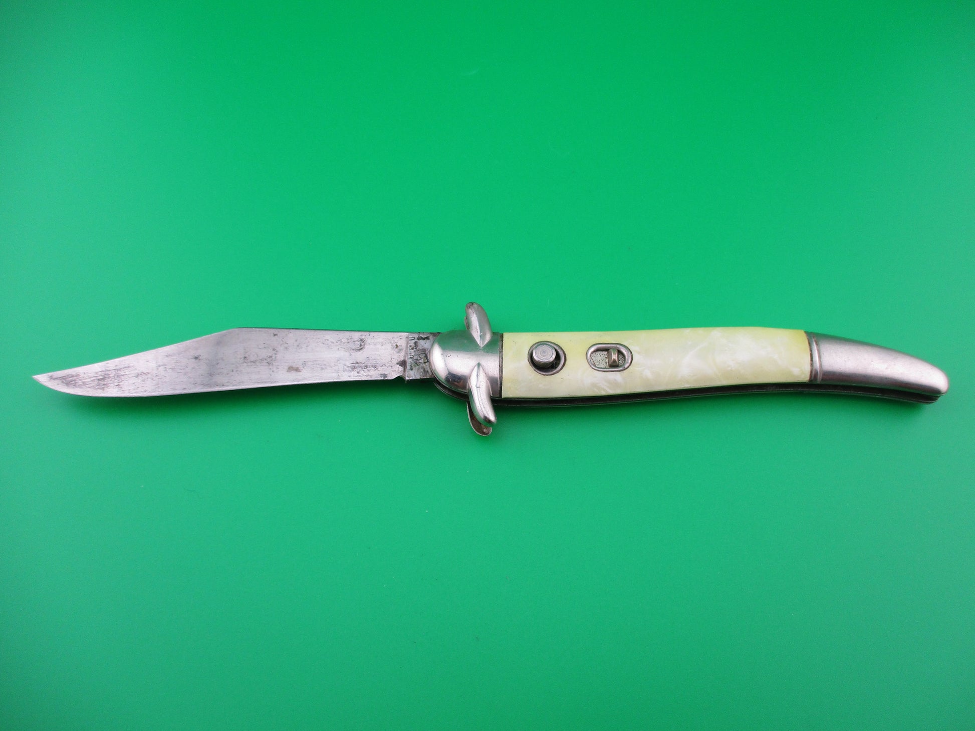 Vintage Hammer Brand toothpick made by the Imperial Knife Co of Providence,RI in the 1950s. The knife measures 4.25 inches closed and 7 5/8 inches open with brass liners. The blade is stamped Hammer Brand USA with picture of an arm holding a hammer on the front and PAT NOS over two patent numbers on the back. The blade is 99% full with light patina and some light scratches. This is the less common version with finger guards. The scales are hollow steel wrapped in Faux pearl (cracked ice) celluloid and are in very good condition. The knife works well with blade tip sitting deep when closed, opens strong and locks open with a little movement each way. Does not rattle if shaken when open. The knife is in EX condition and is a really nice example of a working vintage American guarded toothpick switchblade from the early 1950s. 100% money back guarantee including return shipping if not happy with this knife.