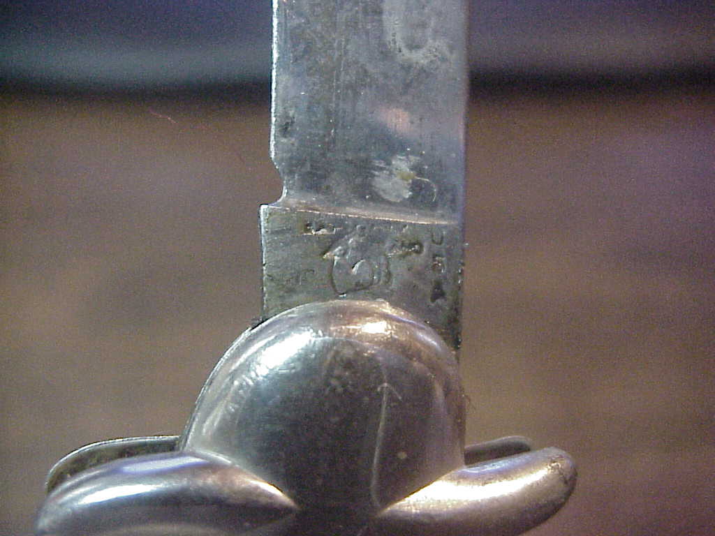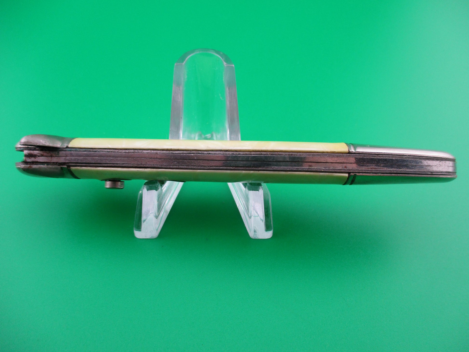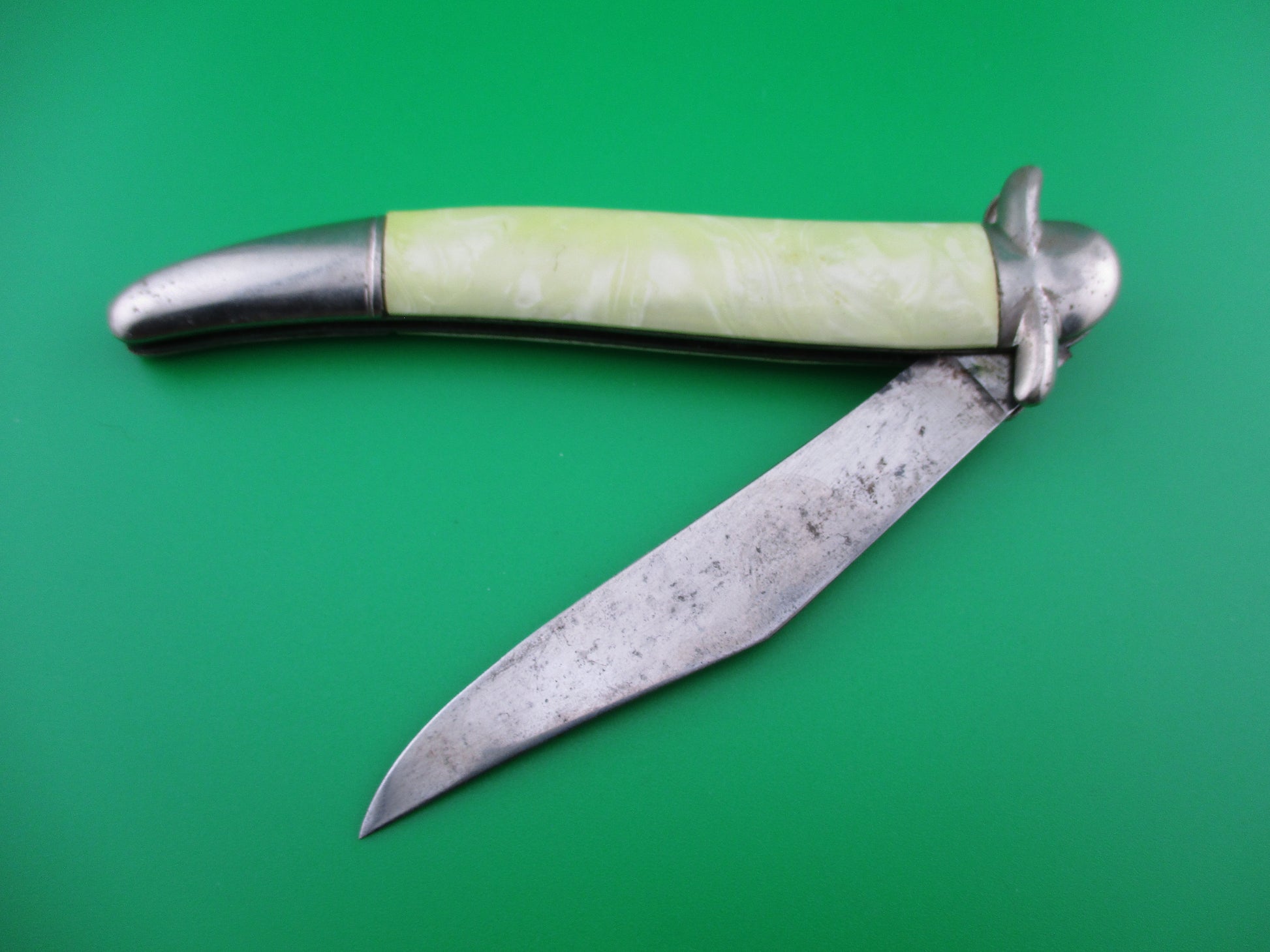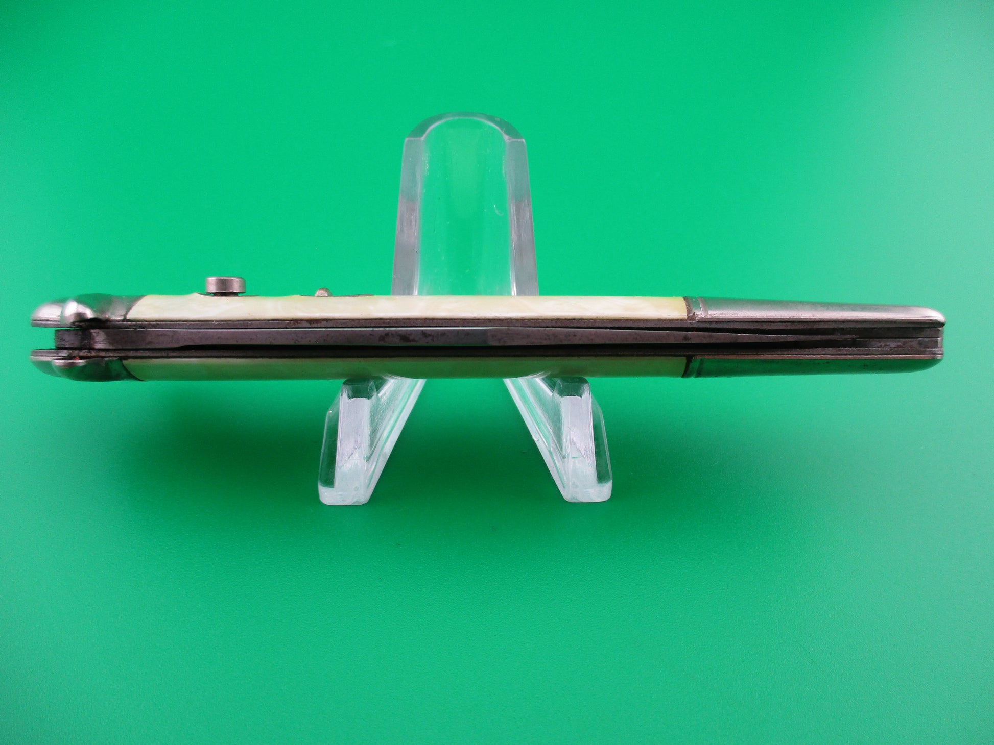 Vintage Hammer Brand toothpick made by the Imperial Knife Co of Providence,RI in the 1950s. The knife measures 4.25 inches closed and 7 5/8 inches open with brass liners. The blade is stamped Hammer Brand USA with picture of an arm holding a hammer on the front and PAT NOS over two patent numbers on the back. The blade is 99% full with light patina and some light scratches. This is the less common version with finger guards. The scales are hollow steel wrapped in Faux pearl (cracked ice) celluloid and are in very good condition. The knife works well with blade tip sitting deep when closed, opens strong and locks open with a little movement each way. Does not rattle if shaken when open. The knife is in EX condition and is a really nice example of a working vintage American guarded toothpick switchblade from the early 1950s. 100% money back guarantee including return shipping if not happy with this knife.