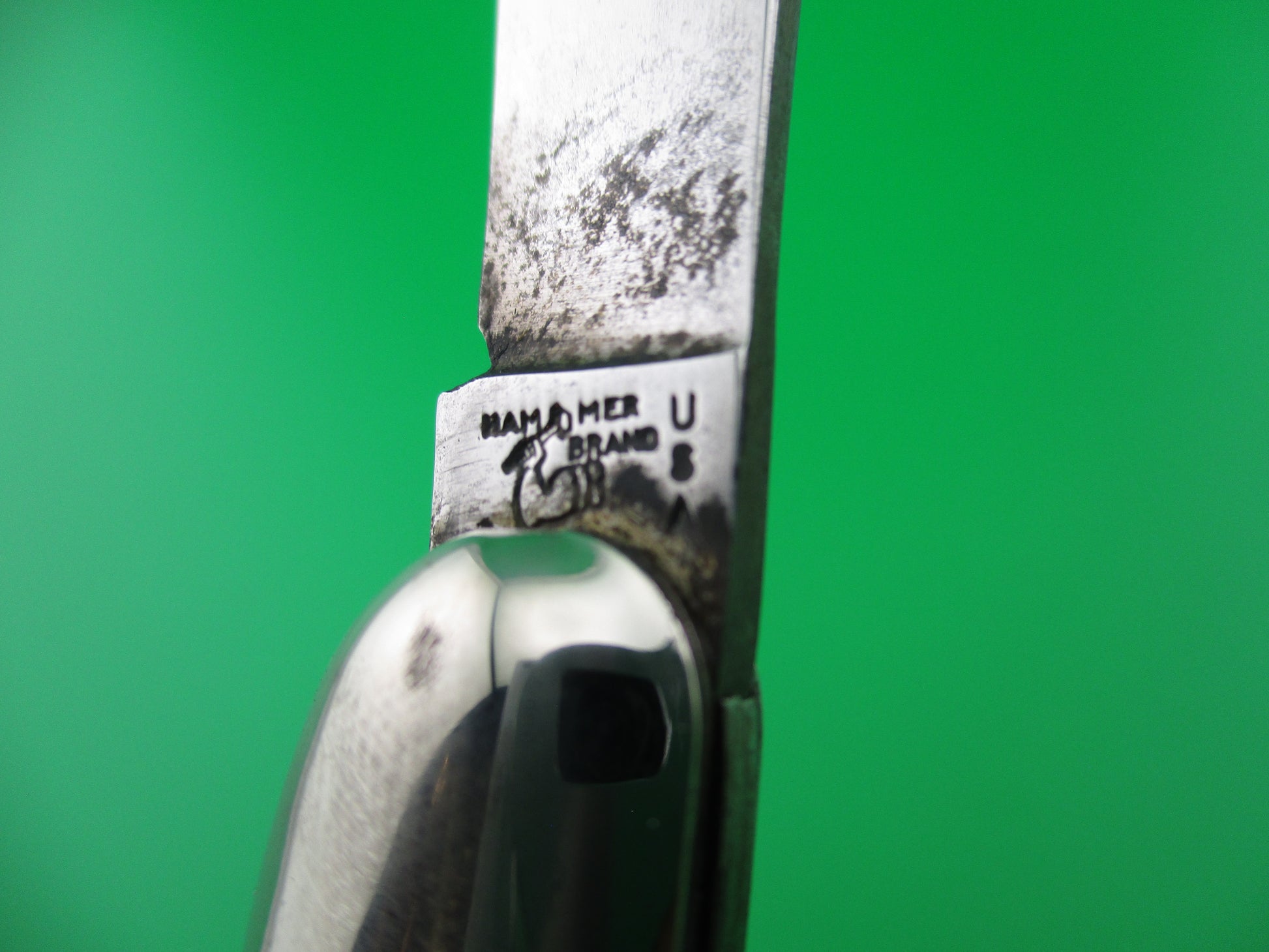 Vintage Hammer Brand toothpick style switchblade made in Providence, RI in the 1950s by the Imperial Knife Co and designated model #JM-90-PBC. This knife measures 4.25 inches closed and 7 5/8 inches open and has steel liners. The scales are hollow metal wrapped in Silver Pearl blue swirl celluloid. The blade is full and shiny with some light spotting. It's marked Hammer Brand USA on the front with a picture of an arm holding a hammer. The back is marked with 2 patent numbers. The knife works well. Blade tip seats deep, opens fully and locks up nicely with just a little movement each way. Nice old American fisherman's switchblade in EX condition.