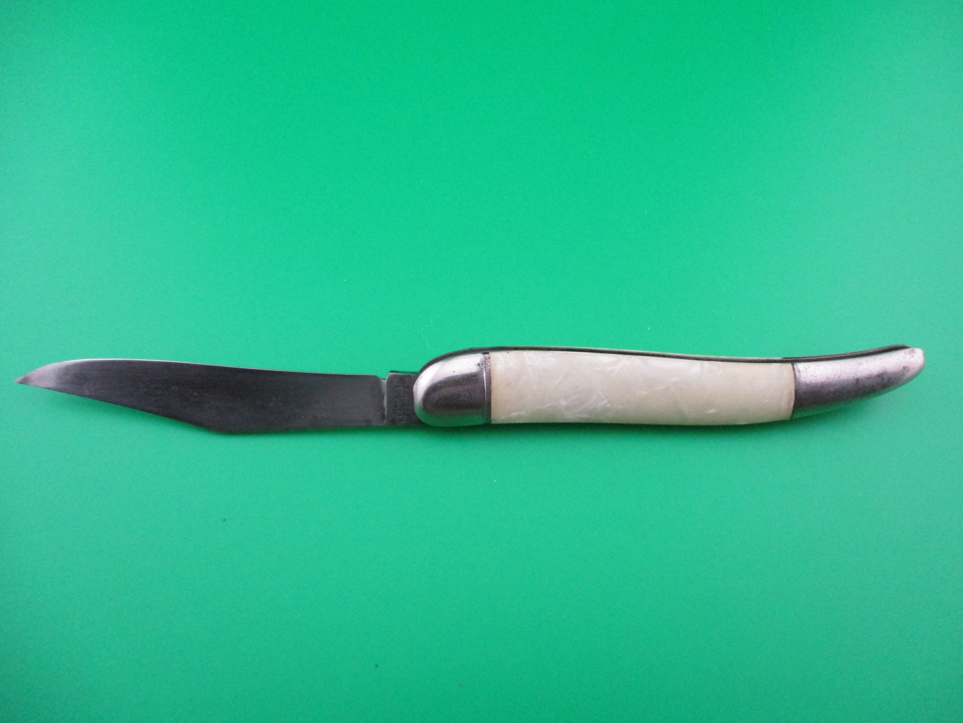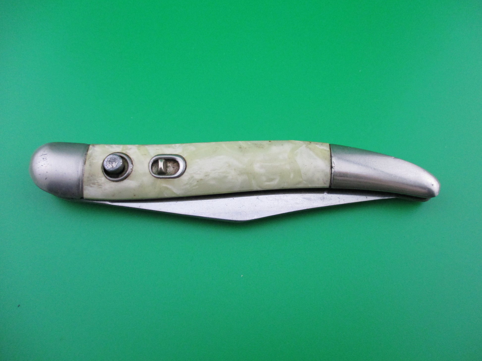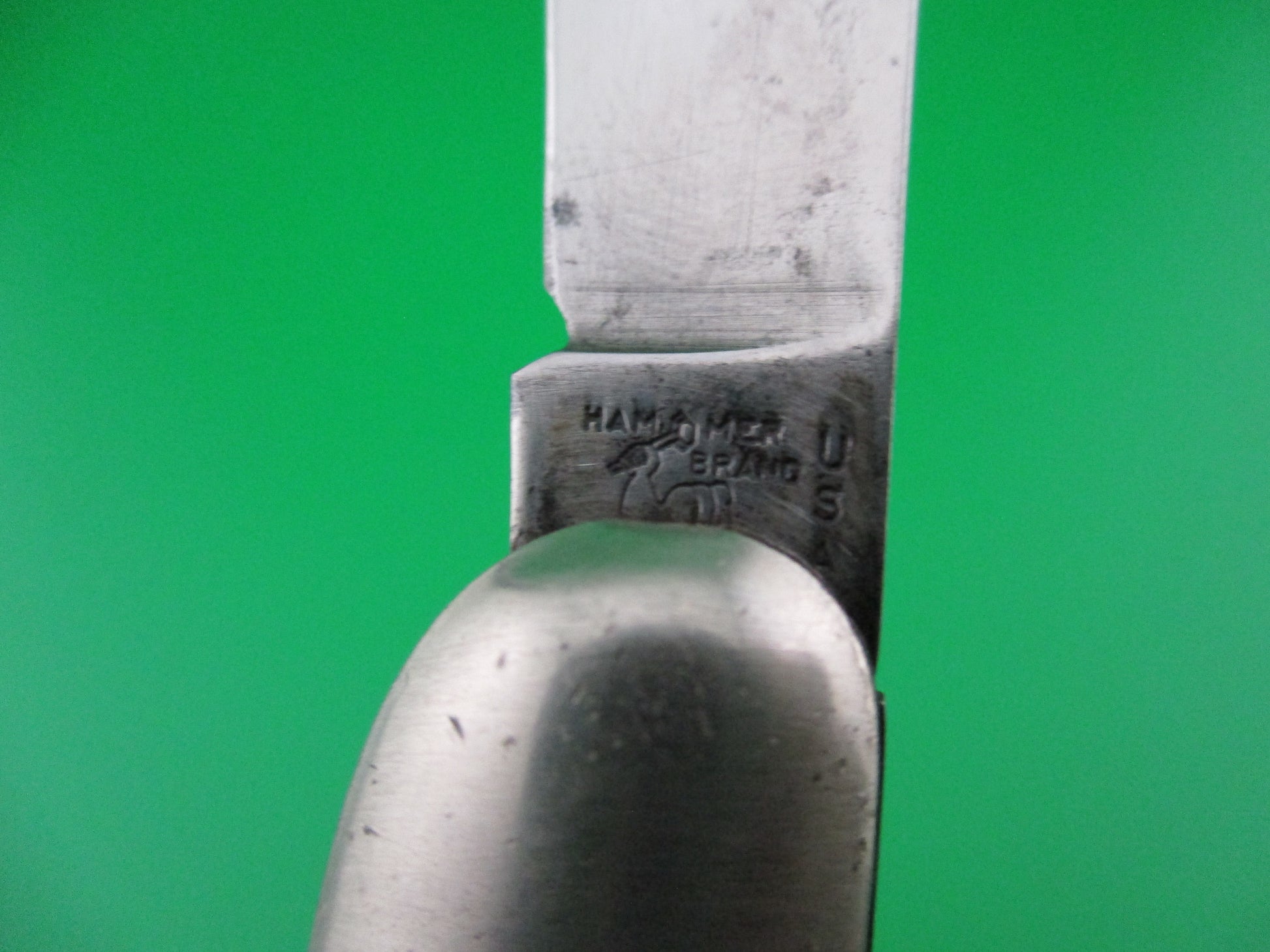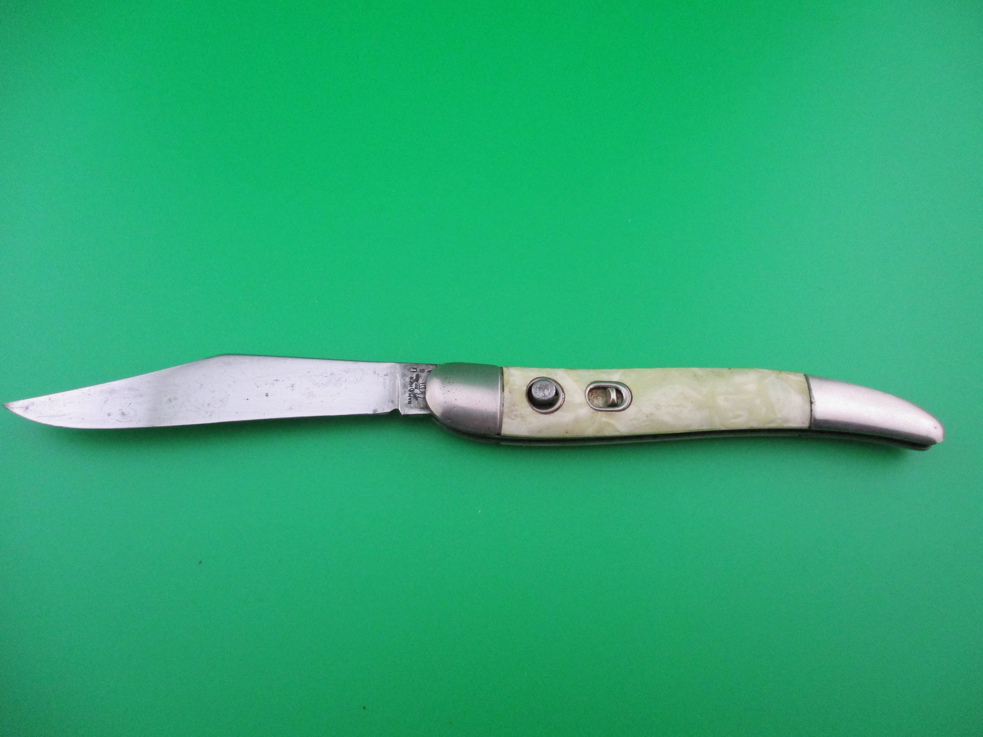 Imperial Hammer Brand toothpick switchblade made by the Imperial Knife Co of Providence, RI in the 1950s. The scales are commonly referred to as "cracked ice" and are hollow steel wrapped in a thin layer of celluloid. The knife measures 4.25 inches closed and 7 5/8 inches open with steel liners. Stamped Hammer Brand USA with a picture of an arm holding a hammer on the tang and 2 sets of patent numbers on the rear. The blade is full with most of the original factory finish with a couple of pepper spots. Works well with blade tip seating below the liners, good snap and above average lockup for a used Hammer Brand. Does rattle if shaken with blade open, as most of these do with a lot of use. Safety works.