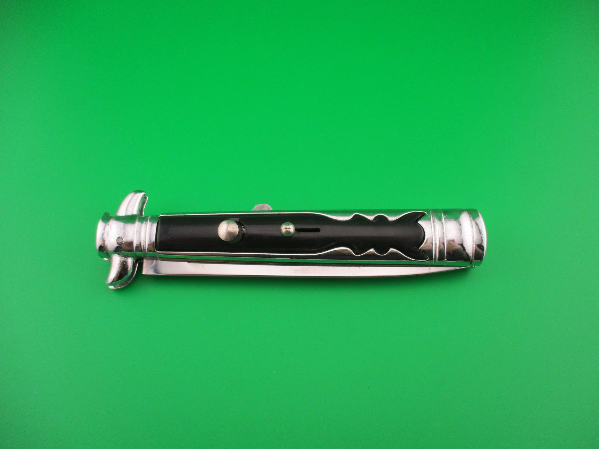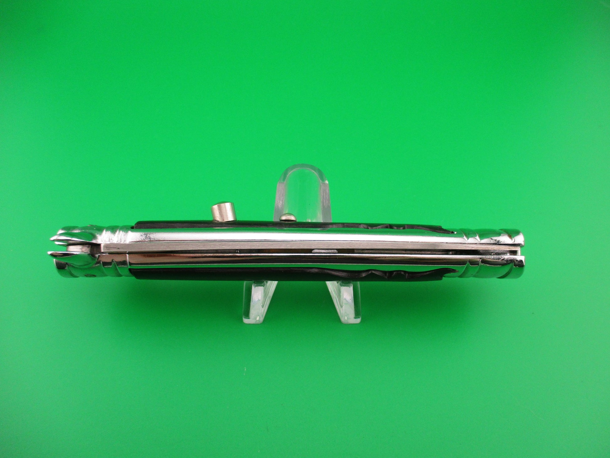 Hellraiser 25cm Spanish lockback Automatic knife fixed guard version made in Spain in the 1970s or 80s. This is the fixed guard version of the famous Hellraiser switchblade and the blade is fired by a coilspring. It measures 24.5cm (9.65 inches) open and 5 1/8 inches closed with chrome plated brass liners, bolsters, button & safety cap. The flat grind blade is 99% full or better with original finish and no stamp. The black synthetic scales are in very good condition with a few scratches. The knife works Great with blade tip below the liners closed, strong snap and very good lockup with a little up and down that springs back when you let go. Does not rattle when shaken with blade open except for button. Safety works. EX+ condition.
