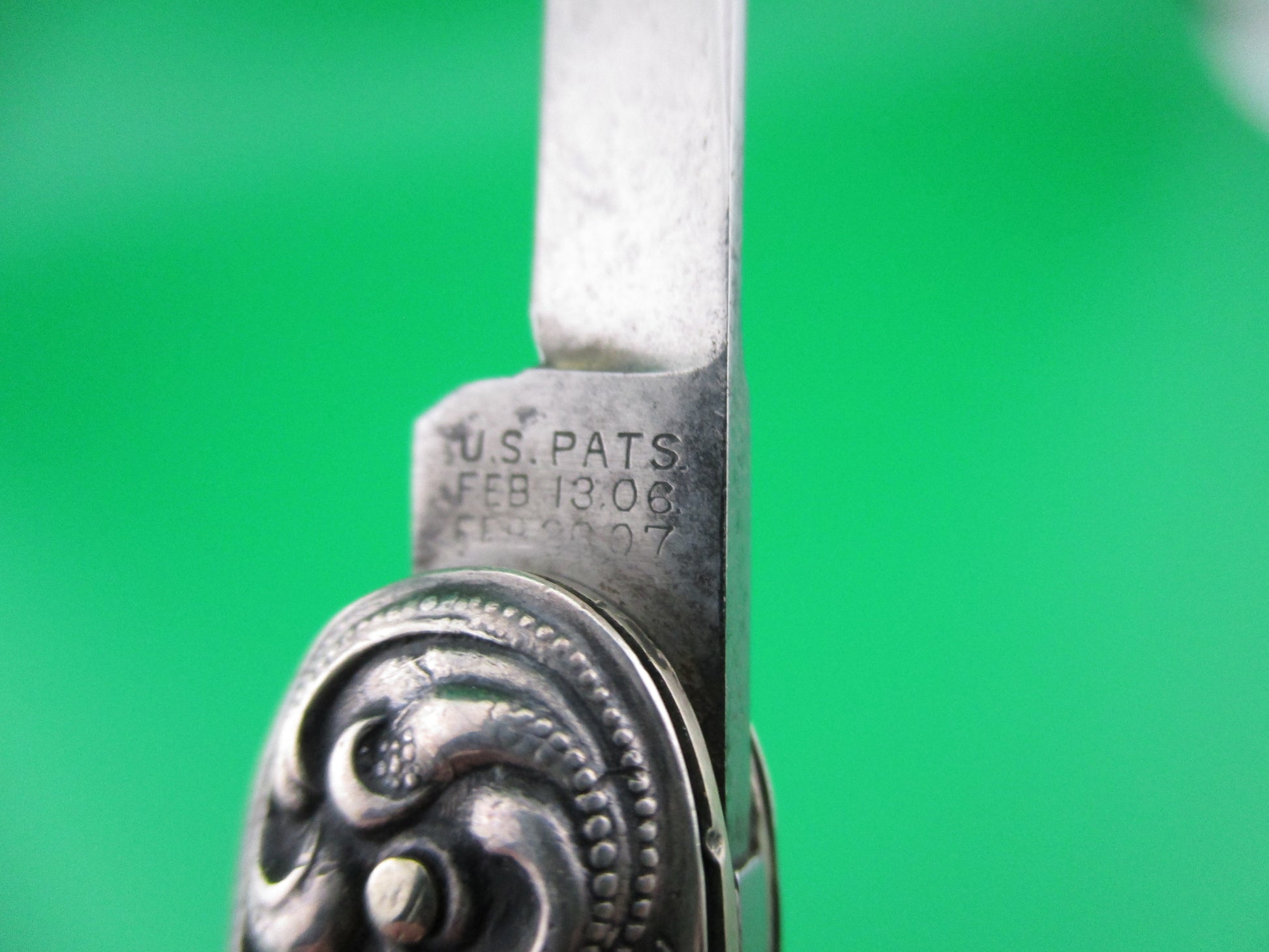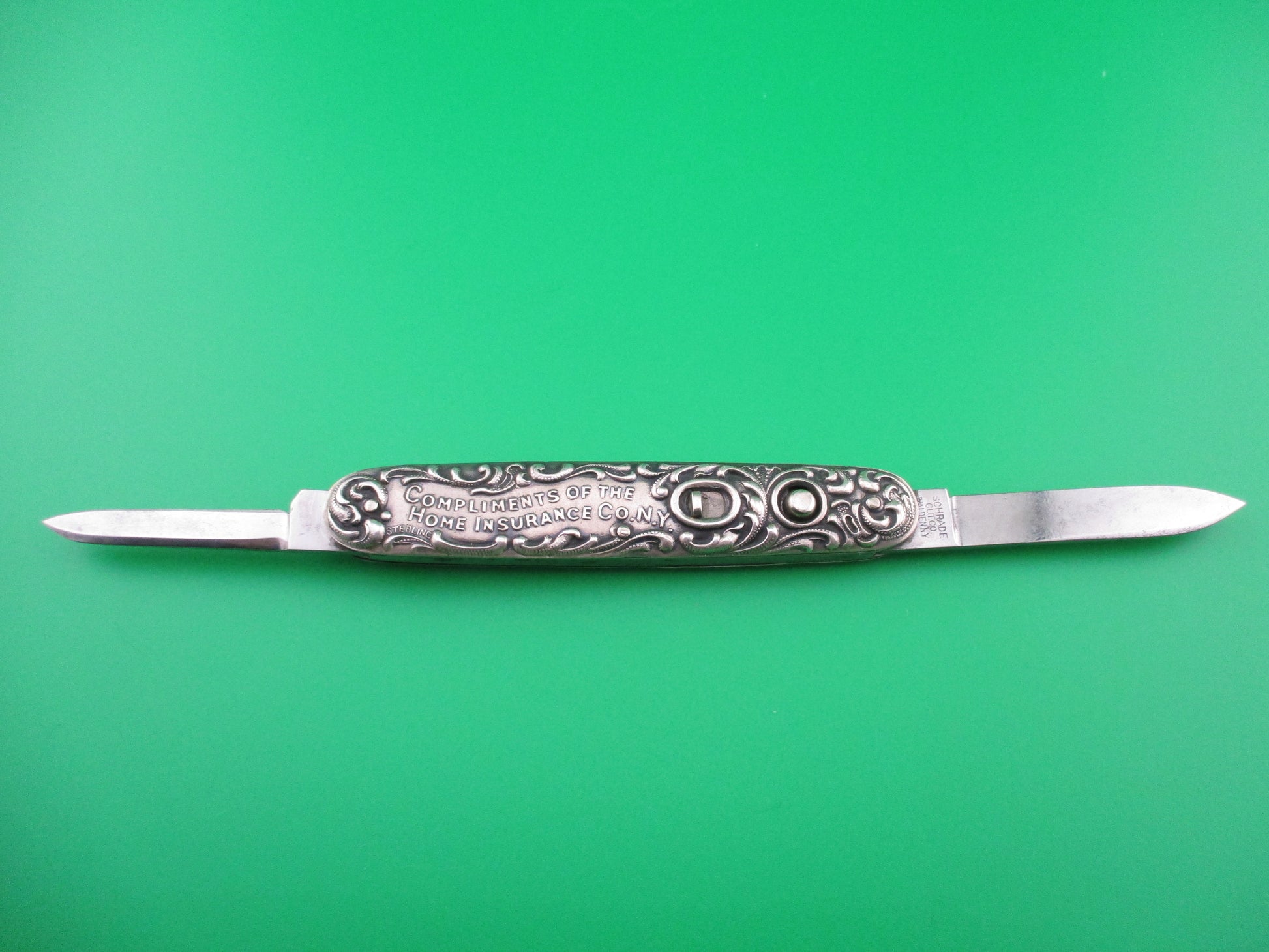 Schrade Cut Co medium double with Sterling silver deluxe scroll scales with Compliments of the Home Insurance Co, NY embossed on the front scale. Very nice example of an early Schrade double with 1906 and 1907 patent dates on the small blade. Most likely made before 1910. Main blade stamped Schrade Cut Co Walden, NY. Measures 3 3/8 inches closed and a hair over 7 inches open with nickel silver liners. Blades are both nearly full with nice finish and it works great with both blades seating good closed, good snap and tight lockup. The small blade does have bounce back, as most of these old doubles did/do, but locks up tight once locking into open position. Great old knife to add to your collection!