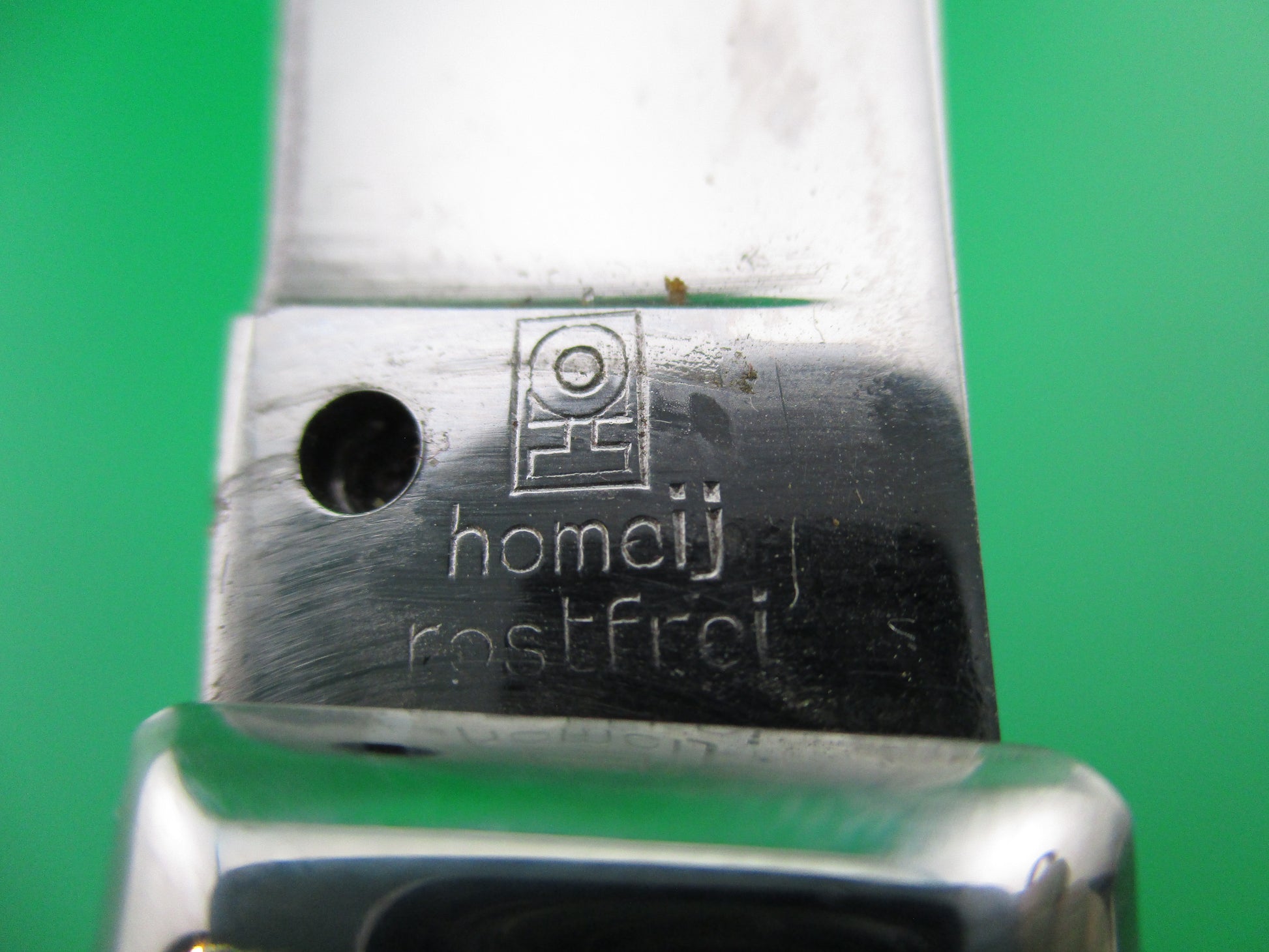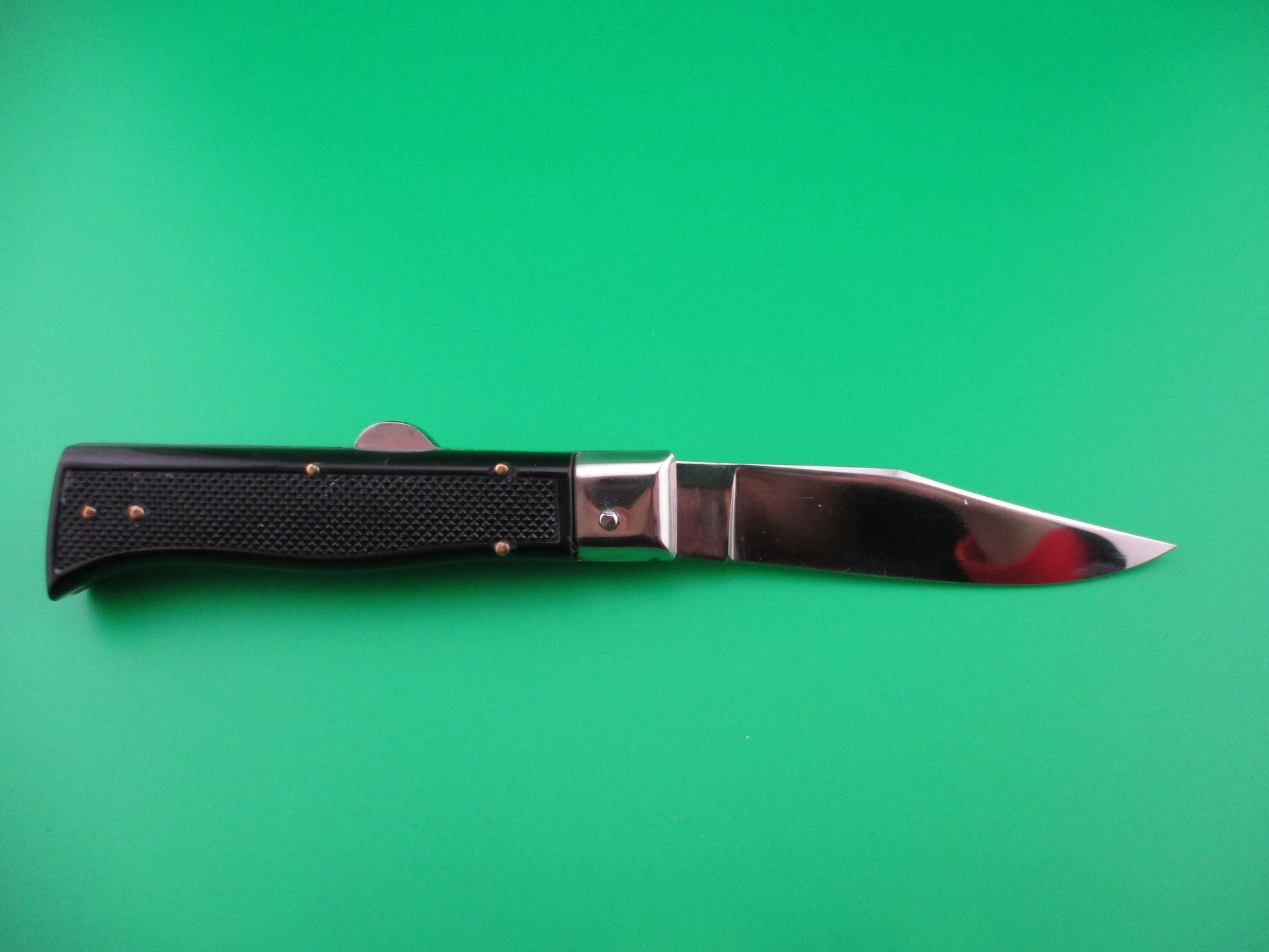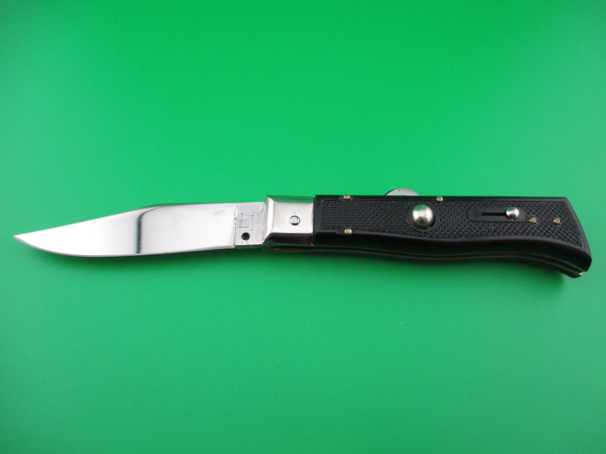 Homeij Rostfrei 20cm Humpback automatic knife. Homeij is an importer/exporter located in Belgium and I believe that this knife was made in France. The knife measures 20cm (8 inches) open with brass liners & nickel silver bolsters and button. The flat grind clip blade is full and retains all of the factory finish and is stamped Homeij Rostfrei with a few light scratches. The black plastic checkered scales are in excellent condition. The knife works great with blade tip seating deep, good snap and tight lockup. Safety works. EX++ condition.