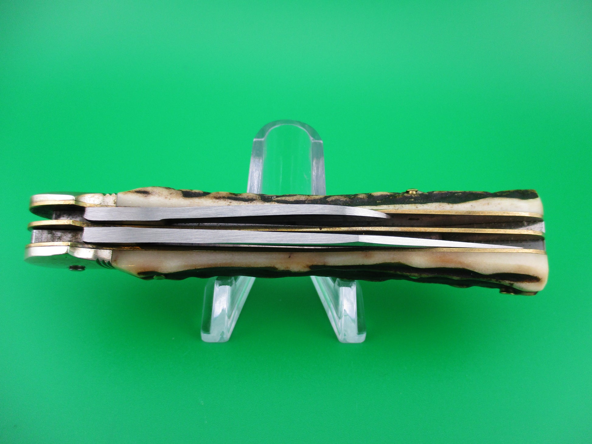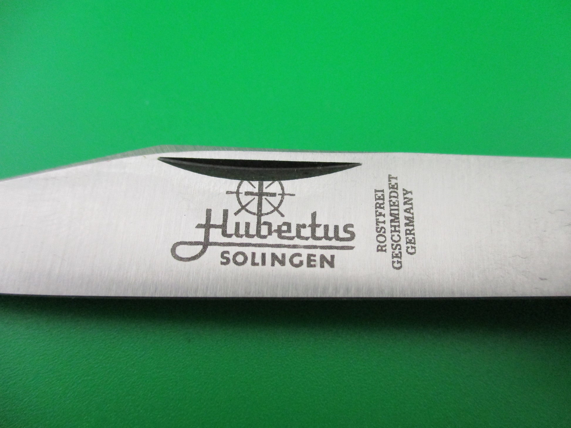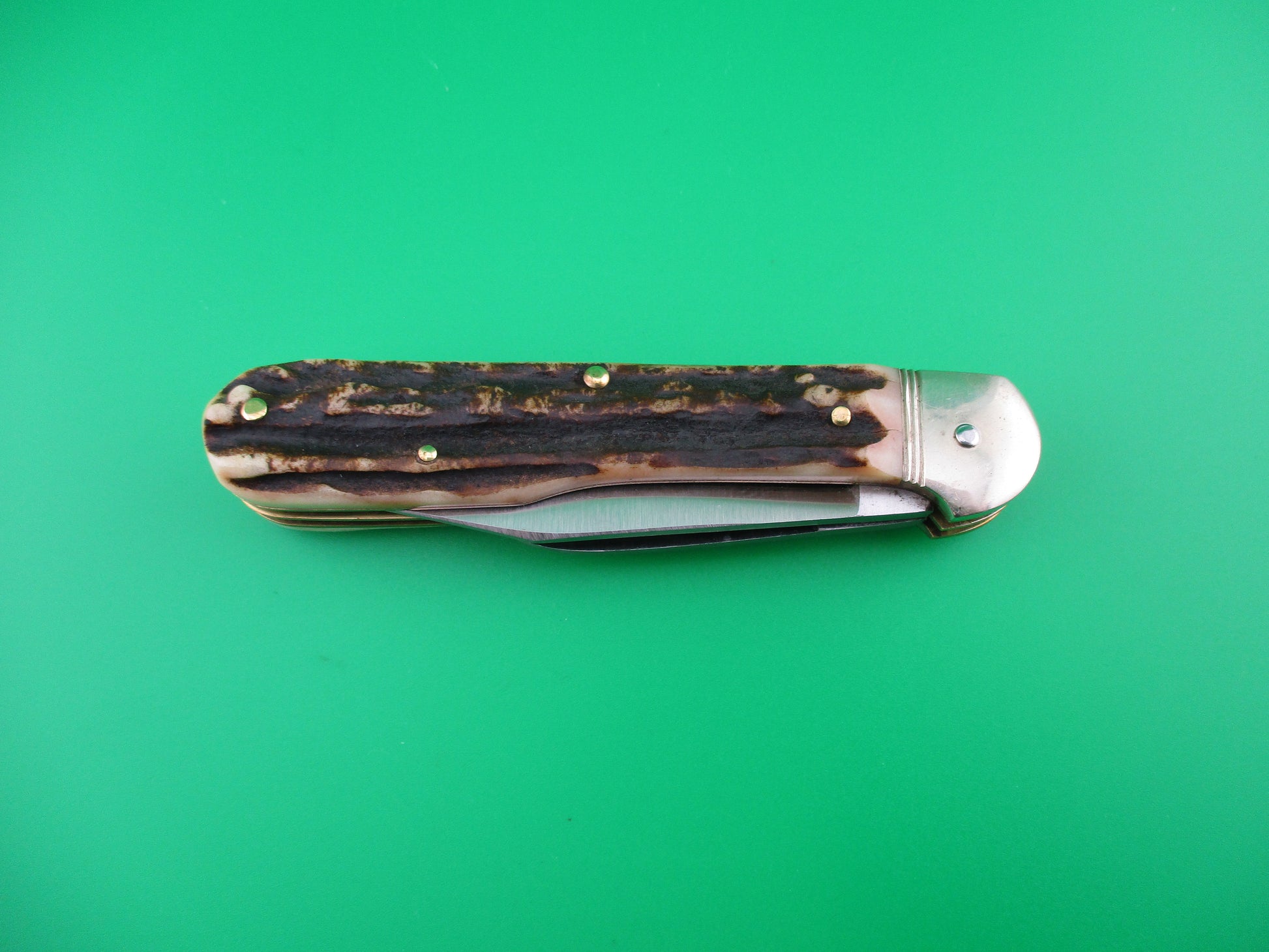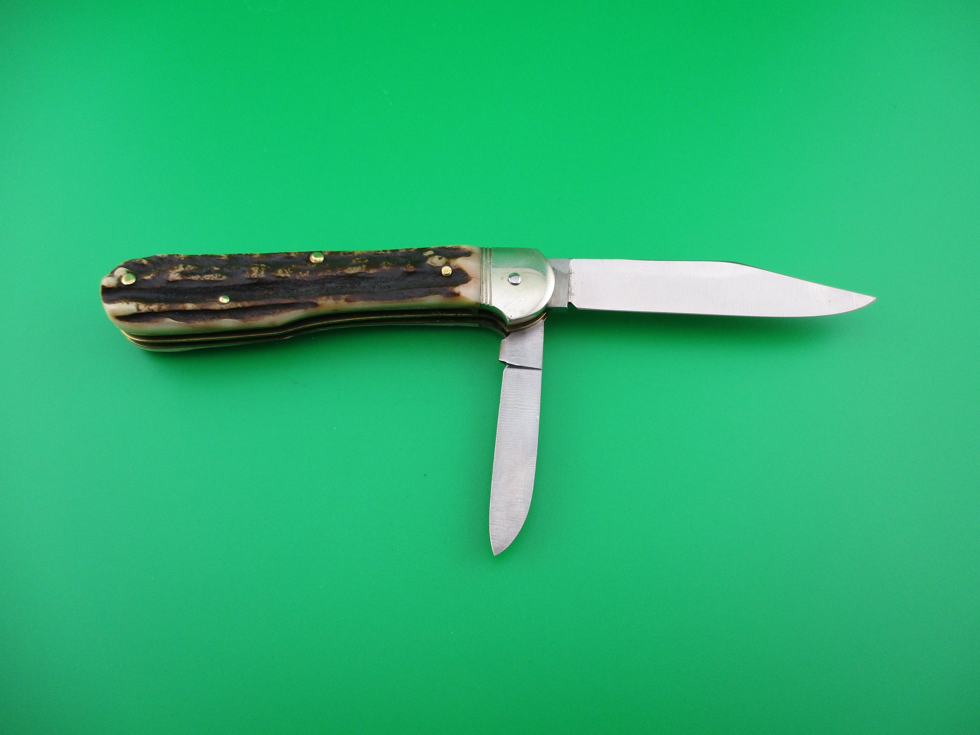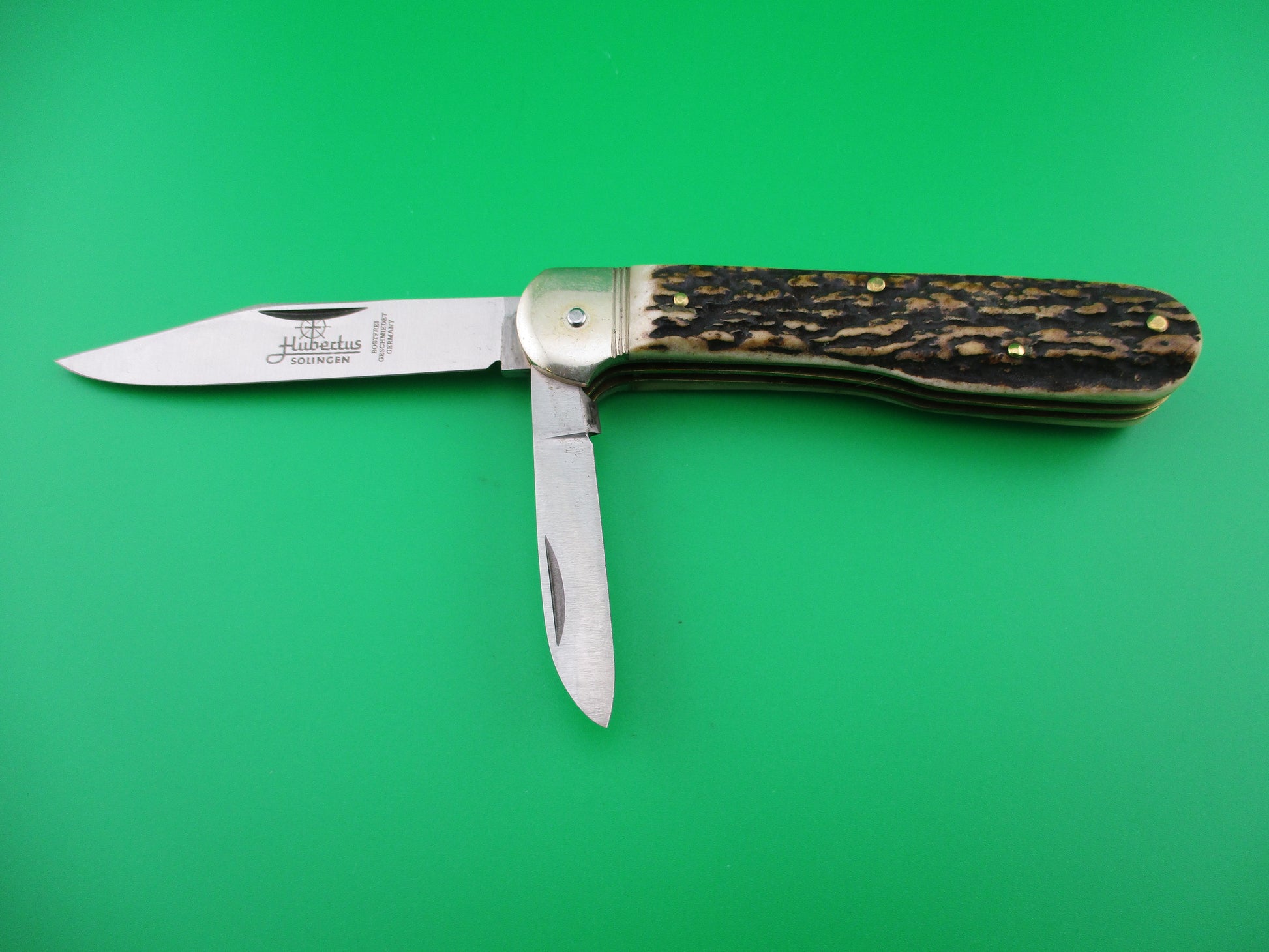 Hubertus 10cm Pen Blade Release stag automatic knife. Measures just over 10cm closed and18cm (7 1/8 inches) open with brass liners and German (nickel) silver bolsters. It has two blades, one manual and one automatic. Both blades are 100% full with original finish. Automatic blade is marked Hubertus Solingen Rostfrei Gueschmiedet Germany with Hubertus symbol. Pen blade is unmarked. Stag scales (handles) are very nice with no flaws. The main clip blade pops open when you push down on the smaller pen blade. Press again to release to close. Nearly new condition.