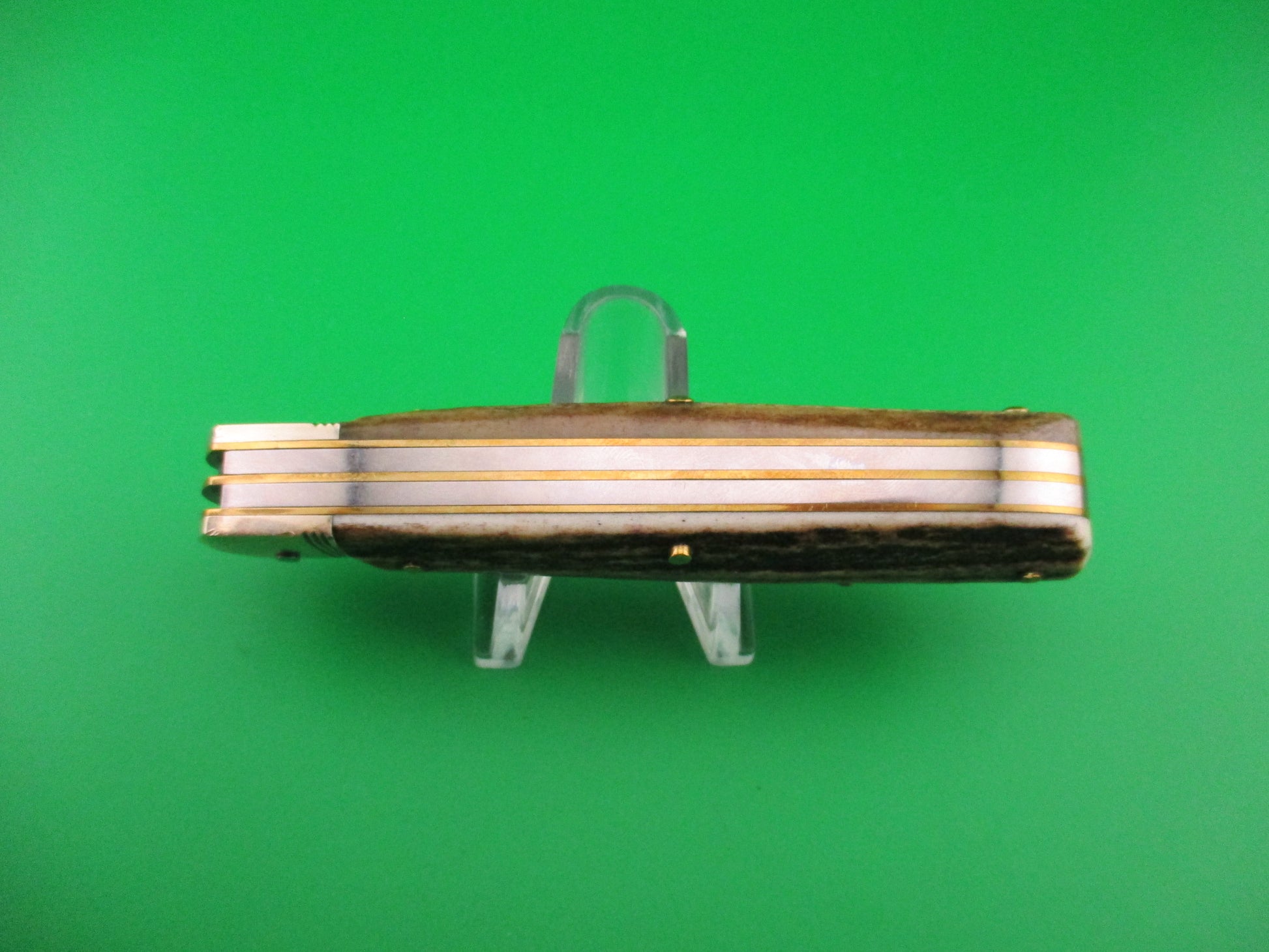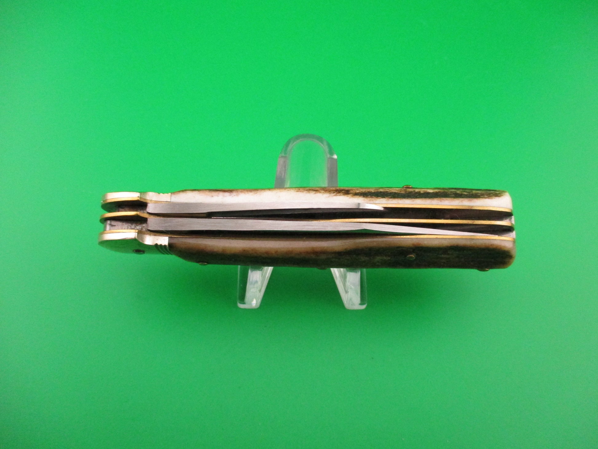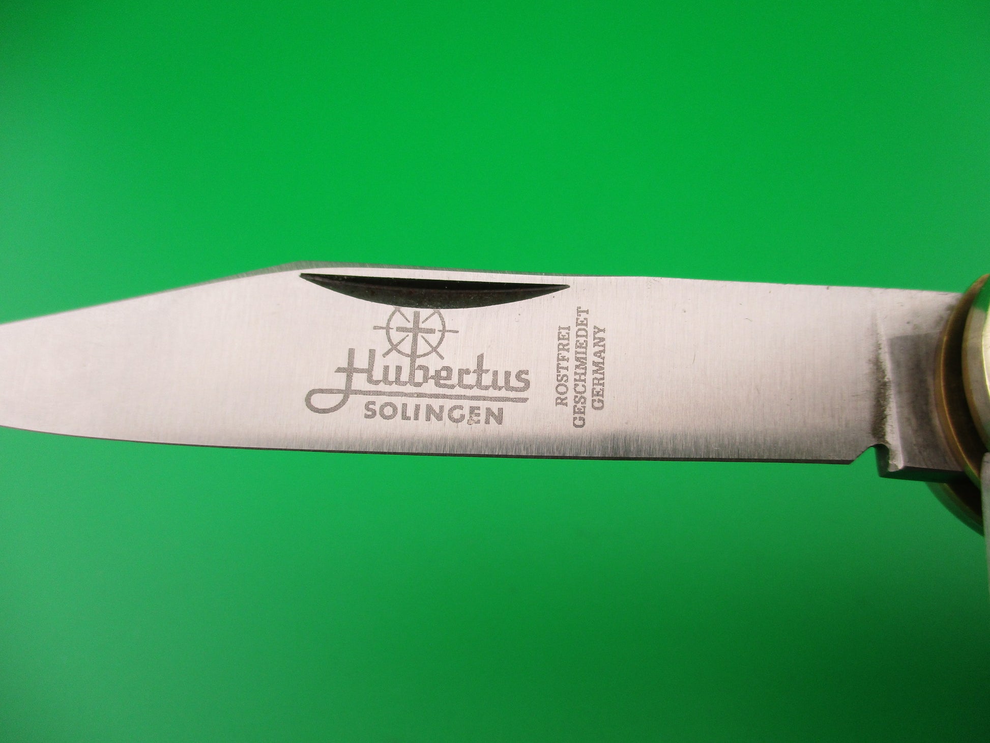 Hubertus SOLINGEN 10cm German Pen Blade Release stag automatic knife made in Germany sometime after 1989. The knife measures 10.4cm closed and18.3cm (7 3/16 inches) open with brass liners & pins and German (nickel) silver bolsters. It has two blades, one manual and one automatic. Automatic clip blade is 100% full with original matte finish and is etched Hubertus Solingen Rostfrei Geschmiedet Germany with Hubertus symbol and nail nick. Spear pen blade is stamped ROSTFREI with the "RO" cut off from blade grind and is full, also with nail nick. Stag scales (handles) are very nice with no flaws. The main clip blade pops open when you push down on the smaller pen blade. Press again to release to close. EX+ condition.
