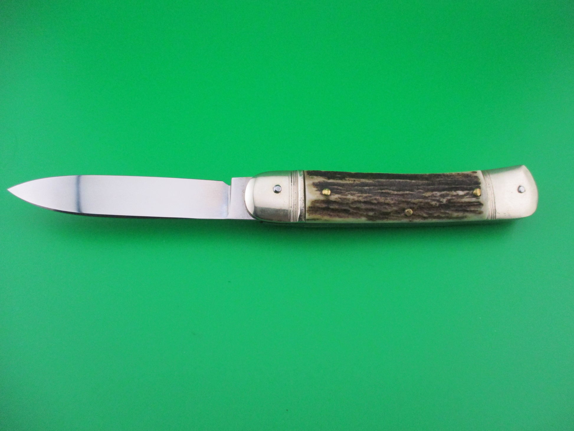 Vintage HUBERTUS SOLINGEN 11cm German Lever knife Stag W Germany automatic knife most likely made in the 1960s or 70s. This knife measures a little over 11cm closed and 19.5cm (7.75 inches) open with brass liners and German silver bolsters and lever. Blade is 100% full with original finish and is etched HUBERTUS SOLINGEN ROSTFREI W. GERMANY with nail nick. Stag scales are in excellent condition and held on by brass pins. The knife works great with blade tip deep and centered, STRONG snap and TIGHT lockup! Like New condition.