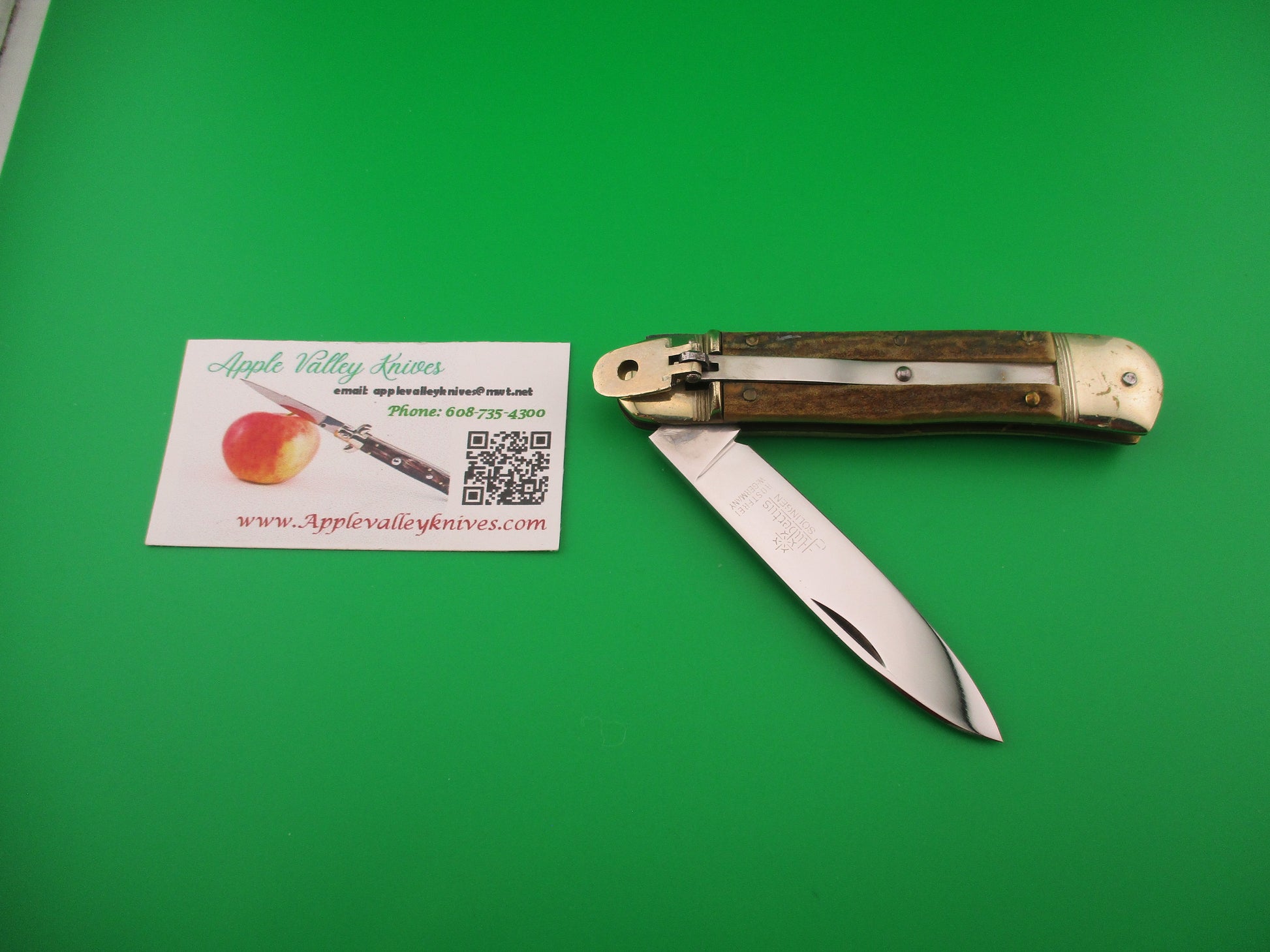 Vintage HUBERTUS SOLINGEN 11cm German Lever Stag automatic knife made in West Germany before 1989. This knife measures 11.2cm (4 3/8 inches) closed and 19.6cm (7.75 inches) with automatic blade open with brass liners and German silver bolsters and lever. Spear point automatic blade is 100% full with original finish and is etched HUBERTUS SOLINGEN ROSTFREI W-GERMANY with nail nick. Stag scales are in excellent condition and held on by brass pins. The knife works great with blade tip deep and centered, STRONG snap and TIGHT lockup! Like New condition.