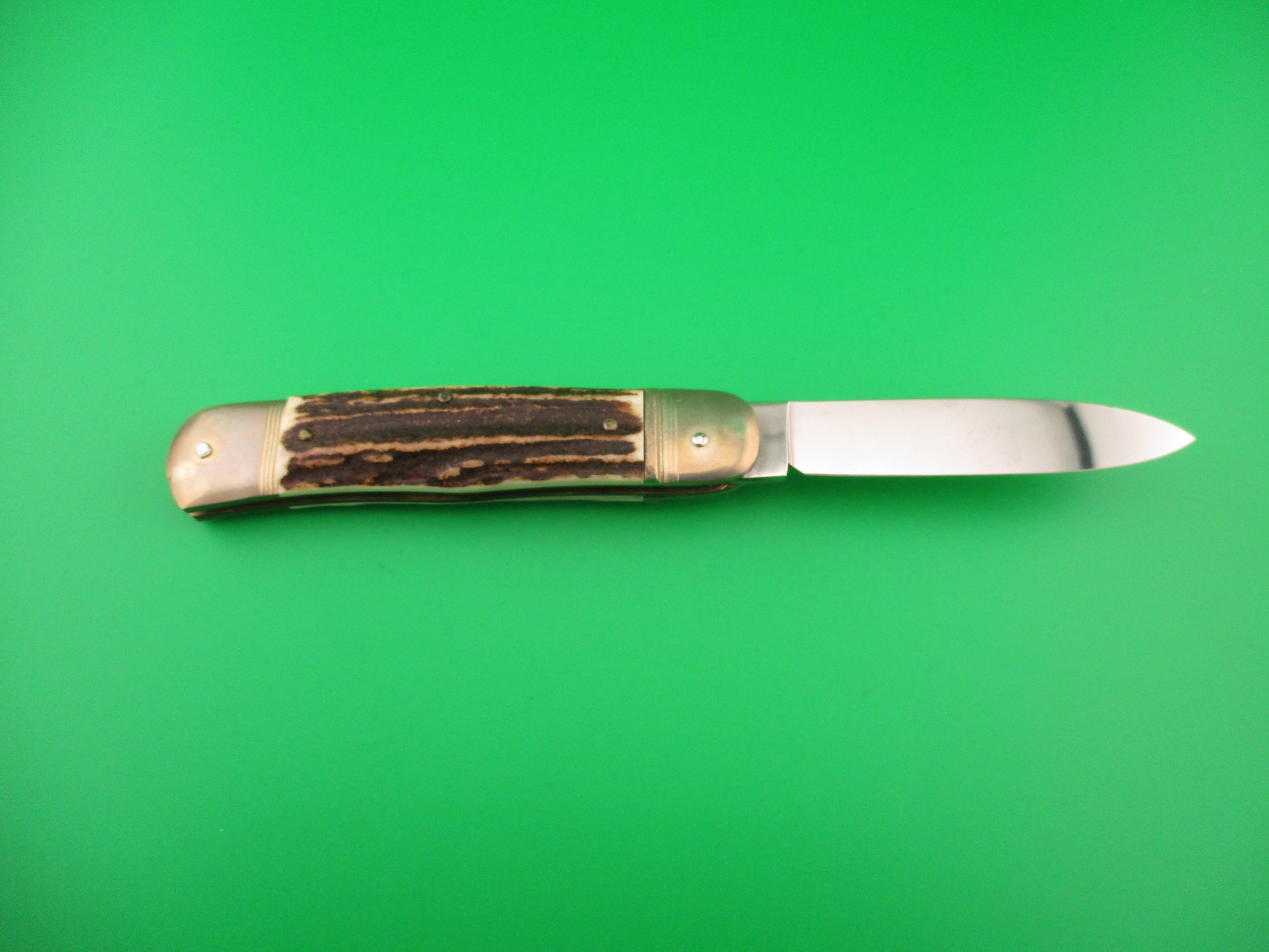 Vintage HUBERTUS SOLINGEN 11cm German Lever Stag automatic knife made in West Germany before 1989. This knife measures 11.2cm (4 3/8 inches) closed and 19.6cm (7.75 inches) with blade open with brass liners and German silver bolsters and lever. Spear point blade is 100% full with original finish and is etched HUBERTUS SOLINGEN ROSTFREI GESCHMIEDET W-GERMANY with nail nick. Stag scales are in excellent condition and held on by brass pins. The knife works great with blade tip deep and centered, STRONG snap and TIGHT lockup! Nearly New condition.