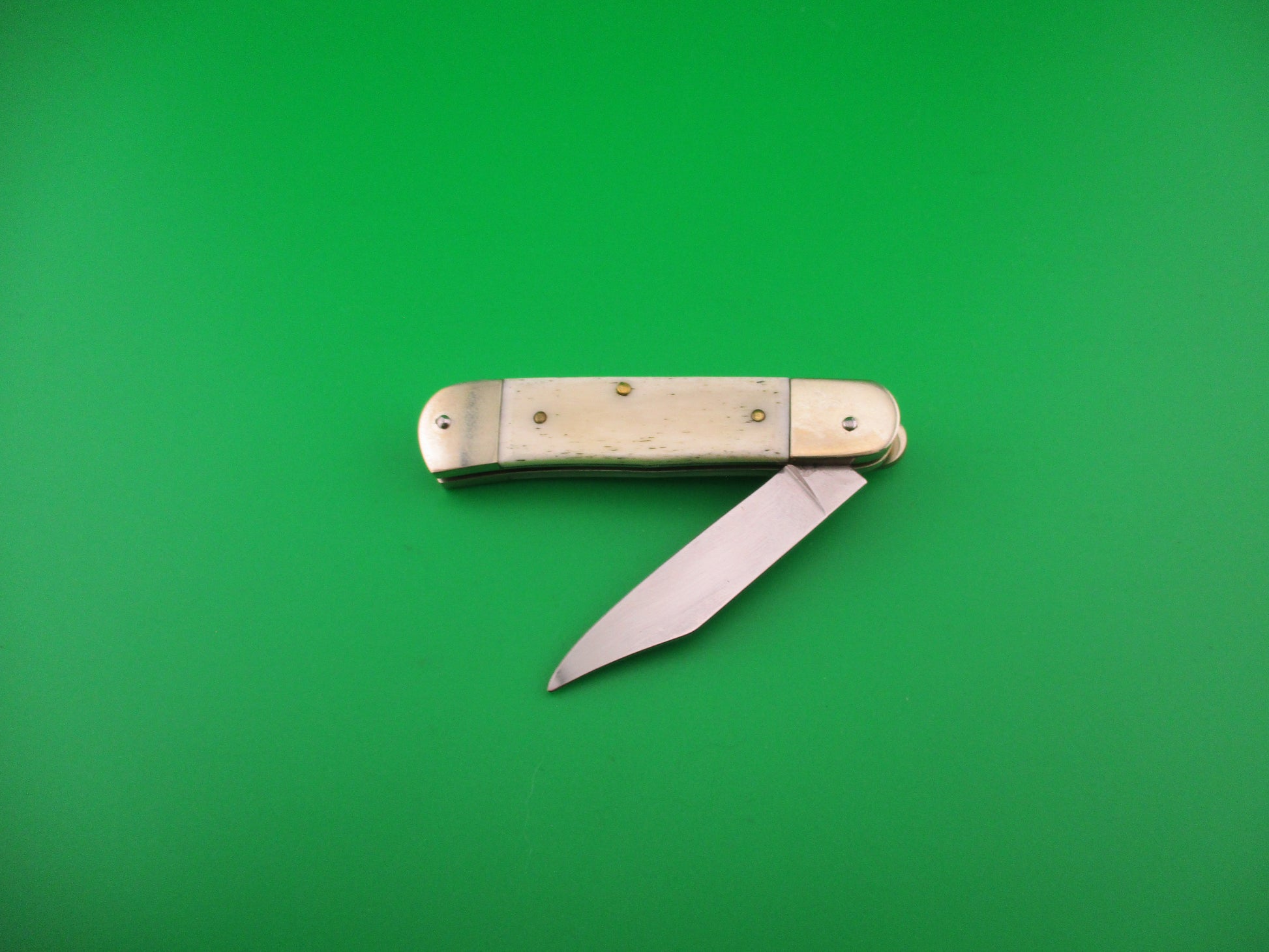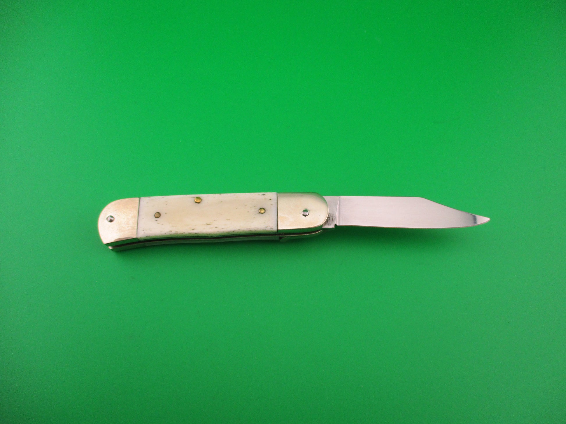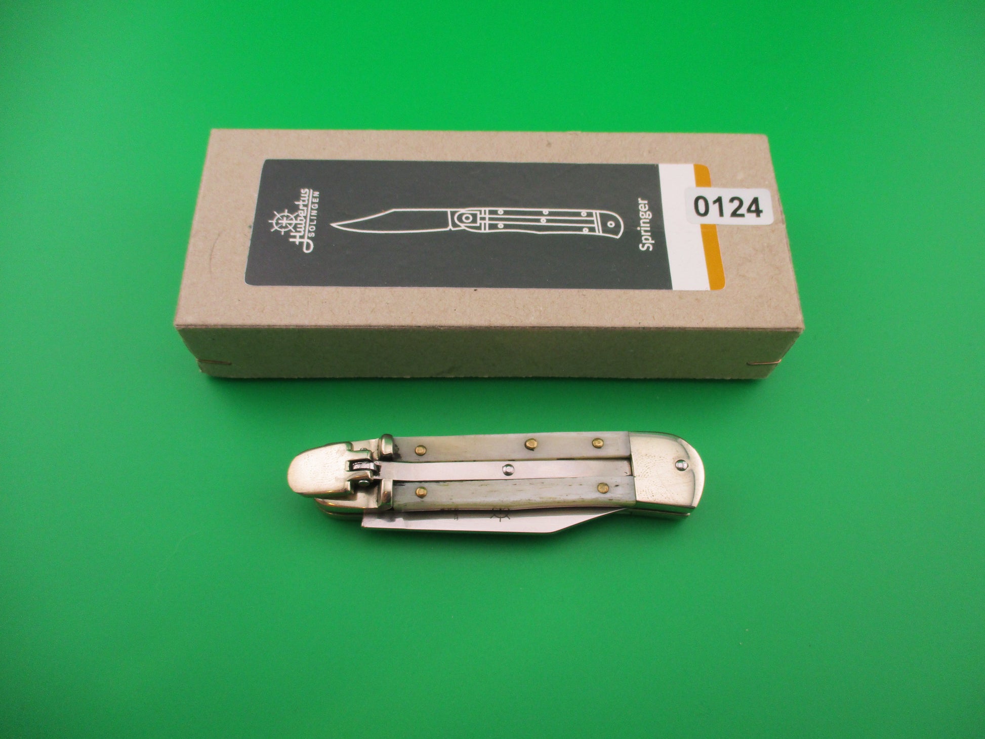 Vintage Hubertus Solingen 8cm German Lever Liliput Smooth Bone automatic knife made by Otter in recent years. It measures 8.6cm (3 3/8 inches) closed and 14.6cm (5 13/16 inches) open with brass liners and German silver (nickel silver) bolsters and lever. The clip style blade is 100% full and is etched HUBERTUS SOLINGEN ROSTFREI GESCHMIEDET GERMANY, so it was made after 1989. The light bone scales (handles) are in excellent condition with no cracks. The knife works great with the blade tip deep and centered in the well closed, good snap and very good lockup with about 1/16" down at the tip that springs back when you let go. Does not rattle if shaken with blade open. These were often called the "Liliput" and are the smallest of the standard Hubertus lever knives. Great EDC! EX+ condition in original box.