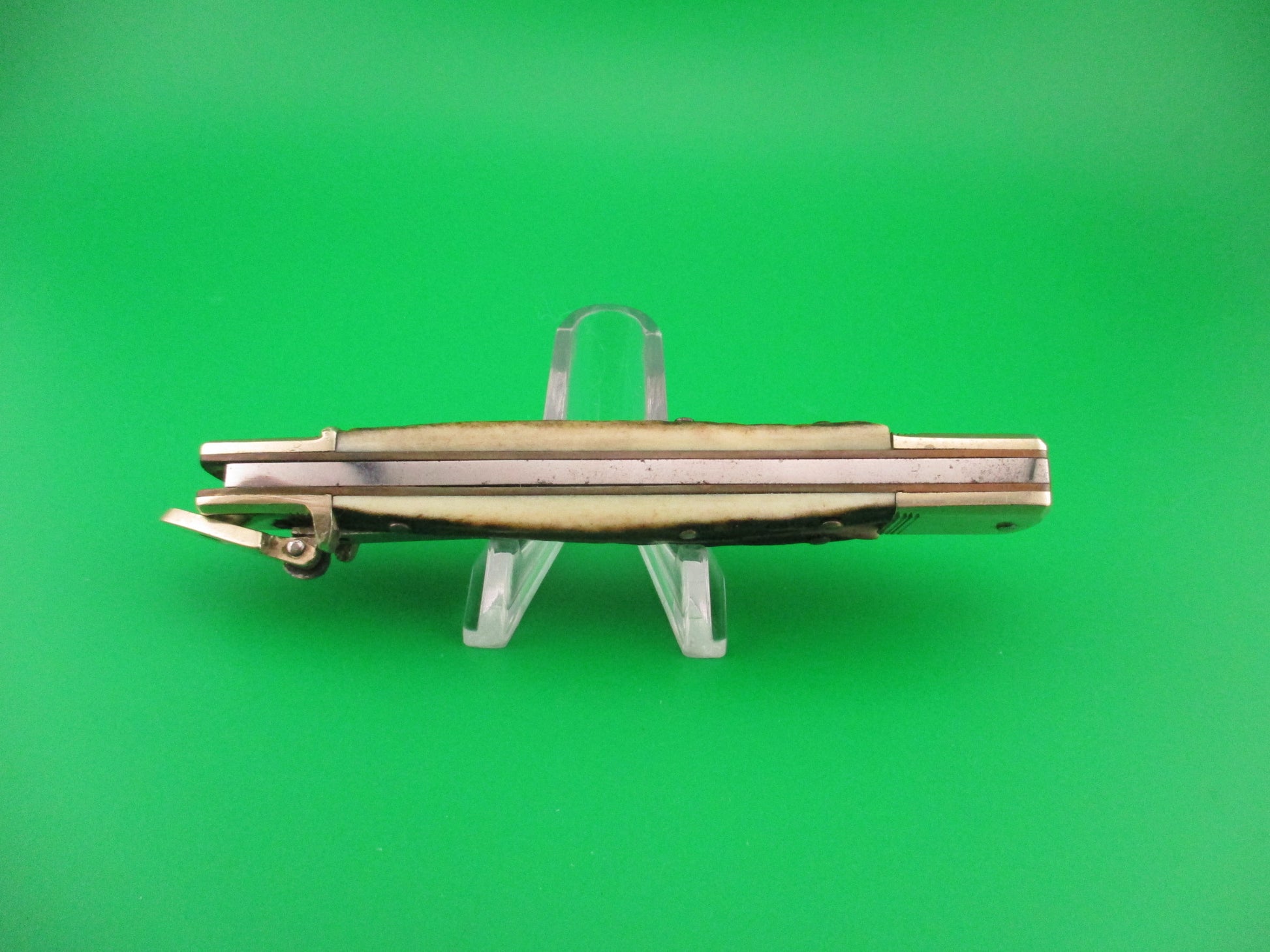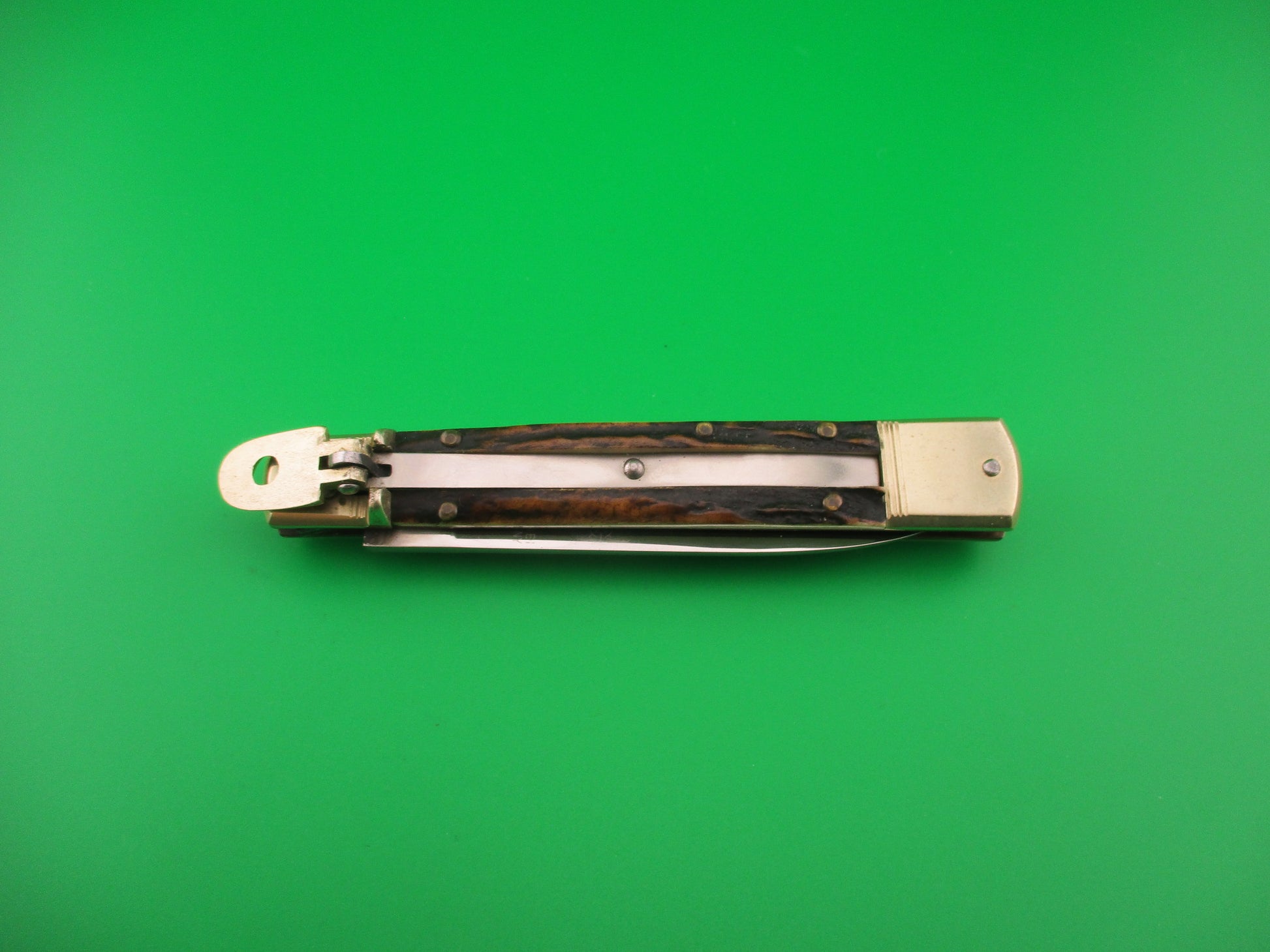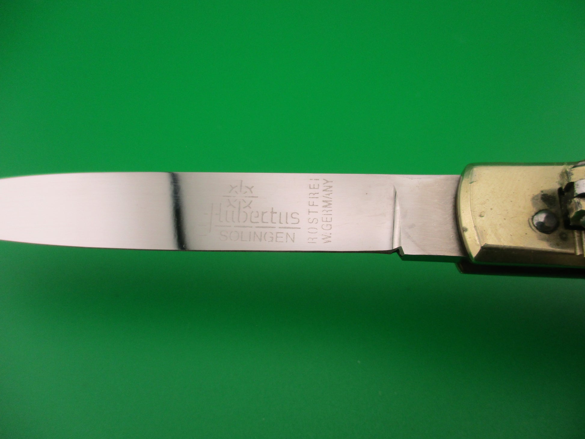 Vintage HUBERTUS SOLINGEN ROSTFREI 11cm West German Slimline Lever STag automatic knife made before 1989 in West Germany. These German knives are most often referred to by their length closed in cm, rounded down. The knife measures 11.3cm (4 3/8 inches) closed and 19.8cm (7 13/16 inches) open with brass liners & pins and nickel silver bolsters & lever. The spear point blade is 100% full with original finish and etch that reads Hubertus SOLINGEN ROSTFREI W GERMANY. The Stag scales are in great condition. The knife works well with blade tip deep and centered closed. Strong snap and TIGHT lockup open. No rattle. EX+ condition.