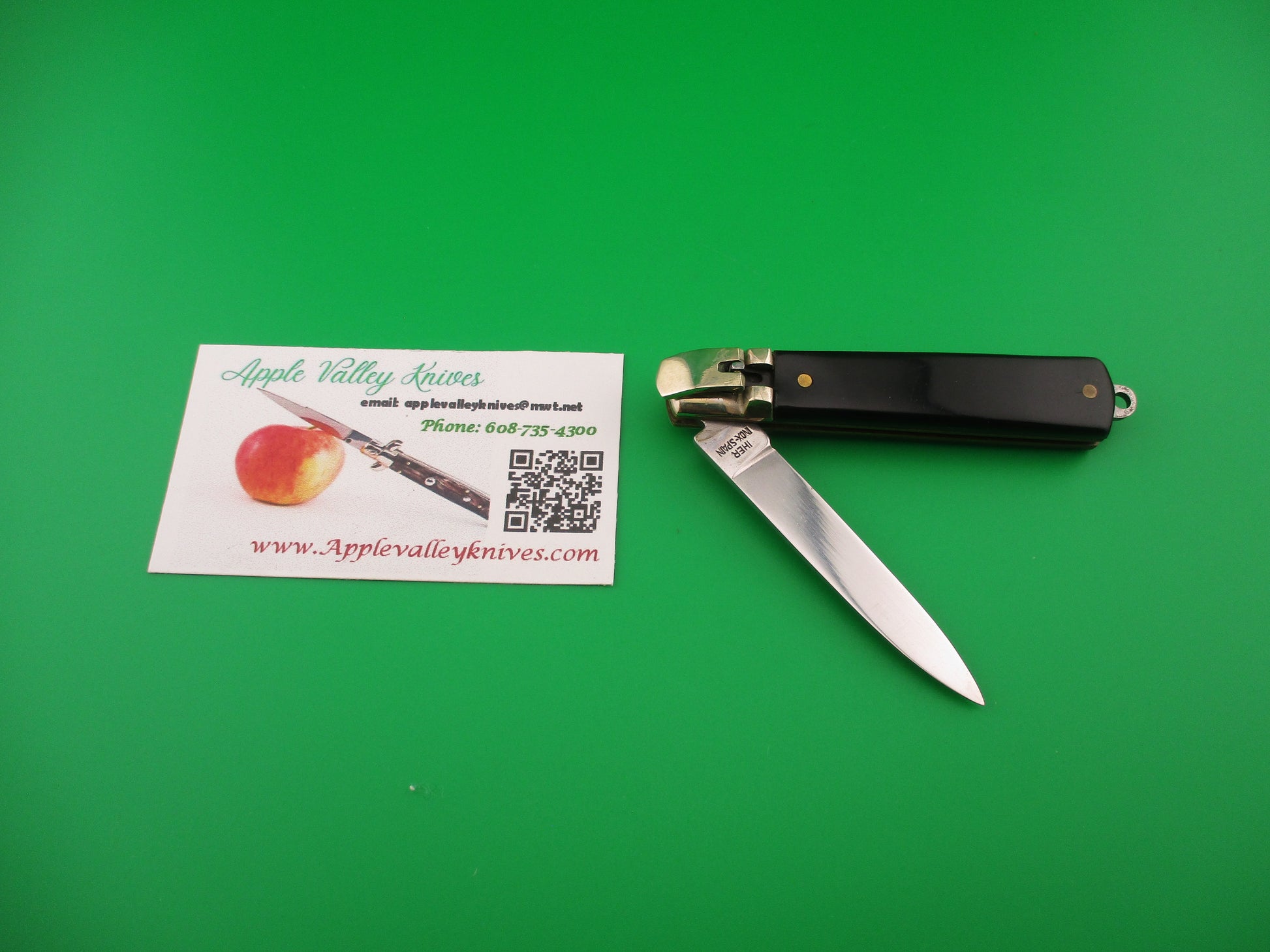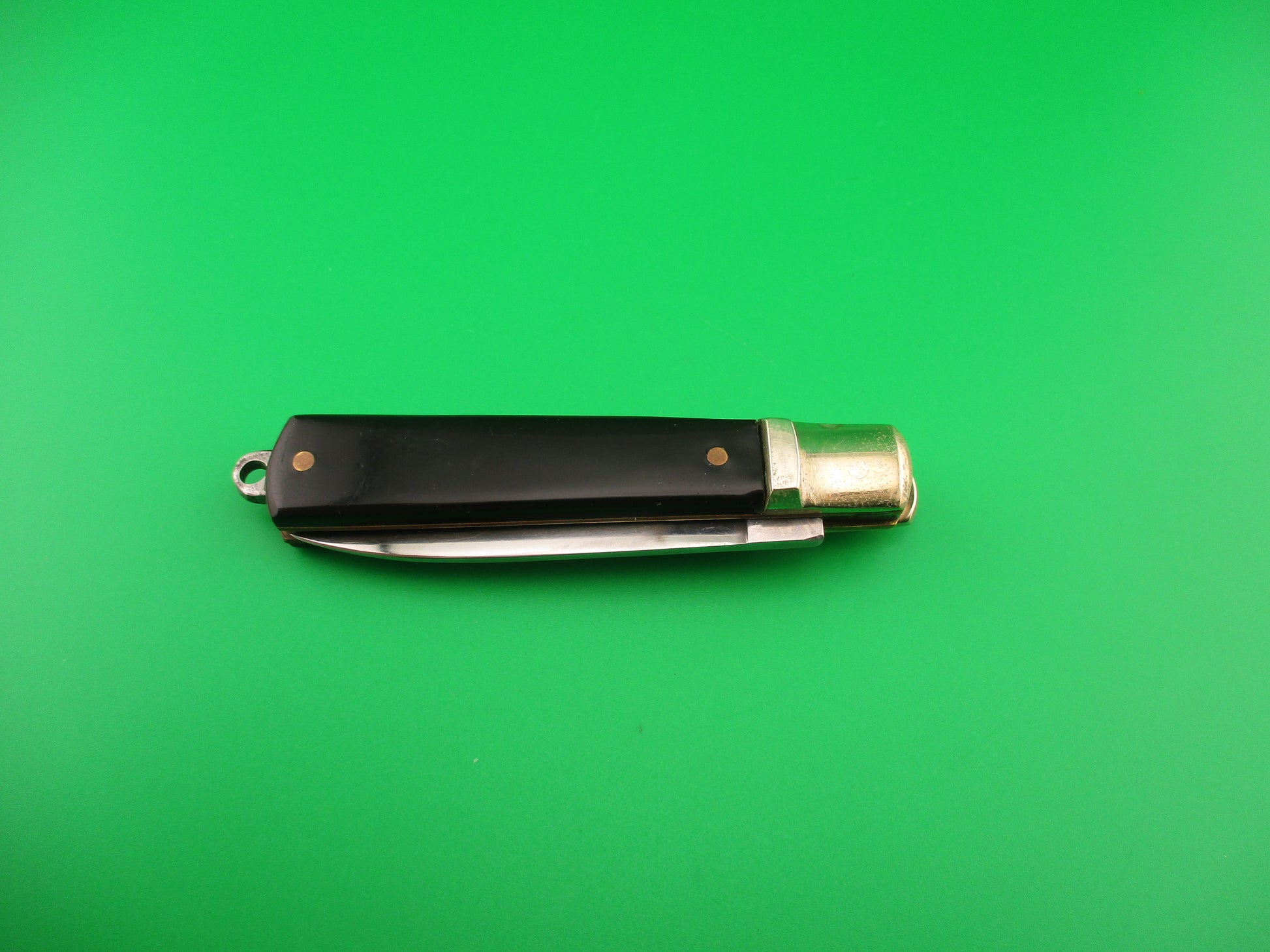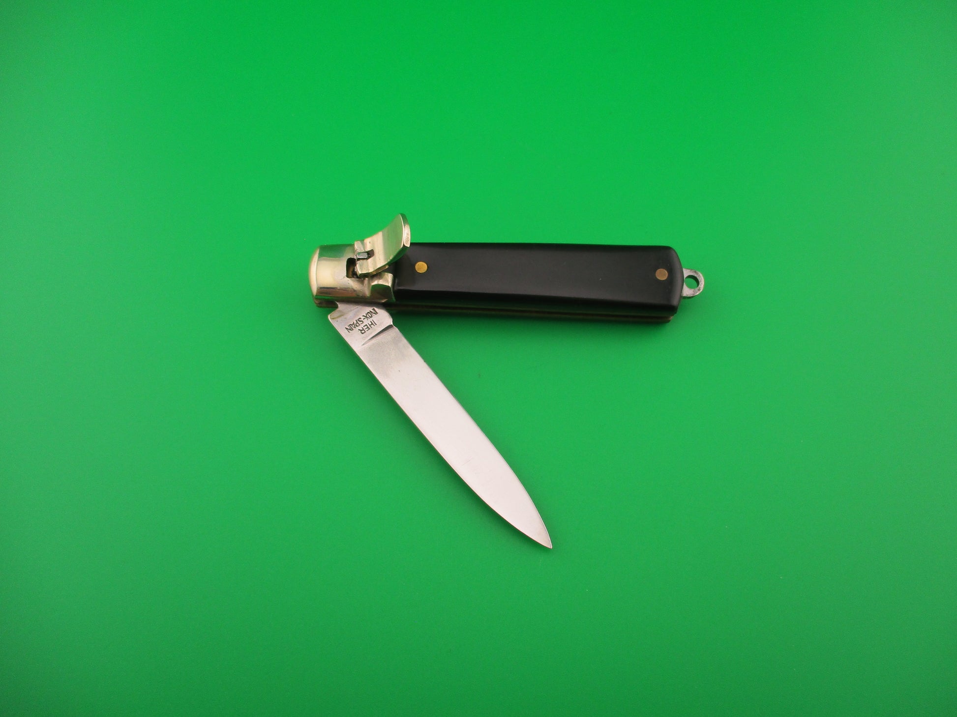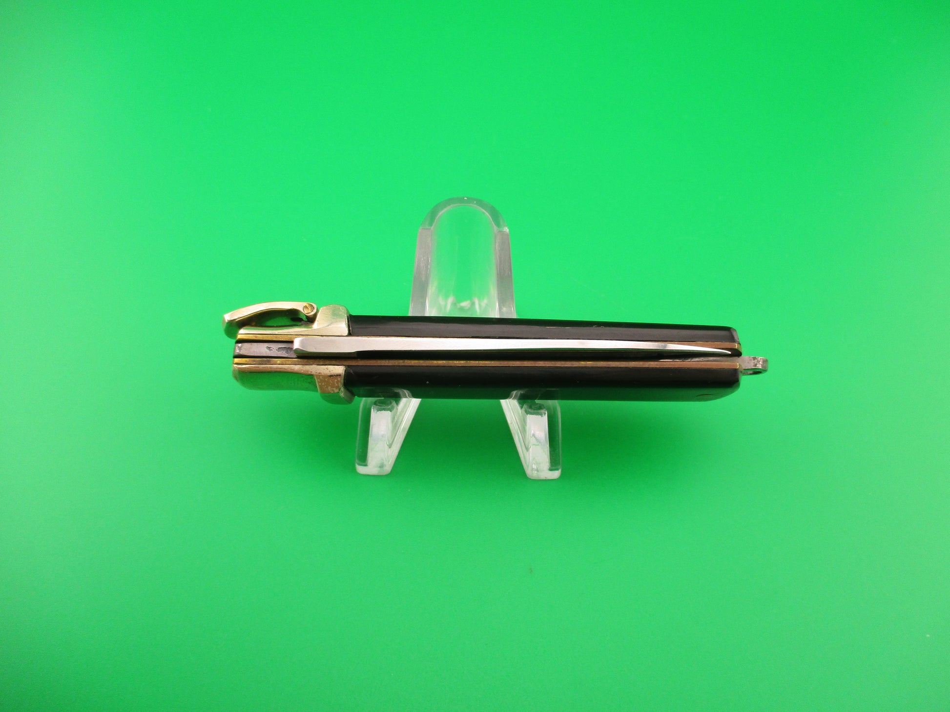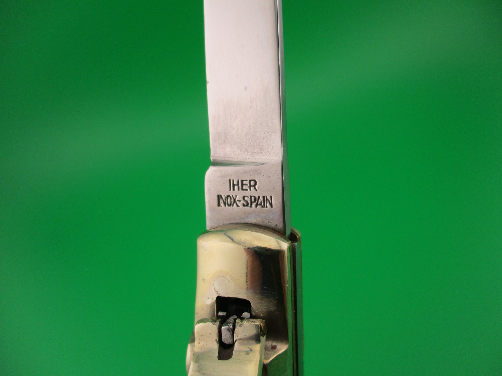 IHER INOX SPAIN 15cm Spanish Lever Vintage black automatic knife made in 1960s or 70s measures 15cm (5 15/16 inches) open and 3.25 inches closed (not including the lanyard hole) with brass liners and nickel silver bolsters & lever. The flat spear point blade is 99% full or better with original finish and the ricasso is stamped IHER INOX SPAIN. The black synthetic scales (handles) are in excellent condition and held on by brass pins. The knife works well with the blade tip below liners closed, STRONG snap and tight lockup open. EX+ condition.