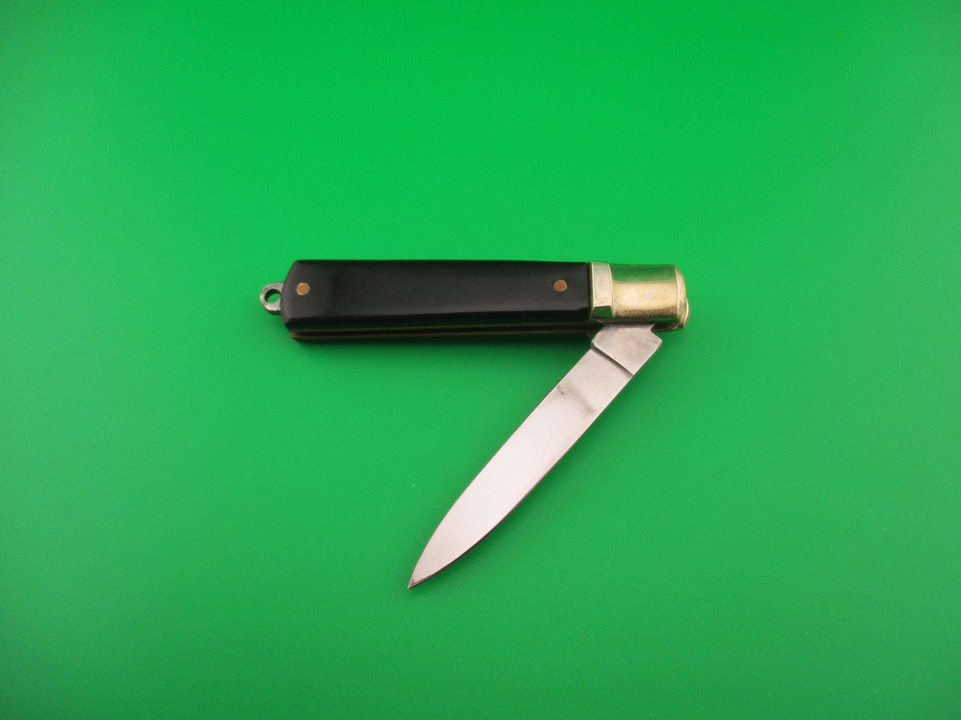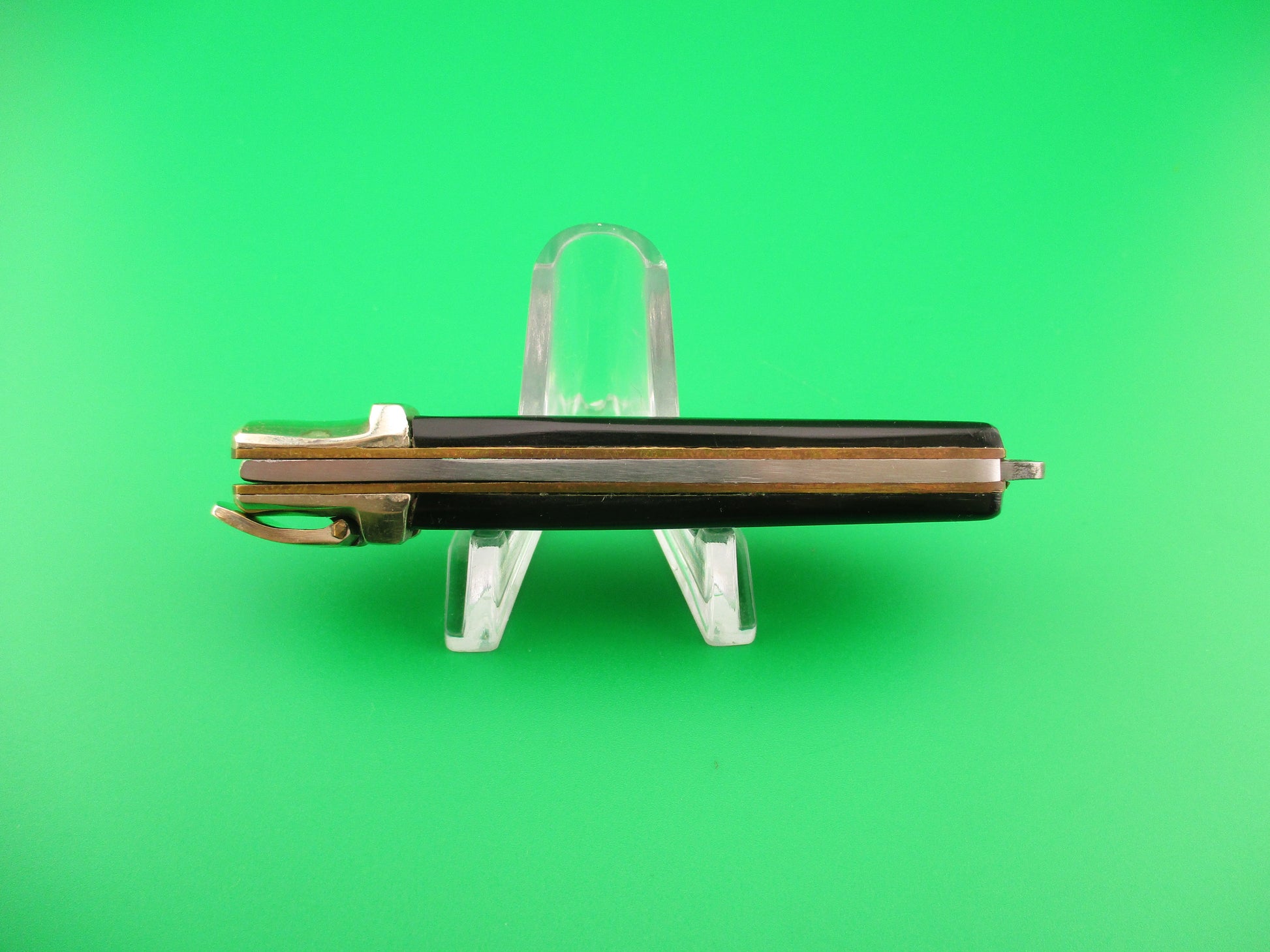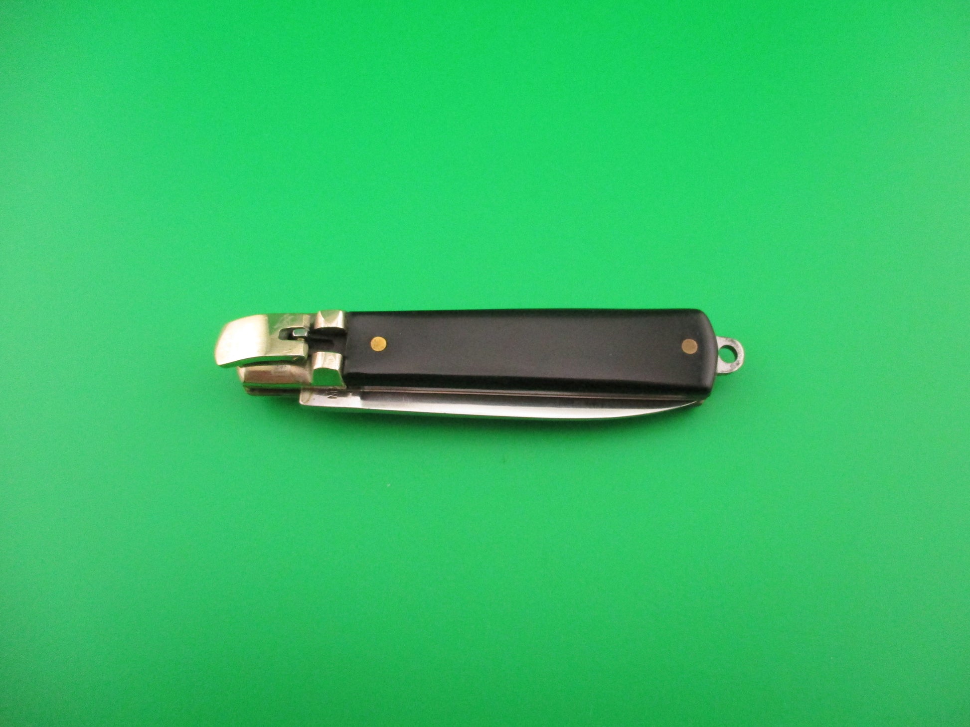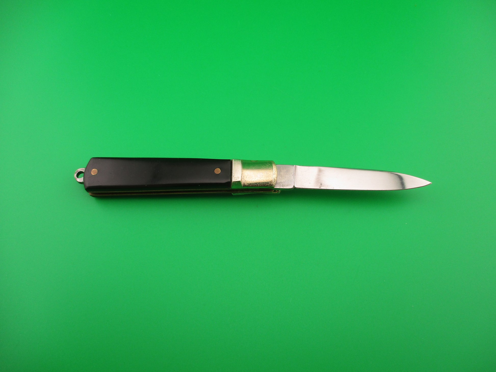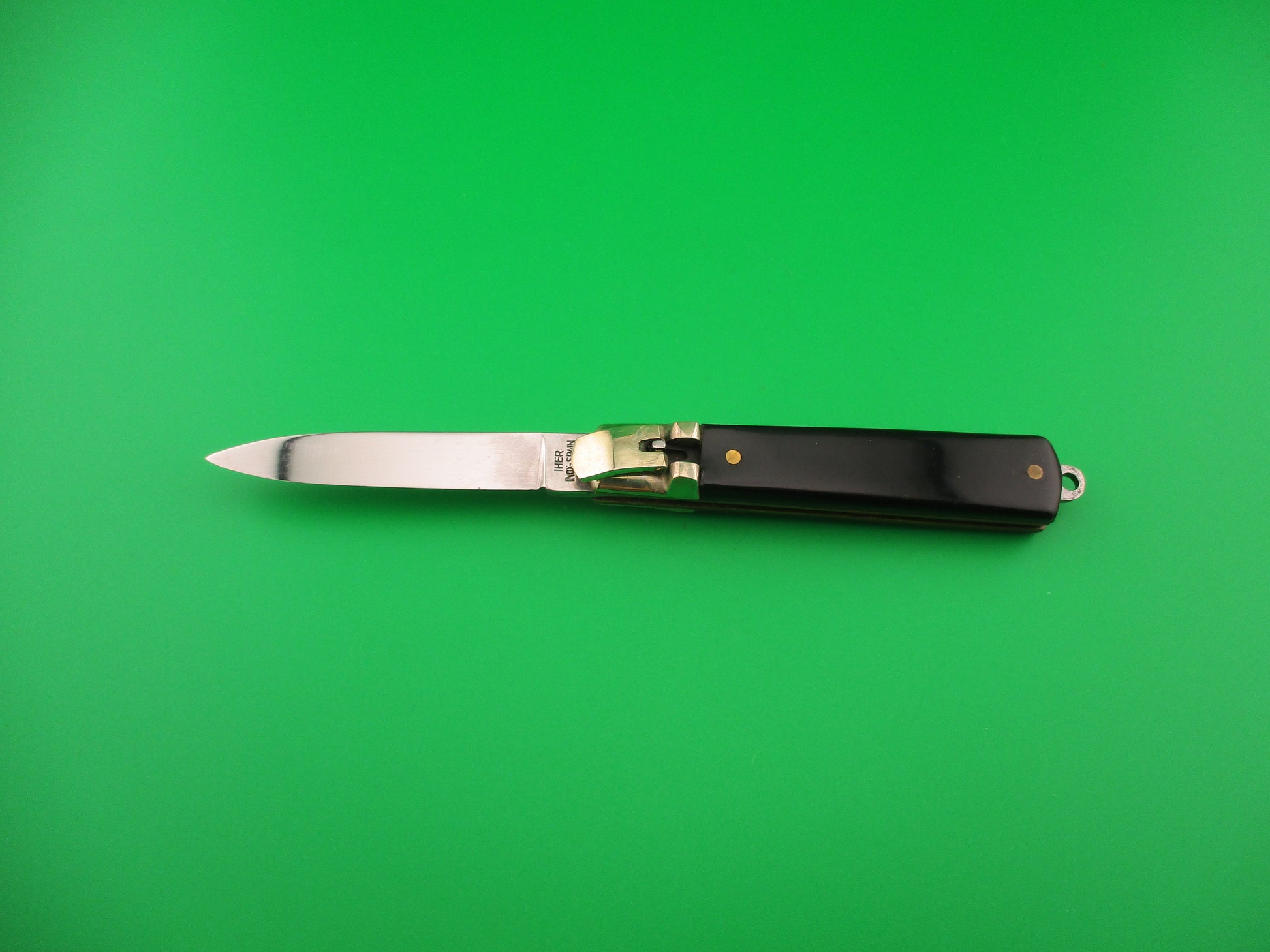 IHER INOX SPAIN 15cm Spanish Lever Vintage black automatic knife made in 1960s or 70s measures 15cm (5 15/16 inches) open and 3.25 inches closed (not including the lanyard hole) with brass liners and nickel silver bolsters & lever. The flat spear point blade is 99% full or better with original finish and the ricasso is stamped IHER INOX SPAIN. The black synthetic scales (handles) are in excellent condition and held on by brass pins. The knife works well with the blade tip below liners closed, STRONG snap and tight lockup open. EX+ condition.
