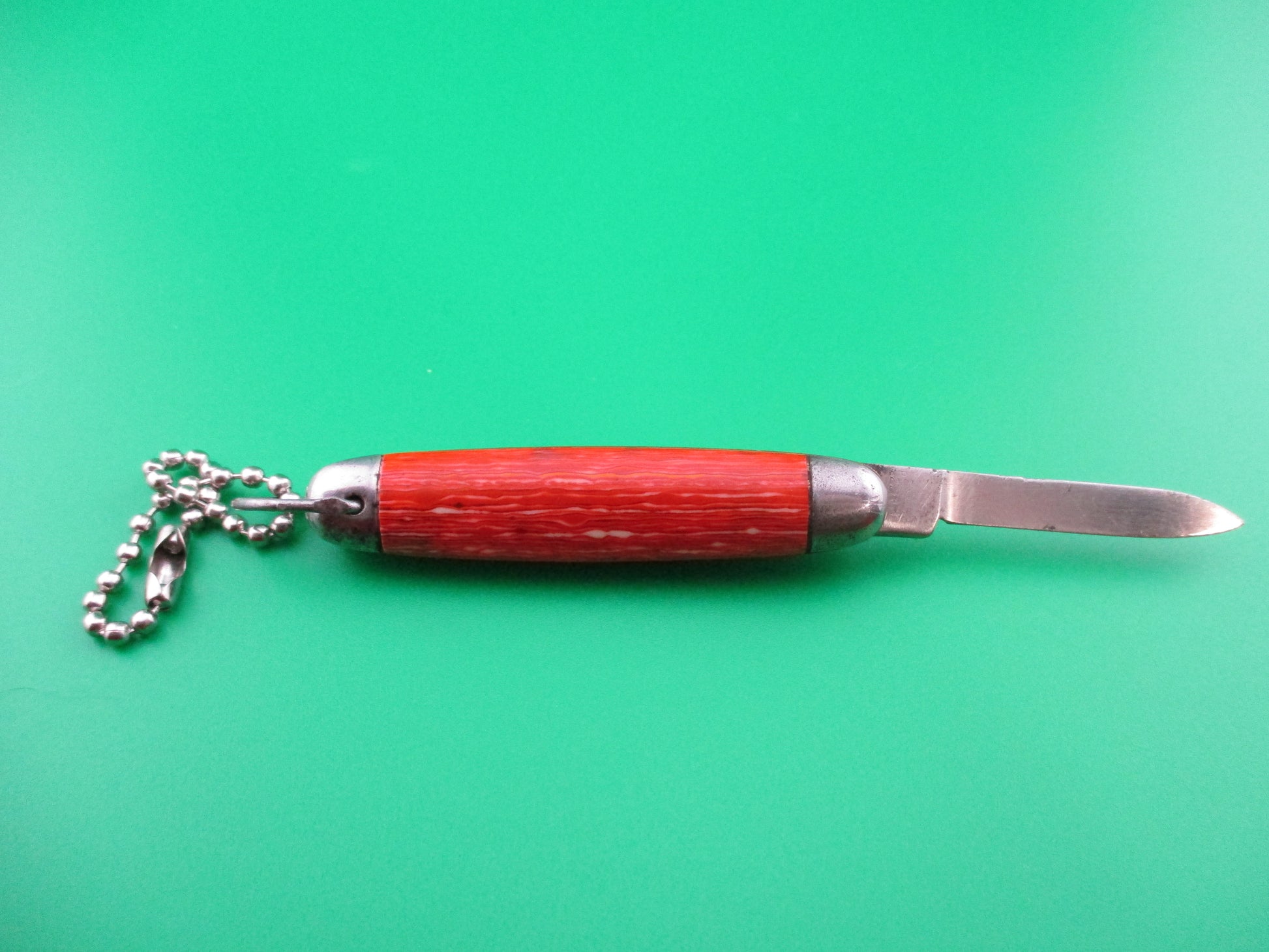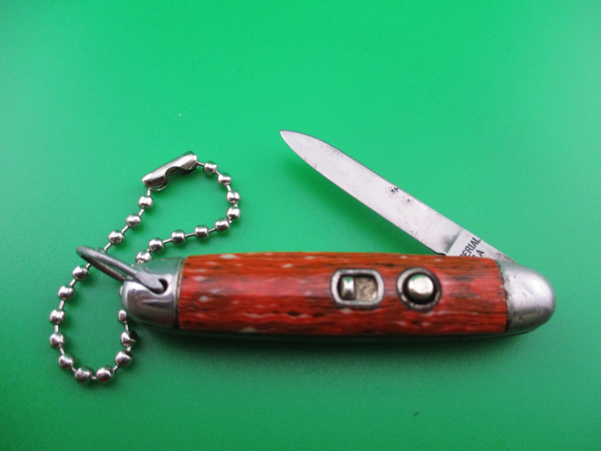 Cute little 1950s Imperial keychain switchblade with Firebrick celluloid wrapped handles. The knife was made by the Imperial Knife Co of Providence, RI in the 50s and was designated the model JM96PB. It came with a beaded chain to attach keys, etc. The knife measures 2.25 inches closed and 3.75 inches open with brass liners. The blade is stamped IMPERIAL USA with two patent numbers on the back. The blade is nearly full with some patina, scratches and a little scattered pitting, but good overall. The Firebrick celluloid scales are in very nice condition. The knife works well with the blade tip just below the liners, opens fully and average lockup. Safety does not work. These are much harder to find in these more interesting colors made in the early 50s and a lot of fun to collect!