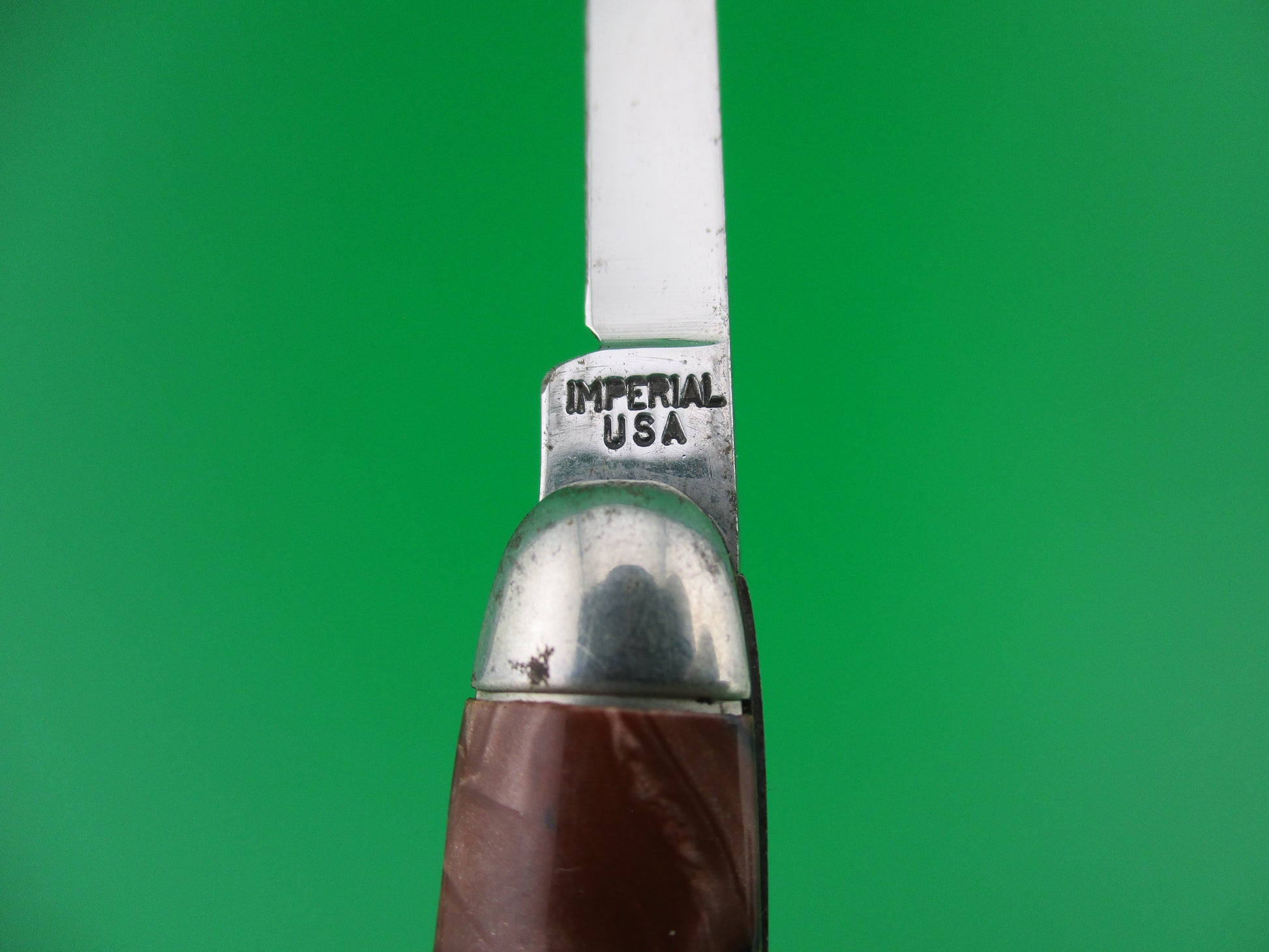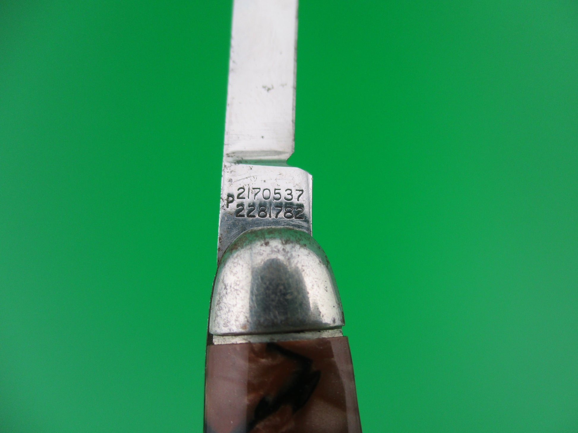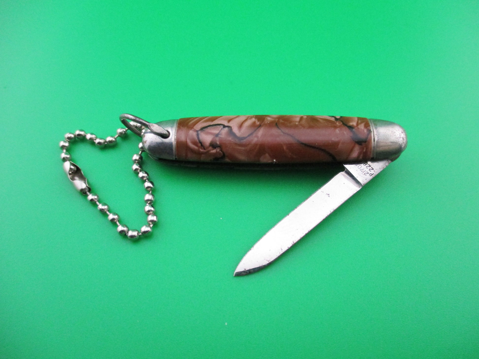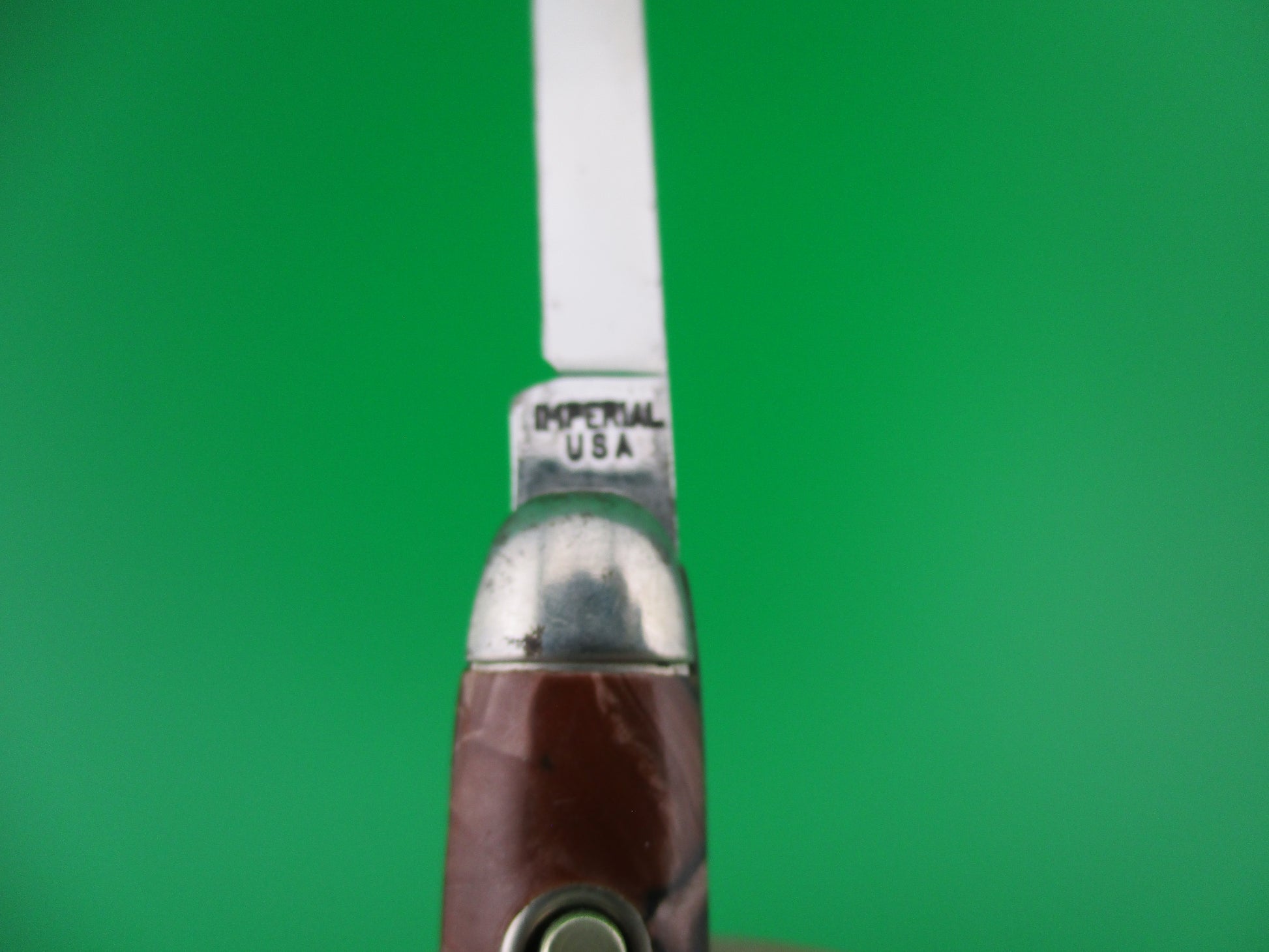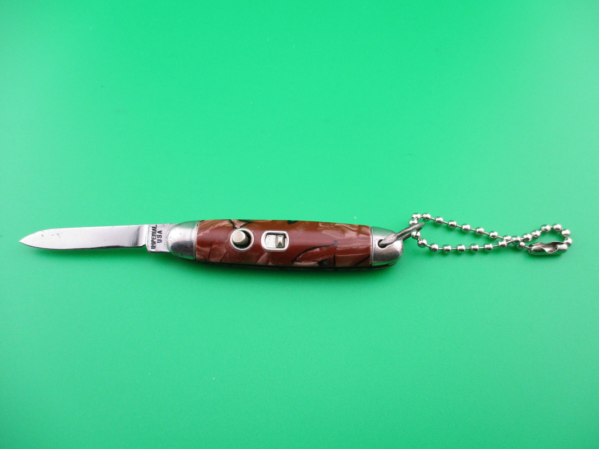 Vintage Imperial keychain switchblade with brown pearl & black mottled celluloid wrapped handles. The knife was made by the Imperial Knife Co of Providence, RI in the 1950s and was designated the model JM96PB. It came with a beaded chain on a shackle to attach keys, etc. The knife measures 2.25 inches closed and 3.75 inches open with brass liners. The blade is stamped IMPERIAL USA with two patent numbers on the back ending in 37 & 82. The blade is full with original factory finish and a few light scratches. The brown/black mottled celluloid scales are in great shape with minimal shrinkage. The knife works well with the blade tip seated deep, opens strong, but kicks back as most do, locks open well. Would look great on a reproduction display card. Safety does work. EX+ condition.