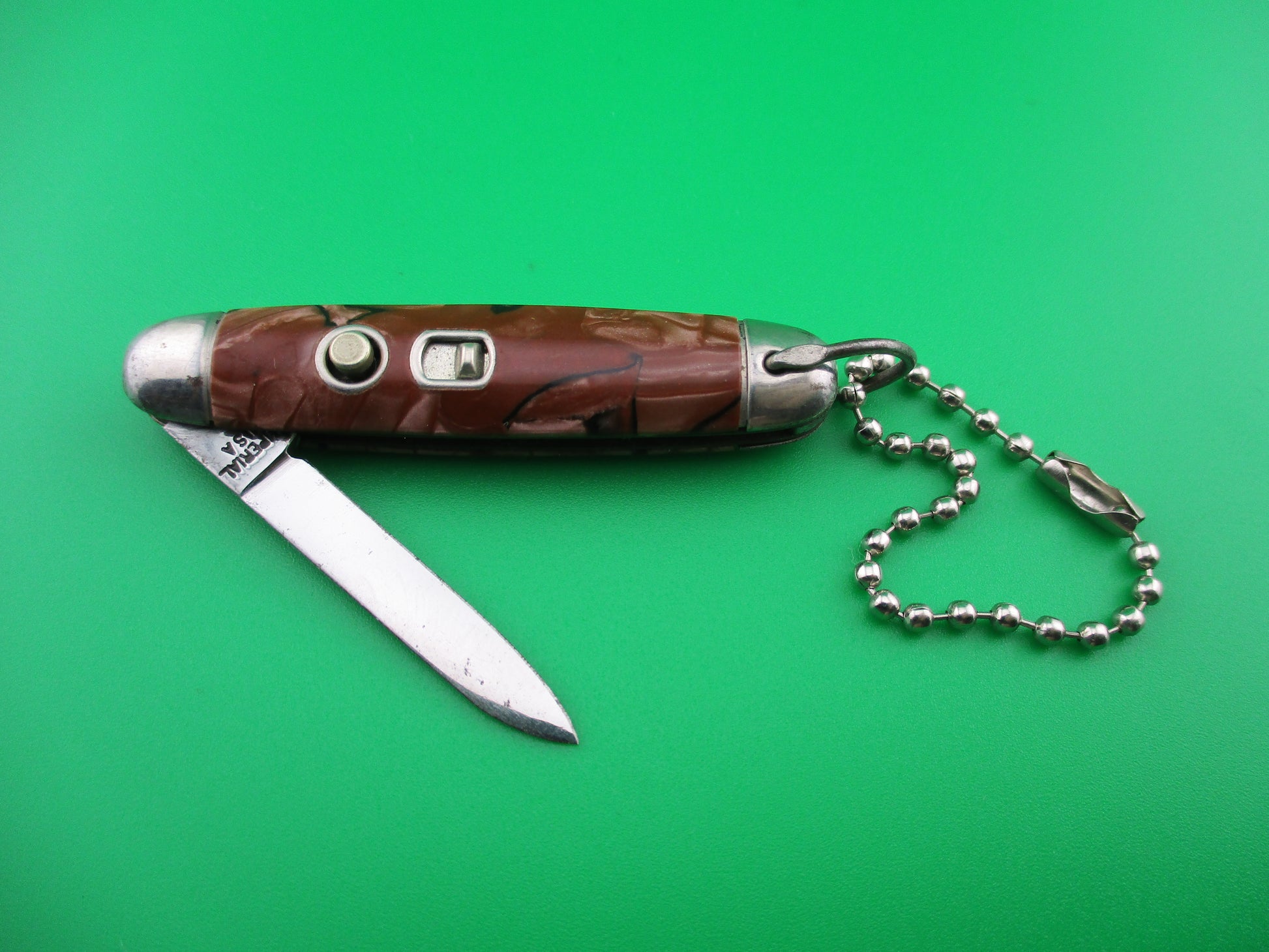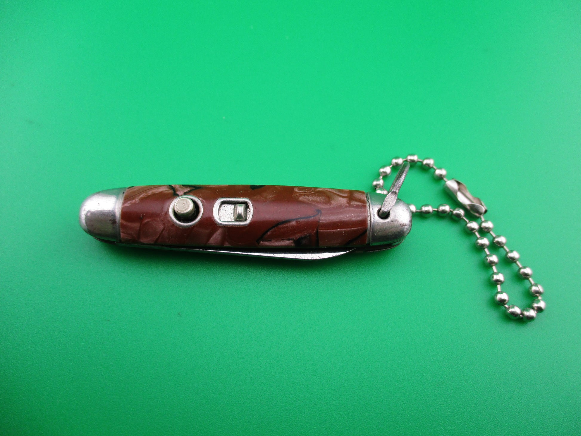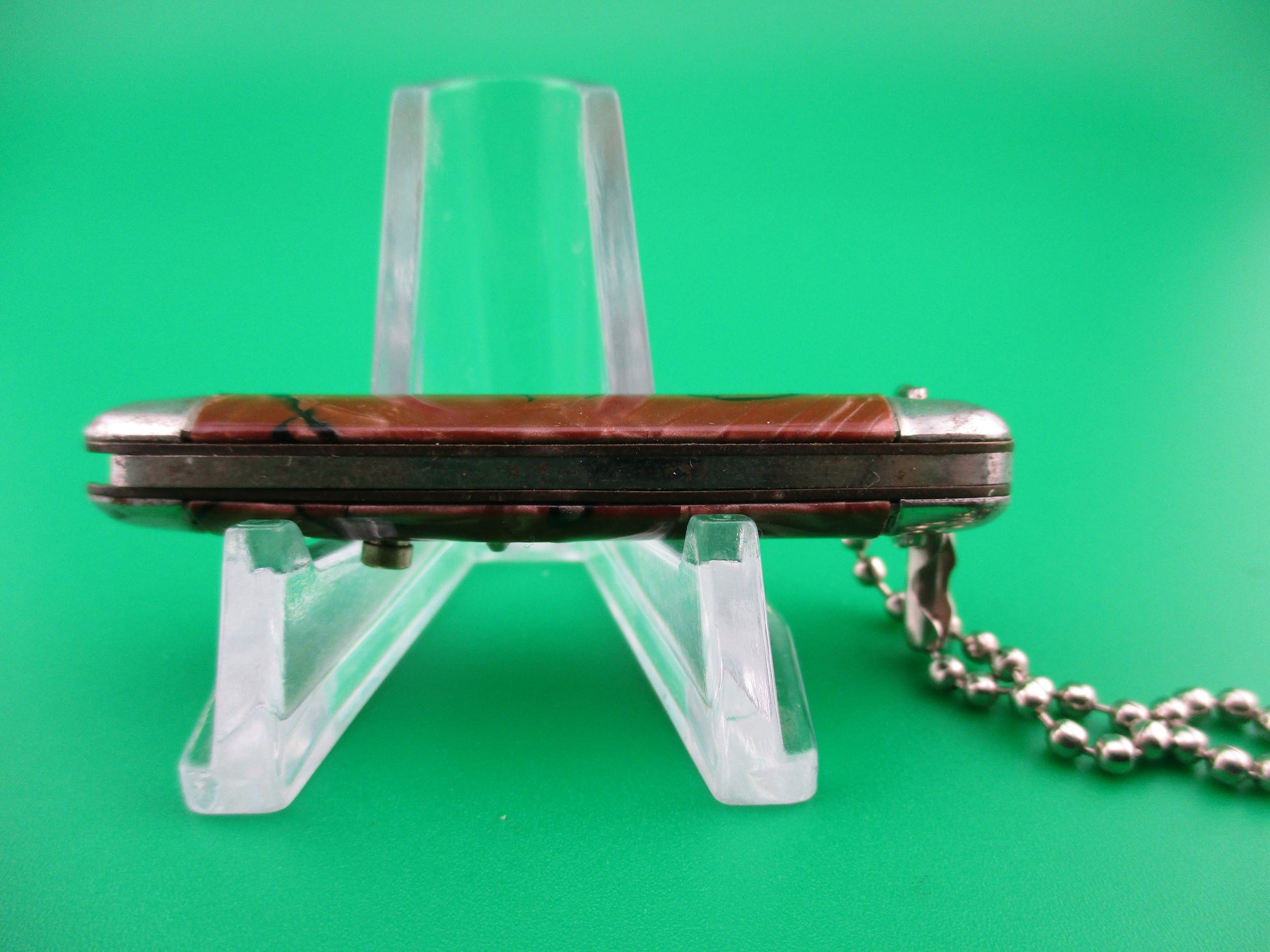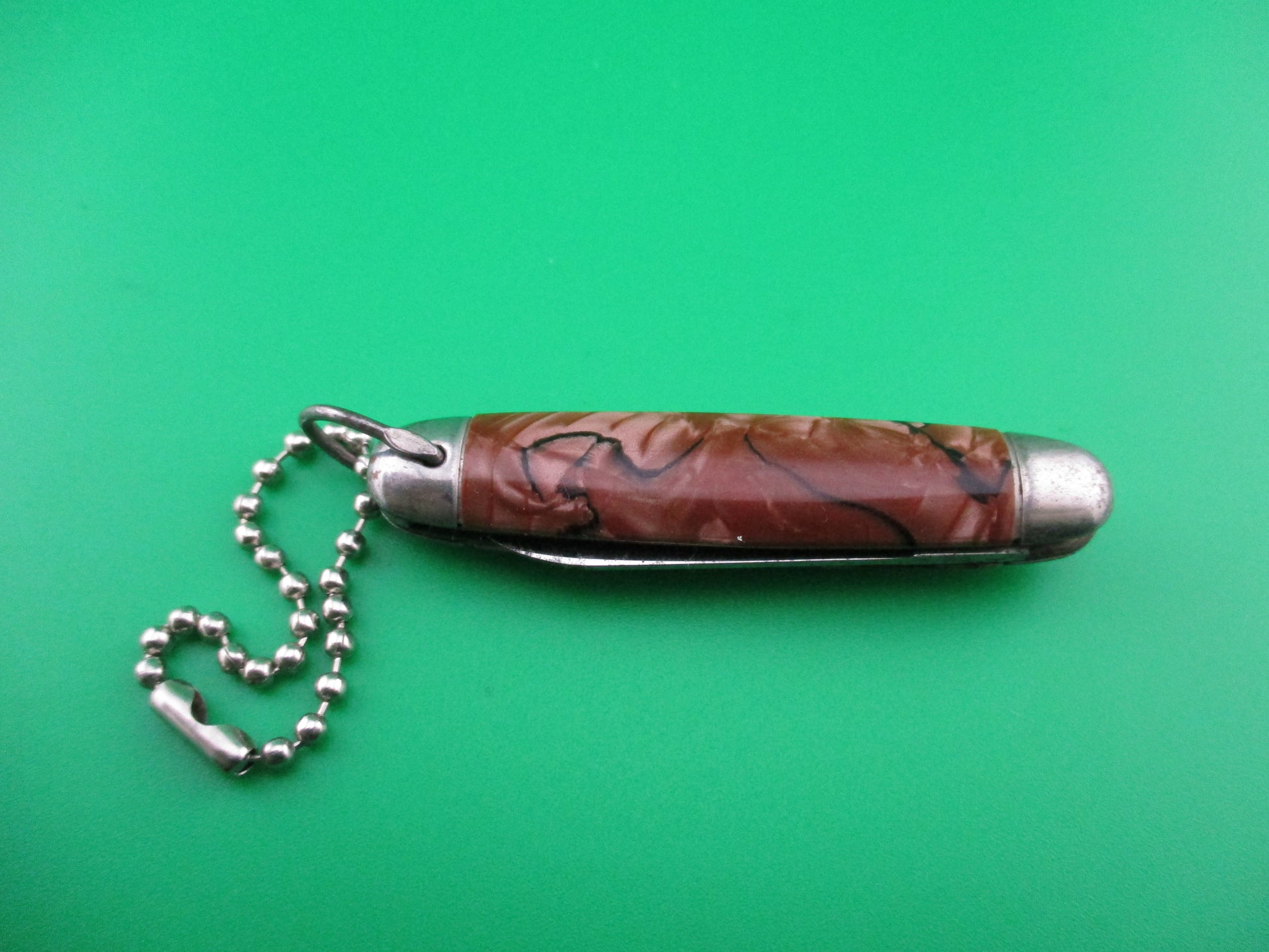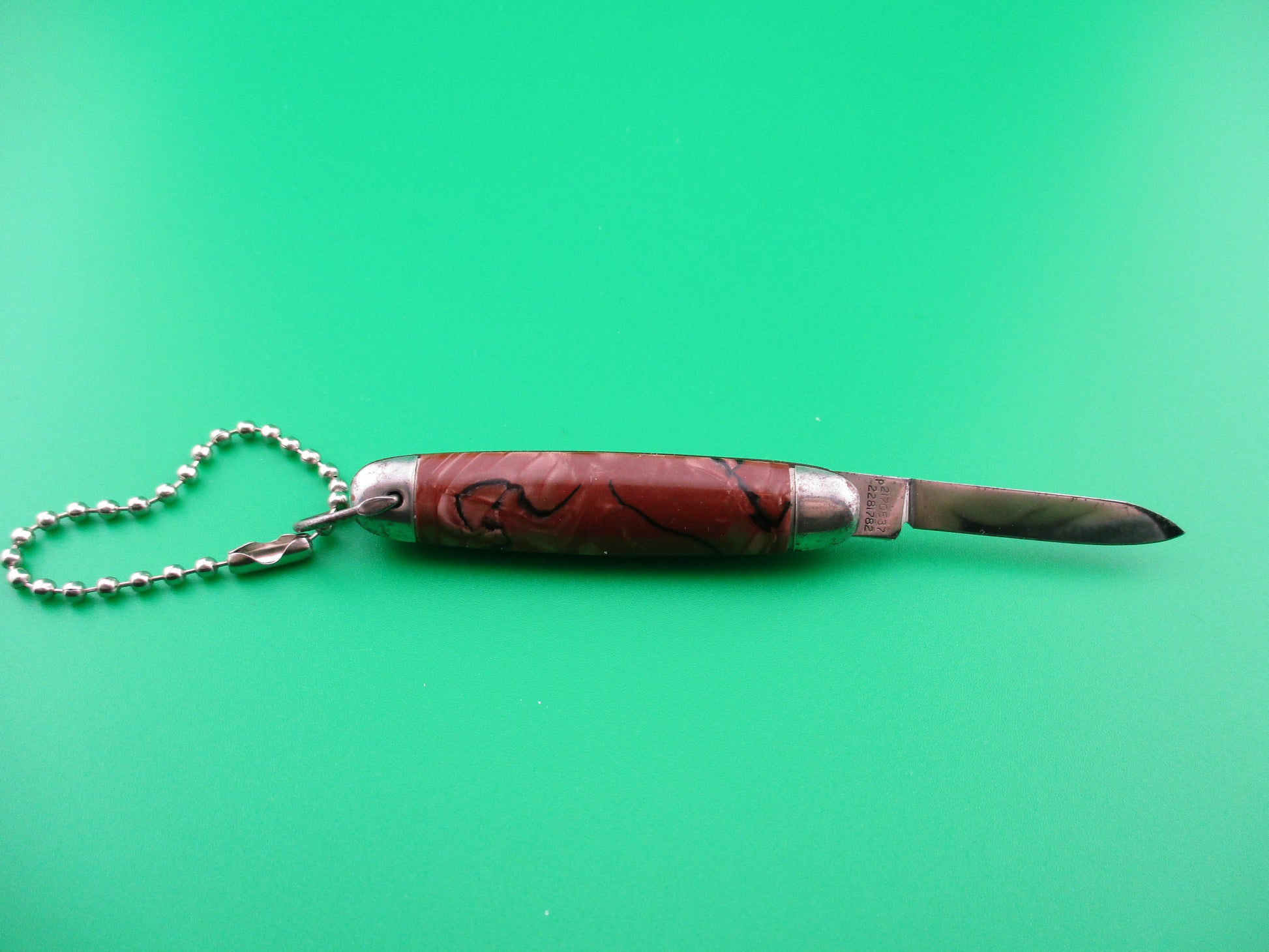 Vintage Imperial keychain switchblade with brown pearl & black mottled celluloid wrapped handles. The knife was made by the Imperial Knife Co of Providence, RI in the 1950s and was designated the model JM96PB. It came with a beaded chain on a shackle to attach keys, etc. The knife measures 2.25 inches closed and 3.75 inches open with brass liners. The blade is stamped IMPERIAL USA with two patent numbers on the back ending in 37 & 82. The blade is full with original factory finish and a few light scratches. The brown/black mottled celluloid scales are in great shape with minimal shrinkage. The knife works well with the blade tip seated deep, opens strong, but kicks back as most do, locks open well. Would look great on a reproduction display card. Safety does work. EX+ condition.