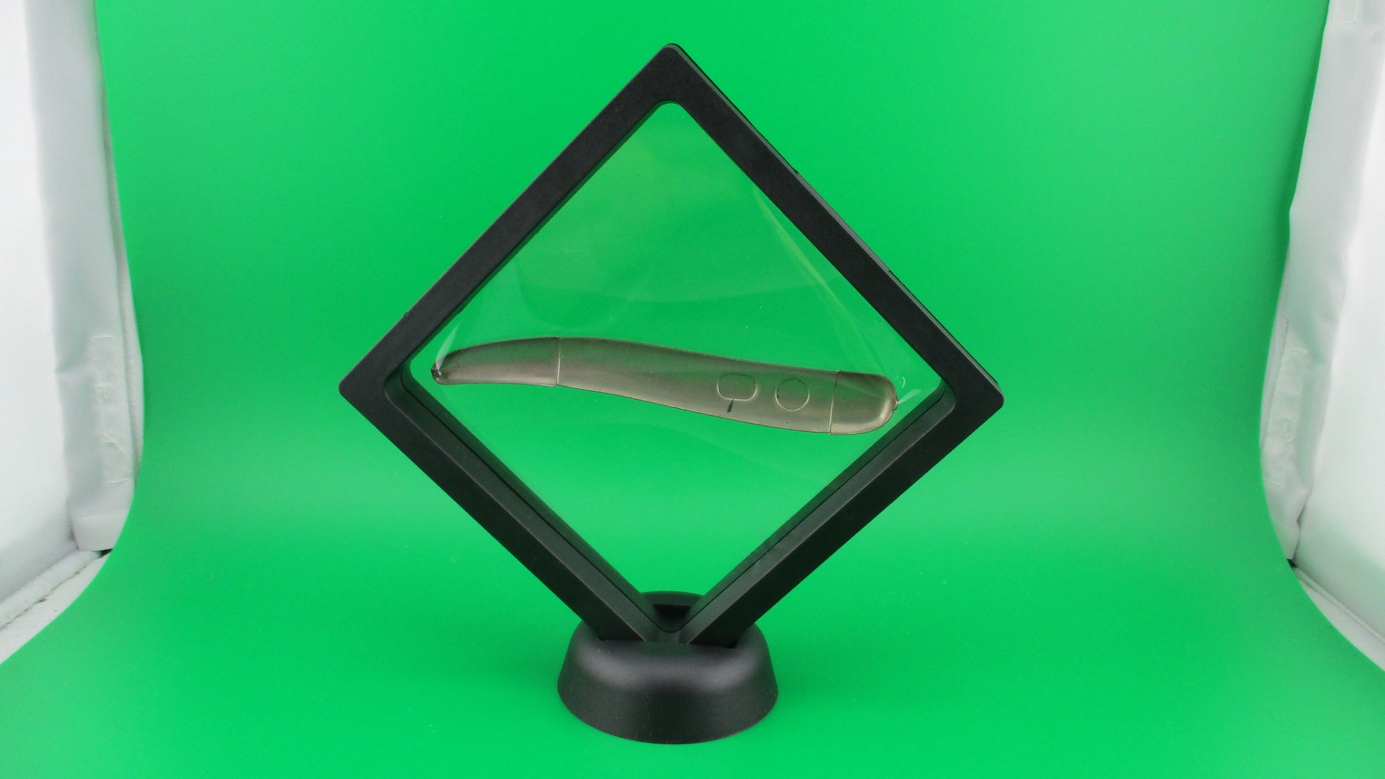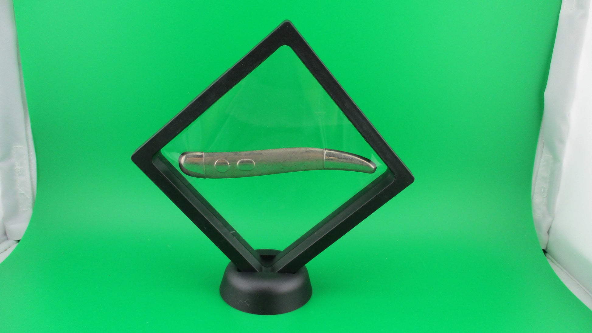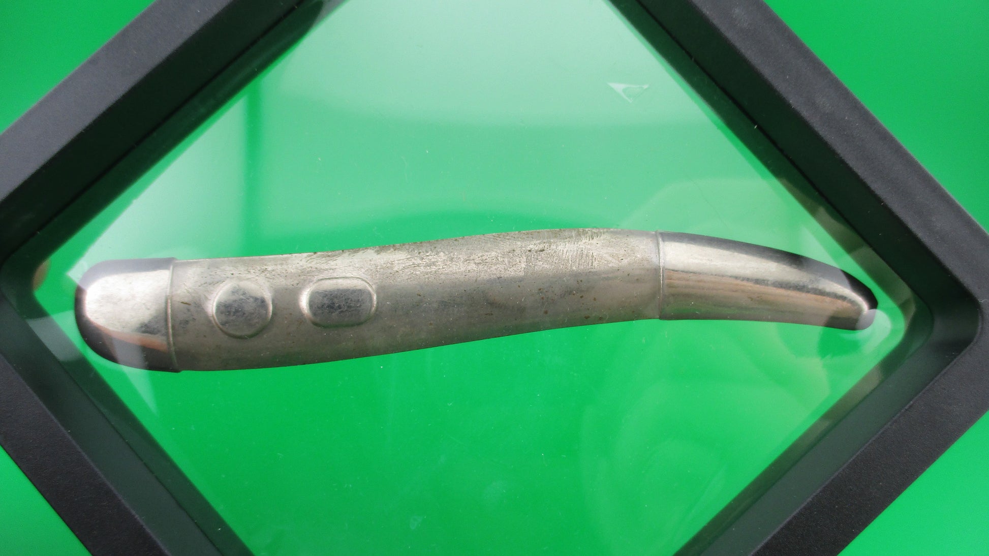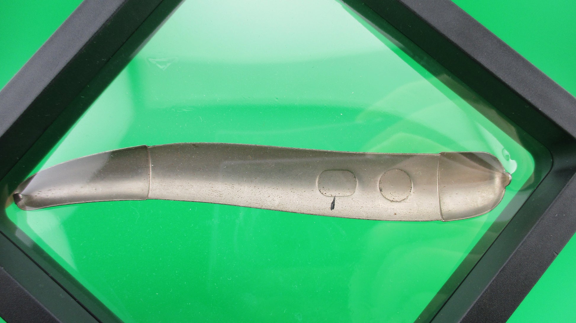 Imperial Knife Co Toothpick Switchblade front scale never finished factory piece. This never completed Imperial toothpick scale came from the Imperial factory along with many other pre production pieces likely from the R&D (research & development) department. I'm going to sell a few pieces from this factory find over time starting with this one. This front scale was compression formed, but never had the holes cut out for the button and safety. It comes in a suspension frame for display. This is something for those of us who really love the history of the knives and I guess for those who like to have unusual/uncommon items too. ;^) There were only a couple of these front scales in the lot and I'll probably keep one, but here's a chance for someone to own a piece of switchblade history.