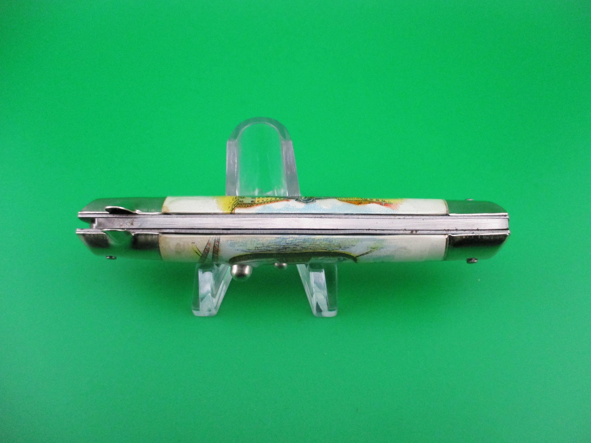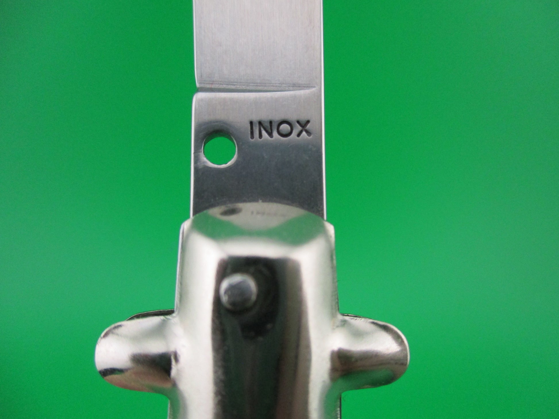 This is an Italian BOBC (button open, button close) knife marked INOX, commonly referred to as a "card knife" due to the fact that they were often sold to tourists off of display cards that held 4 or more knives. I believe that they were made mostly in the 1960s and 70s. The knife measures 17.5cm open (7 inches) and has steel liners. The flat grind clip swedge blade is stamped INOX and is full with the original factory finish intact. The handles are hollow steel with wraps featuring a bridge on the back side and a gondola on the front and are in very nice condition. The knife works well with the blade tip seating deep in the well closed, good snap and tight lockup. Does take a Firm press on the button to get it to open fully. Nice little Venice Italy tourist switchblade. Safety works. Near mint condition.